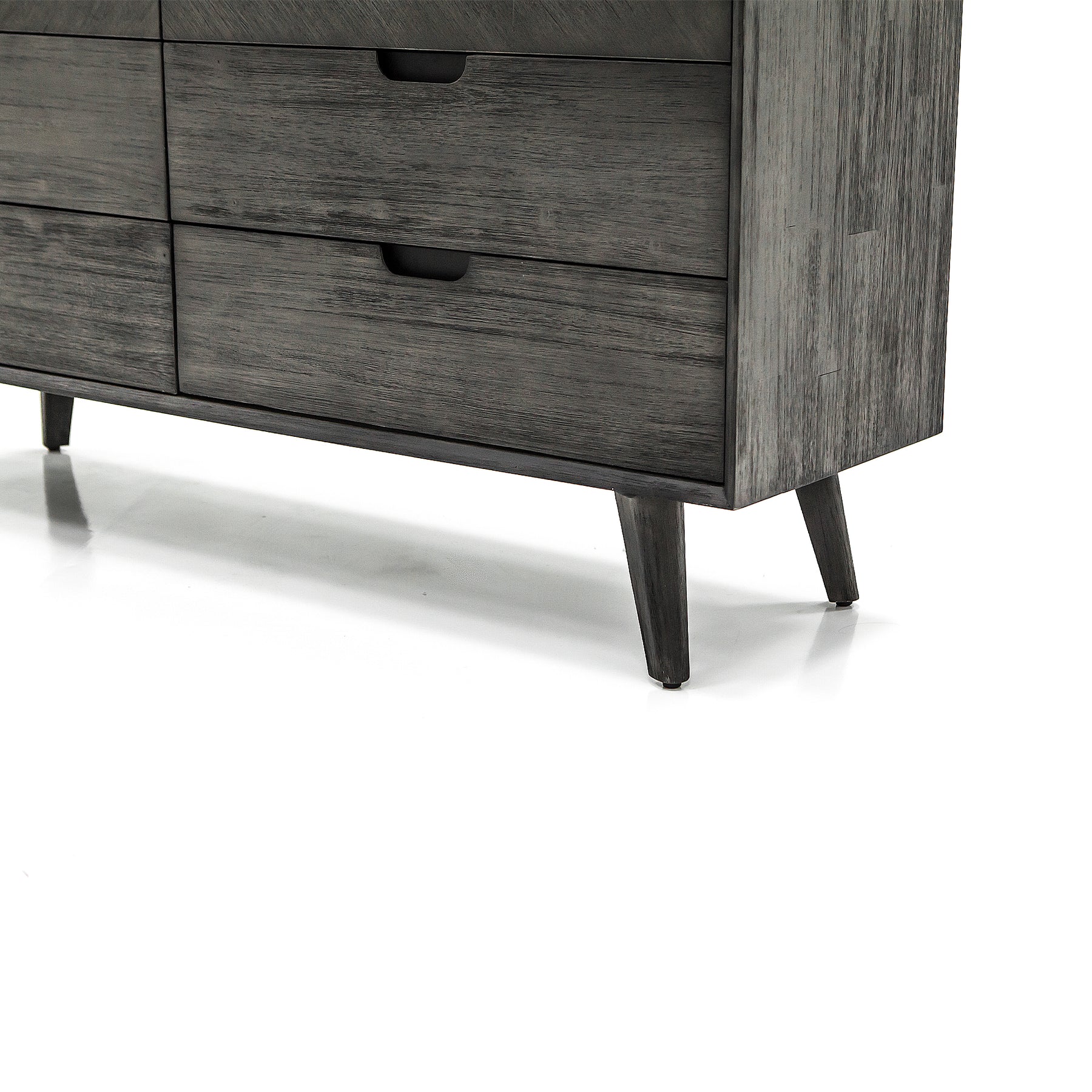The Armen living Mohave mid-century Tundra Gray acacia 6 drawer dresser is an aesthetic blend of minimalist and mid-century design. The dresser features 6 soft close drawers, for ample storage of clothes, accessories, and more. This wood dresser features an easy wipe clean acacia wood dresser top with an intricately. The minimalist look extends to the handles, where they are built into the drawer faces themselves. The beautiful tapered legs are tipped with rubber caps to prevent sliding on and scratching floors. We stand by the quality, the craftsmanship, and the integrity of our product by offering a 1-year warranty for all our products. We want our customers to enjoy our product and we will always be there to help with our top-notch customer service support. Product Dimensions: 61"W x 18"D x 32"HProduct Dimensions