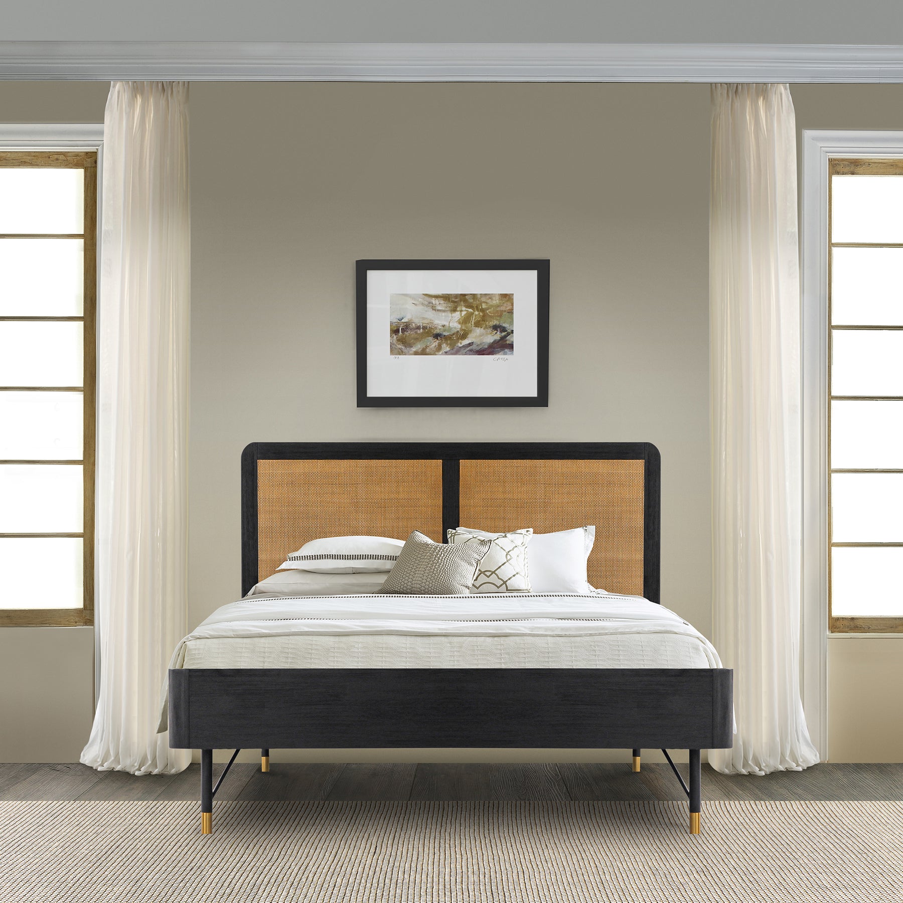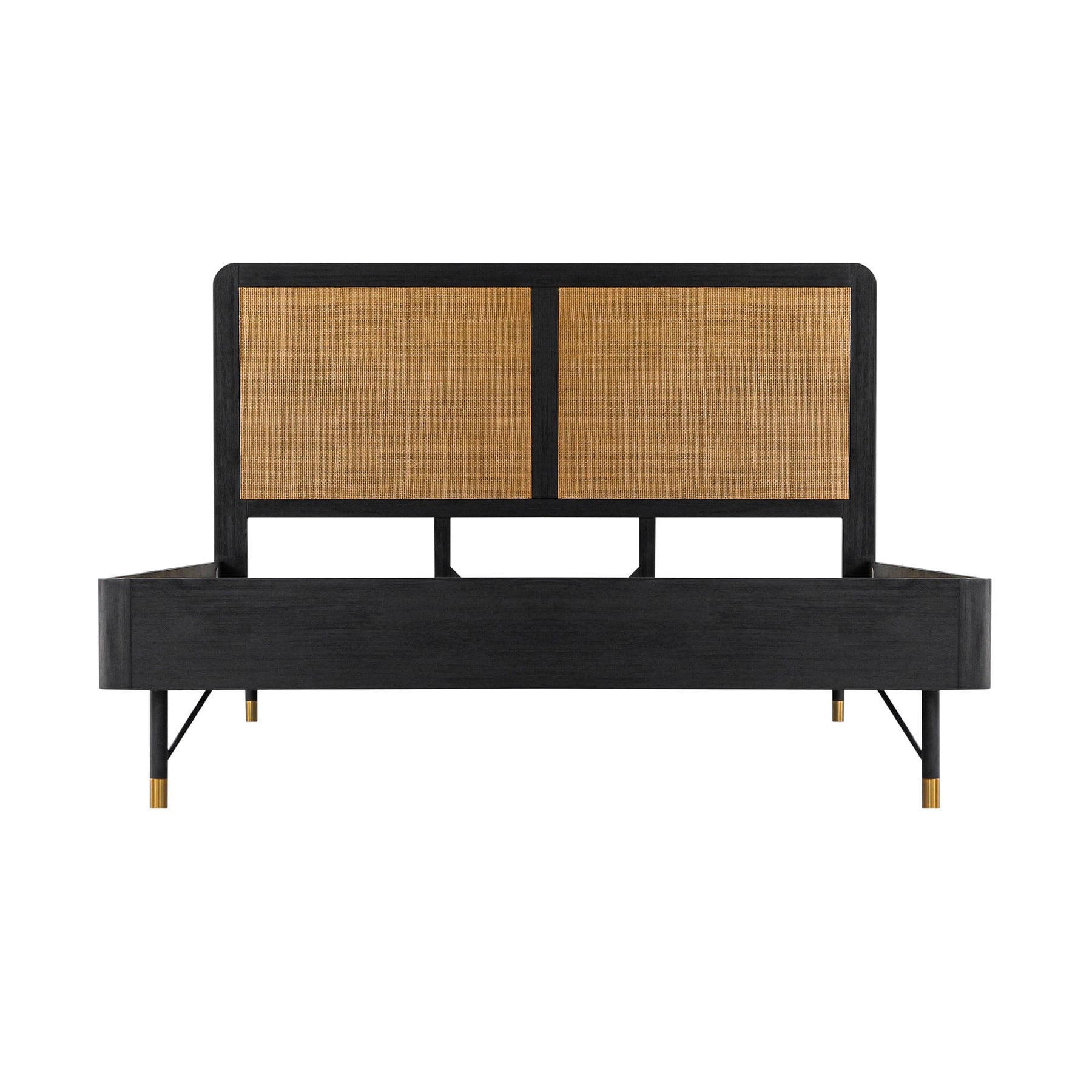 The Saratoga Platform Bed in Black Acacia and Rattan is a perfect fit for your bedroom or guest room. The rattan headboard is gracefully framed with a black Acacia to invite the warmth and grace of natural texture. Eye-catching and inviting, our bed achieves the perfect balance between a casual and refined look. Its slender black metallic legs are accented with brass caps to bring a touch of glam. Well-suited to your contemporary home, the bed is perfect for reading, lounging, and comfy rest at night. Acacia wood is a popular choice for furniture because it has many advantages over other types of hardwood. The strength-to-weight ratio of acacia wood is one of the best in the world, making it perfect for furniture that needs to be lightweight but still durable. It is resistant to moisture and pests and does not warp. If you are looking for a durable, long-lasting material for your furniture, then acacia wood is worth considering. The wooden slats ensure your comfortability by allowing air to pass freely beneath your bed, ensuring your mattress maintains its freshness and gives you many more years of enjoyment. Pair with your memory foam, innerspring, or latex mattress. Combining style and functionality, our bed is perfect for early morning lingering, late-night reading, and comfy rest through the night. The Saratoga platform bed frame is available in a modern black finish and comes in king or queen size.Product Dimensions