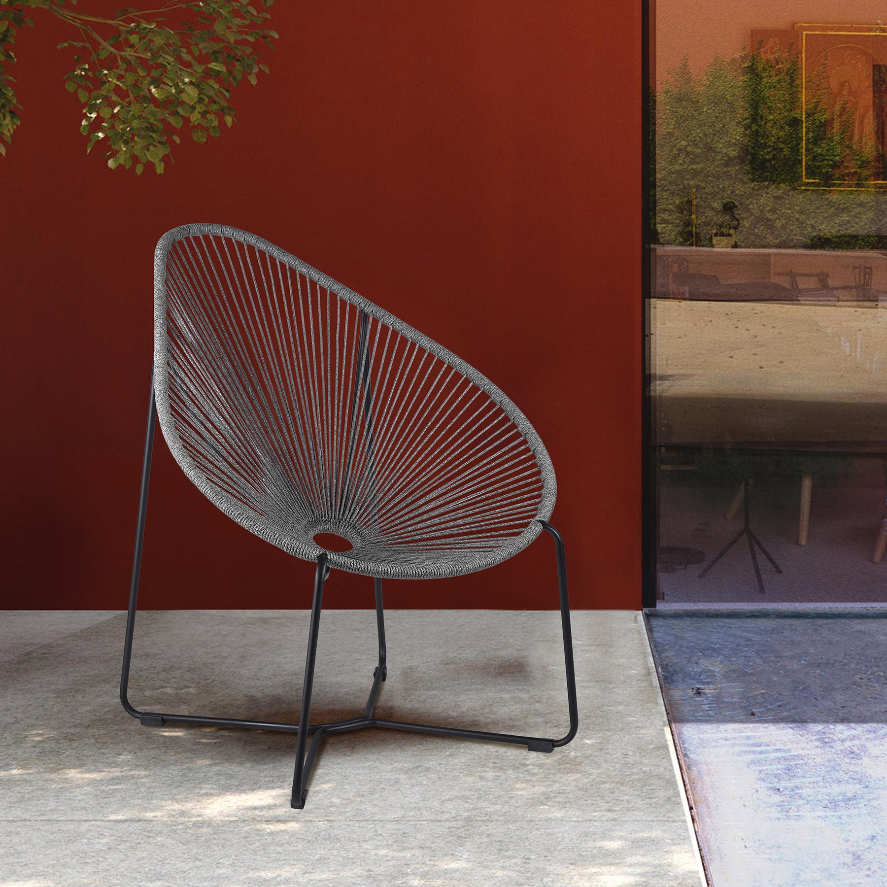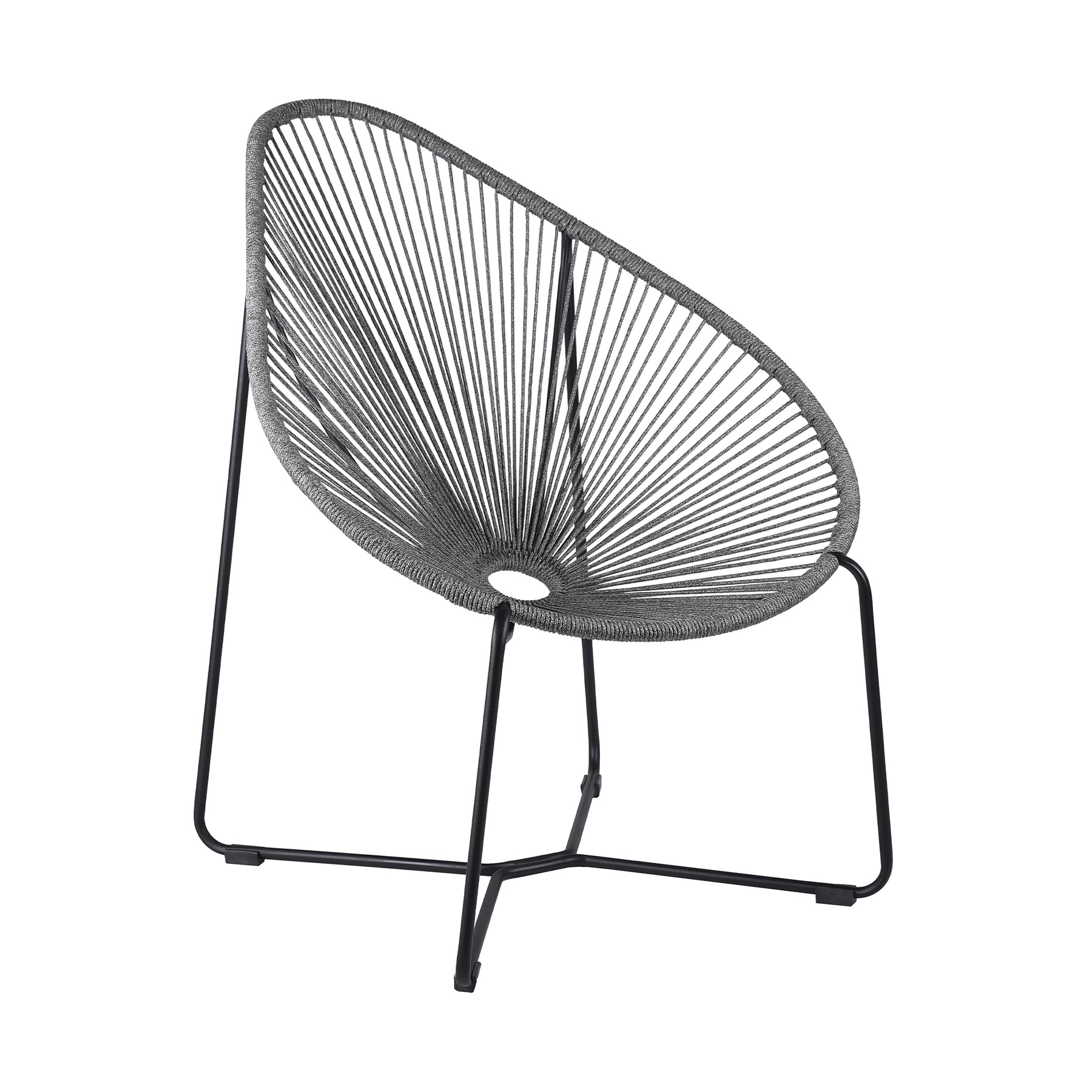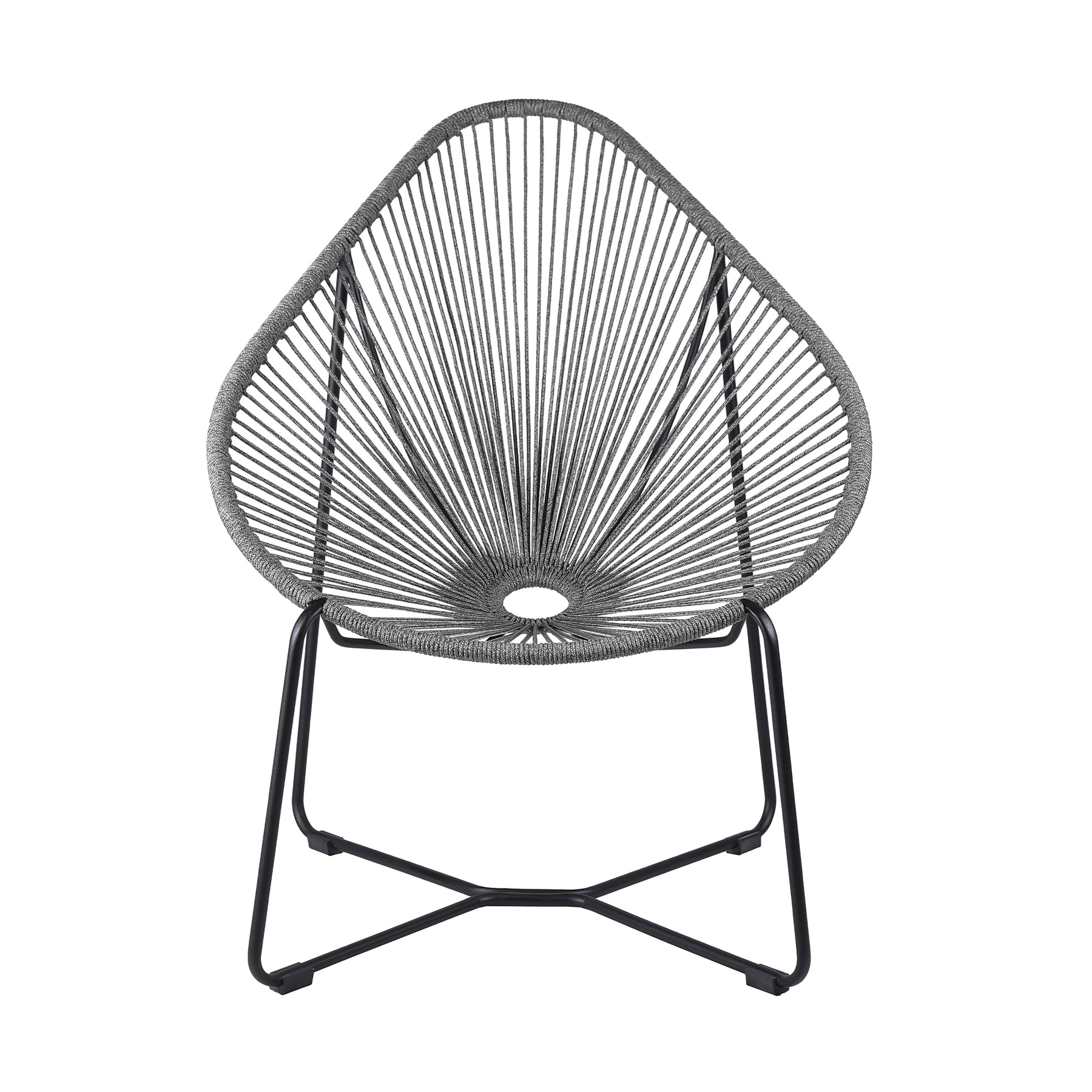 The Acapulco Indoor Outdoor Steel Papasan Lounge Chair with Black Rope from Armen Living will bring an exciting, fun, and enjoyable look into your outdoor living area. Featuring an elaborate woven design and rounded metal frame, this chair will blend seamlessly into your outdoor decor. Its pear-shaped seat is wrapped in resilient regatta rope cording, providing supple support while still allowing for element passthrough - also enhancing your seating experience with a softness that rivals most fabrics. The Acapulco chair covers your body perfectly and will keep you relaxed and let you unwind during your favorite season. The Acapulco outdoor chair is available in your color choice of black, brick red, grey, or wasabi - choose your favorite to match your outdoor decor. Product Dimensions: 31"W x 36"D x 39"H SH: 16.5"Product Dimensions