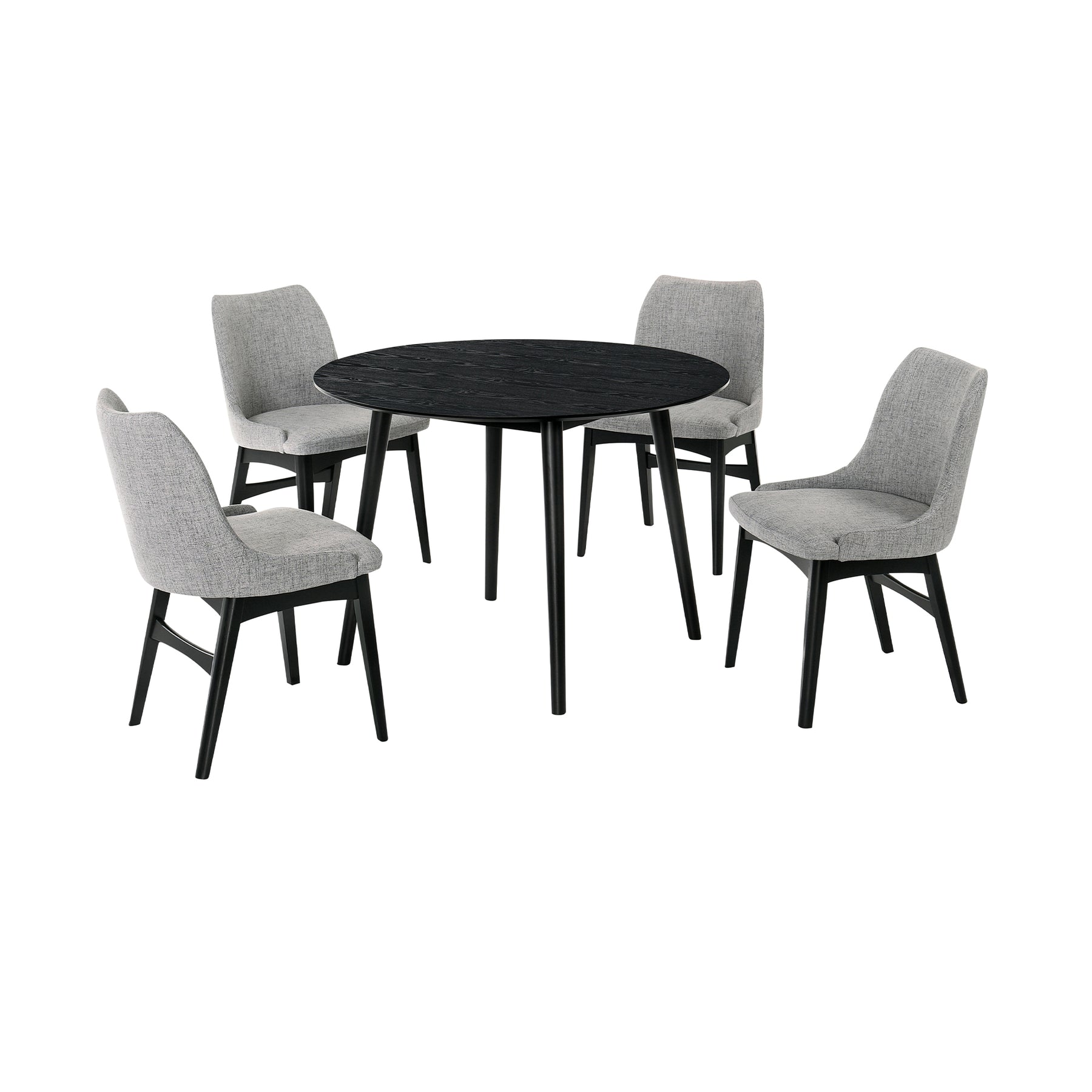 The Arcadia and Azalea 42" Round 5 Piece Dining Set is an ideal addition to any kitchen or dining room. The Arcadia round dining table in offers a clean and simple aesthetic that is stylish and functional. Hints of Scandinavian design and a mid-century modern feel come together to create the perfect space to share a meal with friends and family. Round tables are great because they can accommodate the most people. It's easy to squeeze in an extra table setting or two where there aren't any corners! The Azalea dining chairs feature soft fabric upholstery luxuriously wrapped around the entire seat - covering the ultra-comfortable foam padded cushion. Featuring a wide back and spacious seat, you never have to feel confined to a small space. The clean, sleek, and geometric wooden legs add a modern style to this chair - also assuring dependability that this chair will last and give you years of enjoyment. The Arcadia and Azalea round 5-piece dining set is available in your choice of a black wood finish with grey upholstered chairs or a walnut wood finish with blue, charcoal or orange upholstered chairs.Product Dimensions