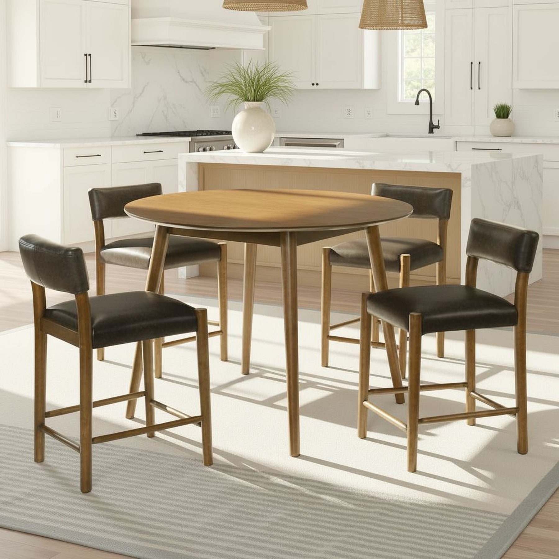 The Bennet 5-Piece Pub Set brings warmth, sophistication, and everyday comfort to your dining or entertainment space. Designed with modern simplicity and crafted with exceptional attention to detail, this coordinated set includes one 47-inch round pub table and four matching counter-height stools, creating the perfect setting for casual meals, lively gatherings, or morning coffee moments. The Bennet Pub Table, standing at a comfortable 36-inch height, features a beautifully finished walnut-toned walnut surface made from durable solid natural wood. Its round silhouette promotes connection and flow, ideal for open floor plans or compact dining areas. Four gently tapered legs provide stable support while keeping the table s profile light and elegant. Complementing the table are four Bennet Counter Stools, each designed for a seamless balance of style and comfort. The black vegan leather upholstery adds modern refinement and soft texture, offering the rich look of genuine leather with easy-care practicality. The seats and gently padded backs are supported by a matching walnut-finished solid natural wood frame, ensuring durability without sacrificing design appeal. A supportive footrest adds ergonomic comfort, making these stools perfect for extended seating. Together, the Bennet Pub Table and Stools bring harmony and function to your dining area,bridging the charm of mid-century modern design with the lasting quality of contemporary craftsmanship. Ideal for kitchen corners, bar areas, or cozy dining spaces, this set delivers elevated casual dining that feels both stylish and inviting. Assembly is simple and straightforward, with all tools and hardware included. Built for lasting daily use, this set is backed by a 1-year limited manufacturer warranty for quality assurance.Product Dimensions