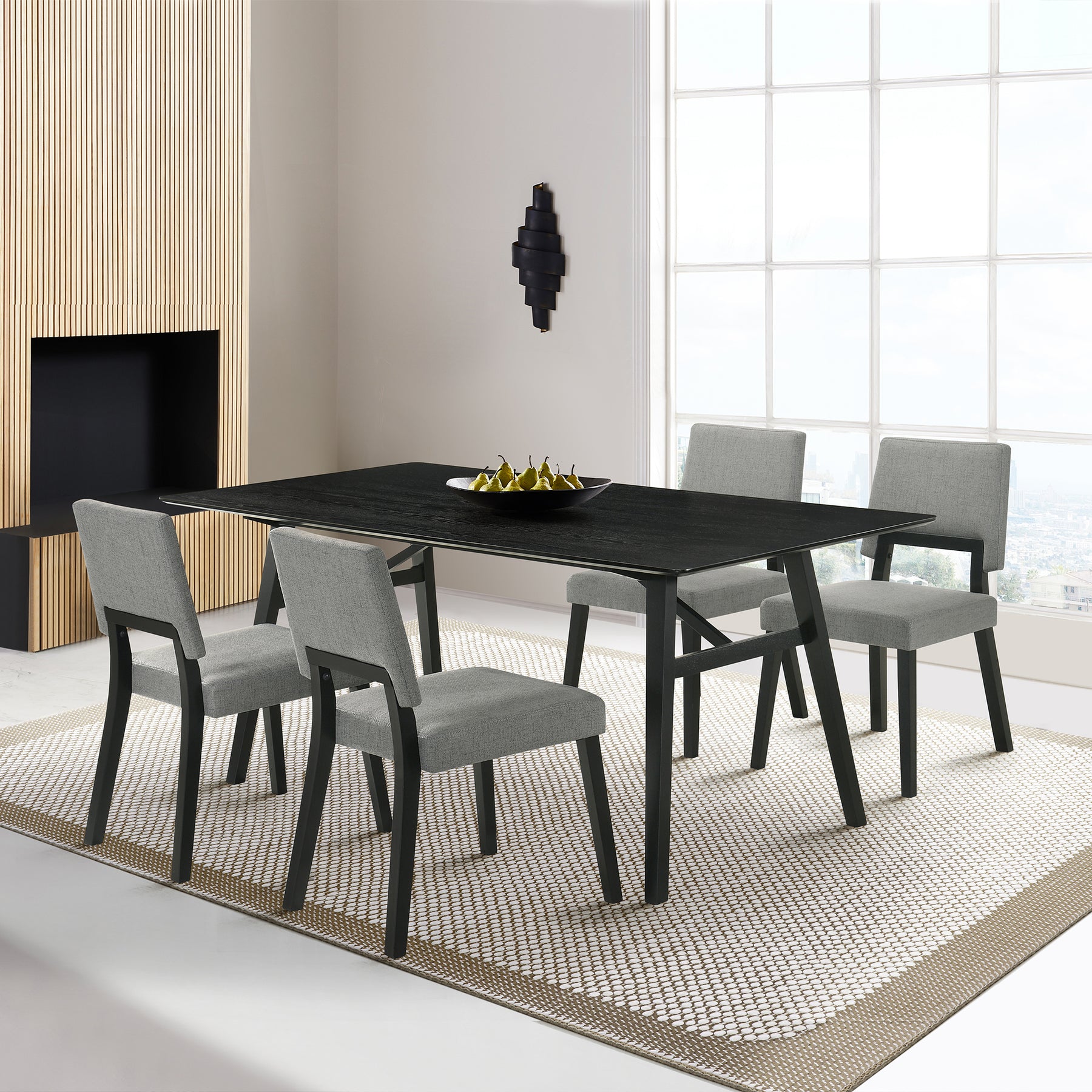Gather with friends and family around the Channell 5-piece Wood Dining Set from Armen Living. Beautifully highlighting the rich grains of wood, the dining table impresses with its sleek and effortless style. It features a trestle base with angular legs to maintain a stunning architectural appeal. Its slim and elongated profile makes it a practical and elegant choice for your kitchen, dining area, or living space. It provides ample leg room to serve as a comfortable option for enjoying meals, entertaining, or spending leisurely time. The neatly tailored dining chairs feature an upholstered back and seat to deliver a comfortable stay, it s back opening offers breathability. The wooden frame and gracefully angled legs add to the elegance of our chairs. They feature a subtly reclined back to pack comfort and functionality within their sleek armless design. This dining set is constructed with a combo of engineered and rubberwood and features durable polyester upholstery. This set includes 1 dining table and 4 dining chairs. The Channell Wood Dining Set is available in your choice of a walnut finish with charcoal, blue, and orange fabric upholstered chairs or a black finish with charcoal fabric upholstered chairs.Product Dimensions