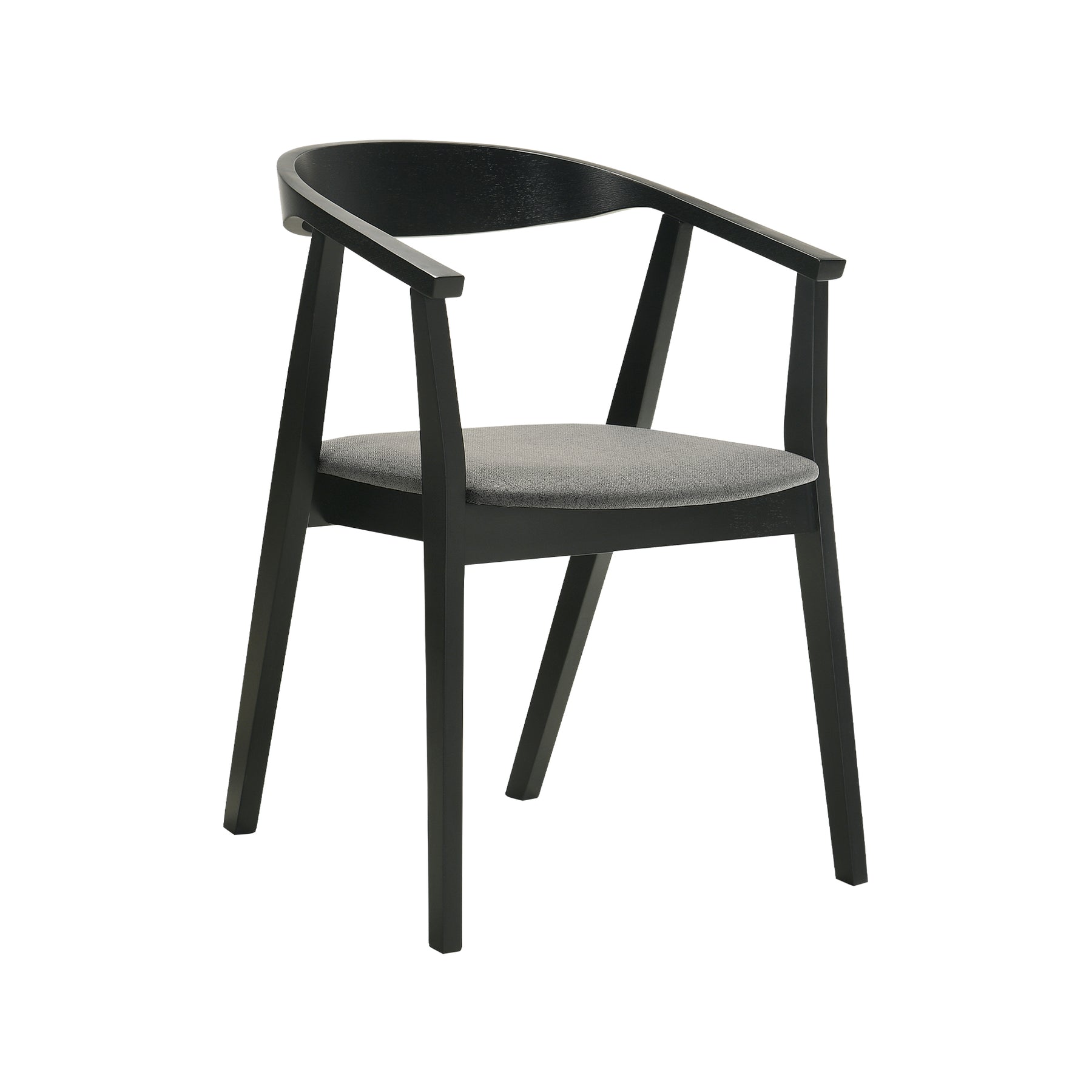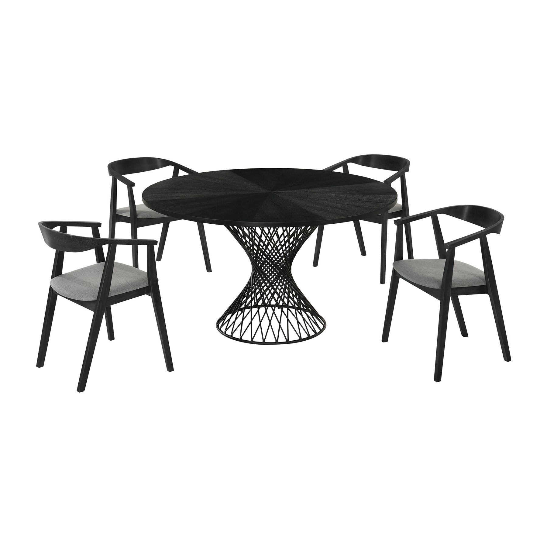Style and function come together with the Cirque Santana 5-piece dining set from Armen Living. This dining set includes 1 round Cirque dining table, and 4 Santana dining chairs. The intricate metal pedestal base of the table lends itself to a mid-century modern design theme, further complimented by the angular legs and airy silhouette of the dining chairs. The upholstered and padded seat of the Santana wood chairs allow for hours of comfortable seating. The round black wood tabletop measures 54 inches round and can easily accommodate more chairs if needed for dinner parties or holidays. Round dining tables are more space efficient than rectangular tables and without the sharp corners, they allow for better traffic flow if being used in a compact area. Apart from safety, the absence of sharp corners creates a more harmonious environment for your friends and family to enjoy. The Cirque Santana 5-piece Dining Set is available in a chic black finish with charcoal upholstery.Product Dimensions