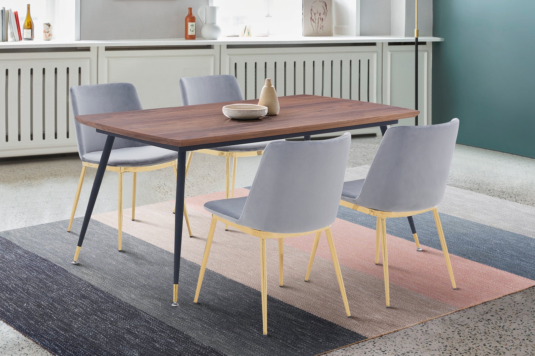 The Armen Living Messina Velvet and Walnut 5 Piece Dining Set is a necessity for any modern or contemporary household. The soft velvet upholstery is smooth to the touch but durable to last with everyday wear and tear. These chairs feature plush foam padding for the most comfortable seat cushion around. The high chair back offers excellent lumbar support that keeps your back properly aligned and feeling great. The beautiful gold metal legs add a look of refinement to this piece. The versatile look allows you to add these chairs to any room in your home and will make a statement. The Messina table features a Walnut finish, black powder-coated, and golden stainless steel tube legs that are complemented by a sleek Walnut veneer tabletop. The wood construction of the Messina makes it a traditional table with a contemporary twist - dependable, yet exceptionally modern. The Messina's rectangular frame is designed to fit perfectly in the dining room but is practical enough to serve well in just about any room of the house. Treat yourself to the perfect dining set for your space.Product Dimensions