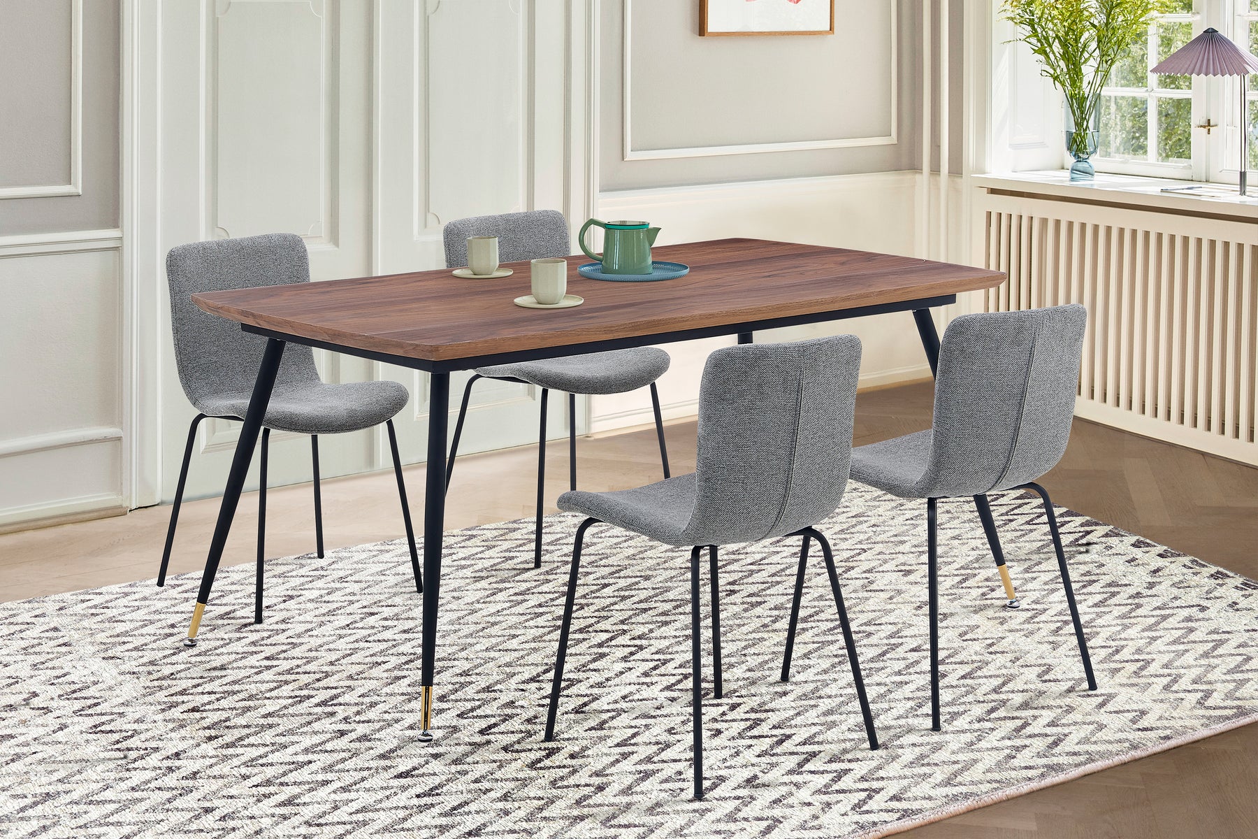 The Armen Living Messina and Gillian Fabric and Walnut 5 Piece Dining Set is all you have ever wanted condensed into one perfect set. The smooth upholstery shows off the quality of the product, as does the strong and durable chair frame. The modern chair seat is flawlessly shaped and will keep you comfortable all day long. The ergonomic chair back is crafted to keep your back and posture in the perfect position. The legs of the chairs are tipped with rubber caps to prevent sliding on or scratching floors. The Gillian chairs are available in your choice of Gray faux leather or Gray fabric upholstery options. The Messina table features a Walnut finish, black powder-coated, and golden stainless steel tube legs that are complemented by a sleek Walnut veneer tabletop. The wood construction of the Messina makes it a traditional table with a contemporary twist - dependable, yet exceptionally modern. The Messina's rectangular frame is designed to fit perfectly in the dining room but is practical enough to serve well in just about any room of the house. Treat yourself to the perfect dining set for your space.