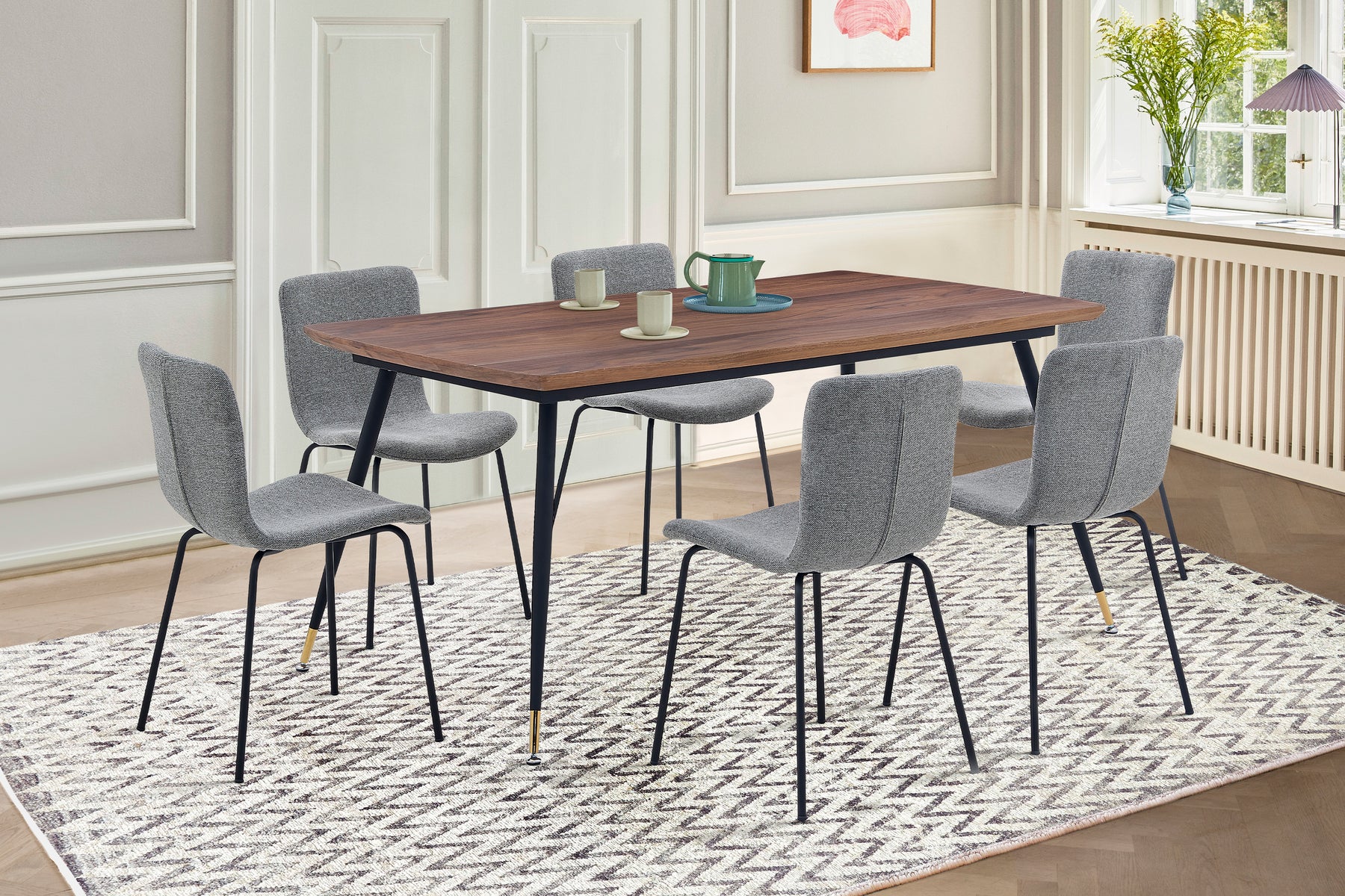 The Armen Living Messina and Gillian Fabric and Walnut 7 Piece Dining Set is all you have ever wanted condensed into one perfect set. The smooth upholstery shows off the quality of the product, as does the strong and durable chair frame. The modern chair seat is flawlessly shaped and will keep you comfortable all day long. The ergonomic chair back is crafted to keep your back and posture in the perfect position. The legs of the chairs are tipped with rubber caps to prevent sliding on or scratching floors. The Gillian chairs are available in your choice of Gray faux leather or Gray fabric upholstery options. The Messina table features a Walnut finish, black powder-coated, and golden stainless steel tube legs that are complemented by a sleek Walnut veneer tabletop. The wood construction of the Messina makes it a traditional table with a contemporary twist - dependable, yet exceptionally modern. The Messina's rectangular frame is designed to fit perfectly in the dining room but is practical enough to serve well in just about any room of the house. Treat yourself to the perfect dining set for your space.Product Dimensions