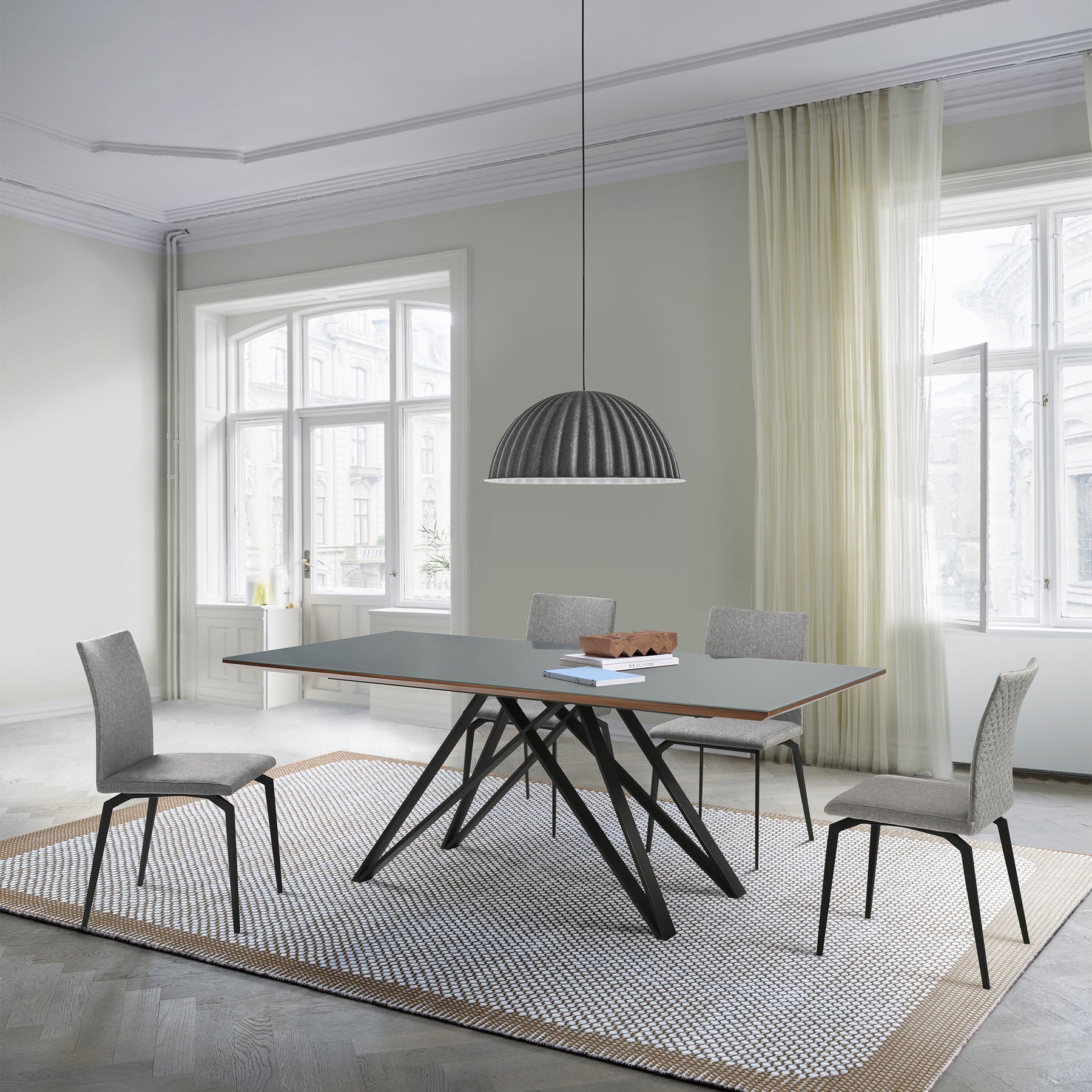 Entertain like a pro with the Urbino Lyon 5-piece dining set from Armen Living. This set includes the Urbino dining table and 4 Lyon dining chairs. The Lyon Dining Chair maintains its geometric shape and sharp lines, which create its simplistic look. The enhanced fabric is durable and tough on messes, but soft and smooth on your body - keeping you relaxed and comfortable while you're seated. The Lyon presents a thick and plush foam-padded cushion which will leave you in your seat all day. The high back offers excellent lumbar support that keeps your back properly aligned and feeling great. This stylish steel table features a matte black finish frame and a top that features a combination of walnut wood and glass. This brilliant combination of materials makes the Urbino a truly original product without compromising on the table's practical function. The Urbino's elegant base design features floor protectors, assuring that the table will not damage floors when moved. The foundation of the product is supported by wood and metal for a sturdy and stylish aesthetic without comprising practicality and functionality of this item. The sleek and smooth glass top add a touch of glam mix with sophisticated modern look. The Urbino Lyon dining set is available as a 5-piece set and features a beautiful black metal finish, grey fabric upholstery and walnut wood accents complimented by a glass tabletop.