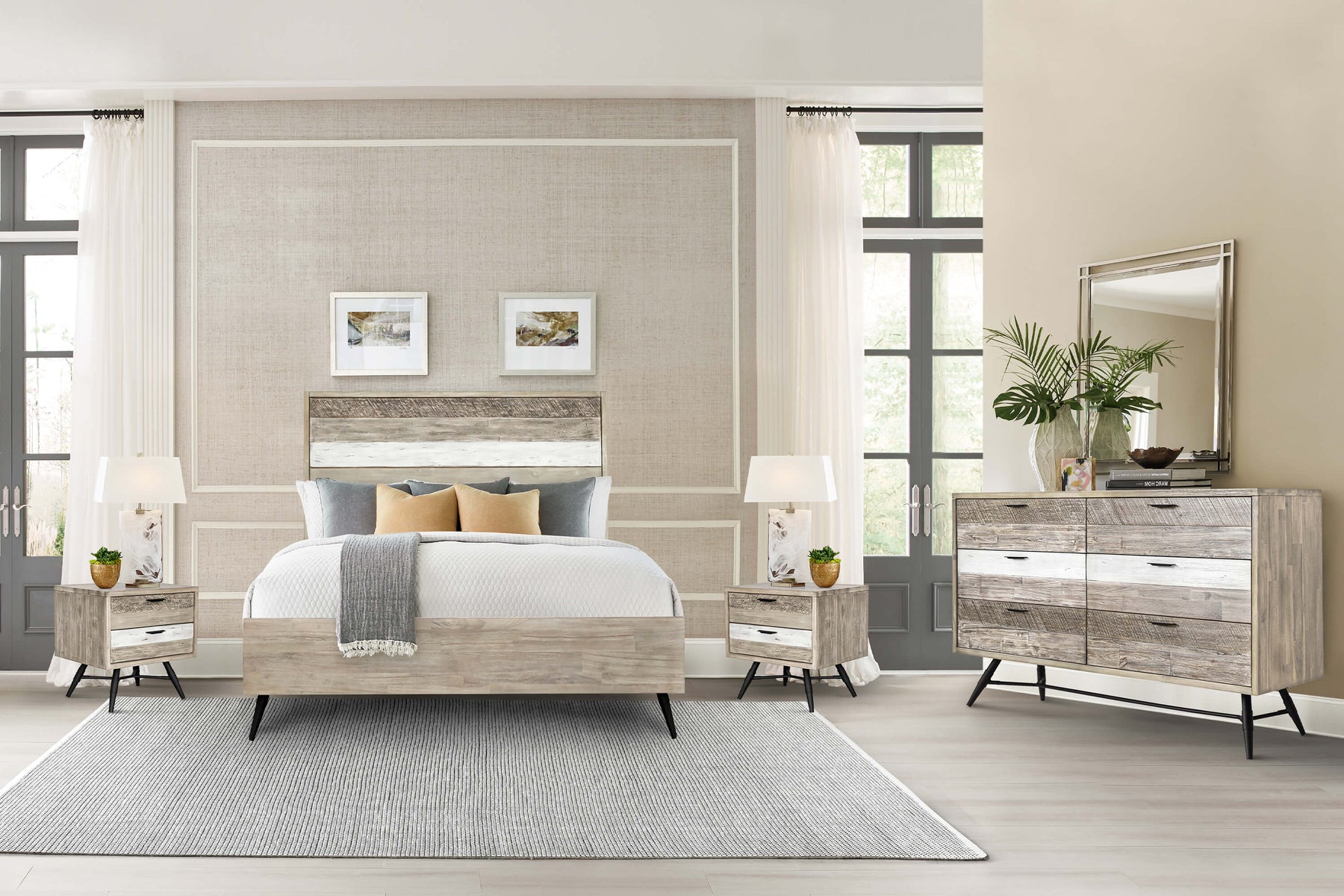 Invite the warm textures of acacia wood into your bedroom with the Armen Living Bridges 4 Piece Bedroom Set in two-tone Acacia Wood. Crafted from solid Acacia, this bedroom set displays one-of-a-kind markings and rich wood grains to enliven your bedroom, providing a modern yet rustic aesthetic. The platform bed’s tall headboard exuberantly displays a variety of textures and tones to maintain a sleek and sophisticated presence. Acacia wood is a popular choice for furniture because it has many advantages over other types of hardwood. The strength-to-weight ratio of acacia wood is one of the best in the world, making it perfect for furniture that needs to be lightweight but still durable. It is resistant to moisture and pests and does not warp. If you are looking for a durable, long-lasting material for your furniture, then acacia wood is worth considering. The wooden slats ensure your comfortability by allowing air to pass freely beneath your bed, ensuring your mattress maintains its freshness and gives you many more years of enjoyment. Pair with your memory foam, innerspring, or latex mattress. Bringing ultimate warmth and sophistication, the dresser remains elevated upon a sleek black metallic base. It includes six roomy drawers to keep all your workout gear, pajamas, and other essentials organized for a clutter-free storage solution. Featuring two roomy drawers with streamlined handles, the nightstand can keep all your essentials organized behind its warm and inviting facade. This Bridges acacia bedroom set includes 2 nightstands, 1 dresser, and 1 platform bed. The Bridges bedroom set is available with your choice of a king or queen size bed frame.Product Dimensions