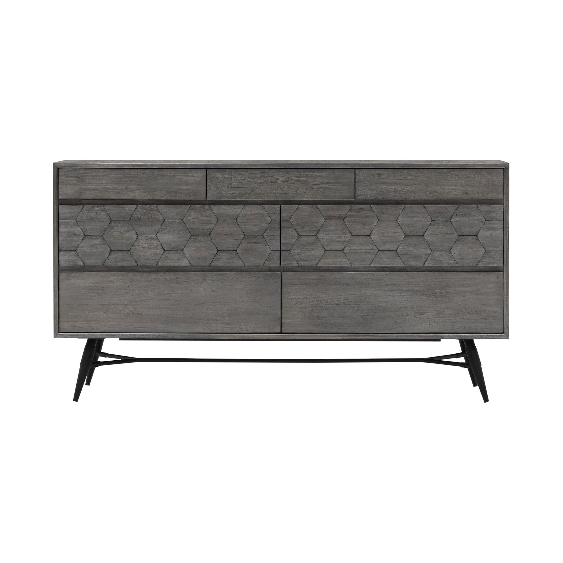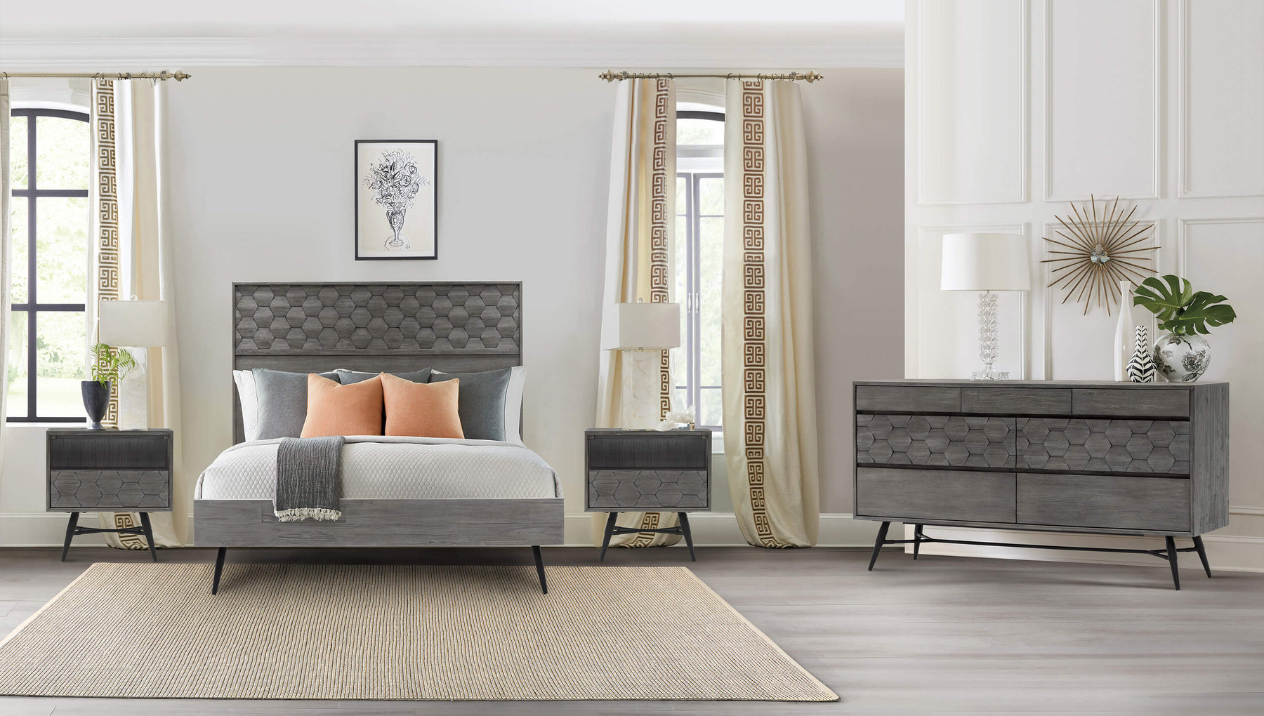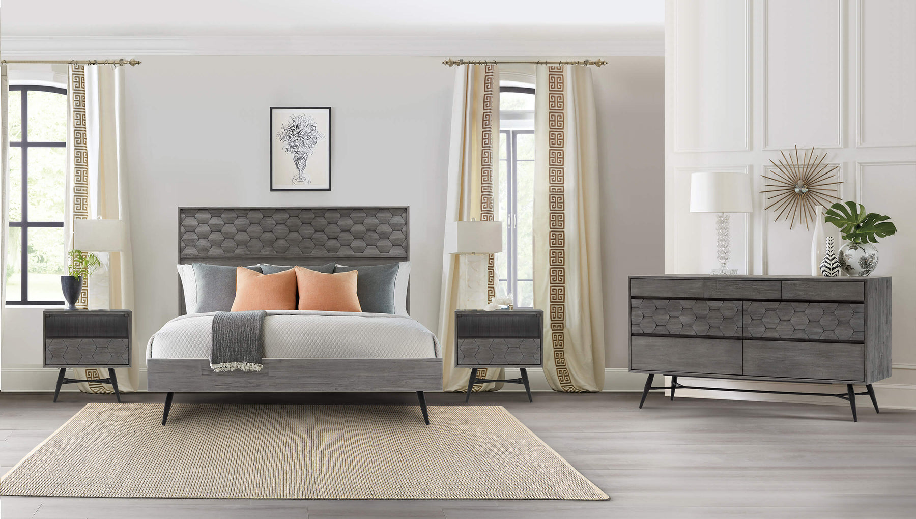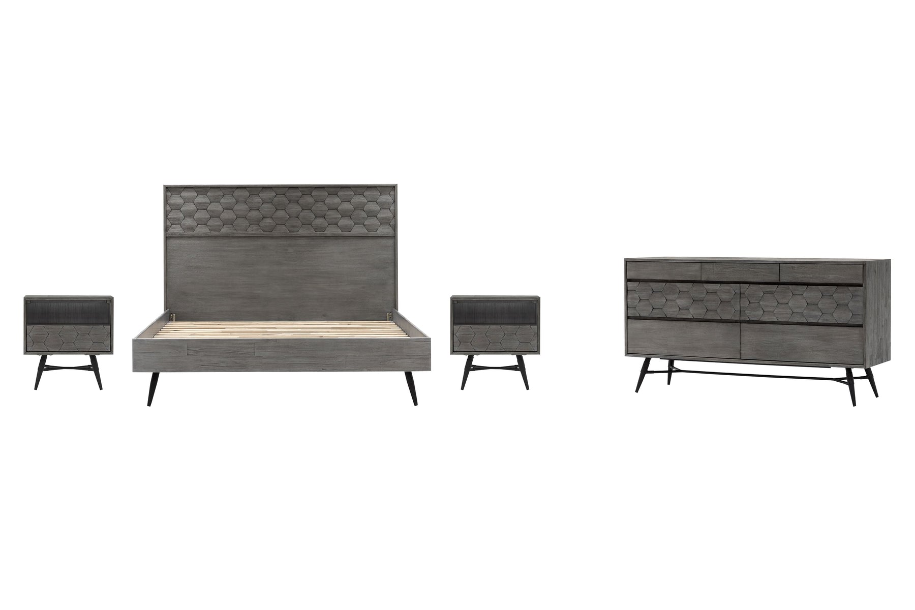 Add dimension and style to your bedroom or guest room with the Makena 4 Piece Bedroom Set in Grey Acacia Wood. The bed, dresser, and nightstand all feature a beautiful grey acacia wood finish that is enlivened with a three-dimensional honeycomb pattern. Modern and graphic, our bed makes a chic statement in any setting. Acacia wood is a popular choice for furniture because it has many advantages over other types of hardwood. The strength-to-weight ratio of acacia wood is one of the best in the world, making it perfect for furniture that needs to be lightweight but still durable. It is resistant to moisture and pests and does not warp. If you are looking for a durable, long-lasting material for your furniture, then acacia wood is worth considering. It features a sleek finish to gracefully accentuate the organic grains of Acacia. The wooden slats ensure your comfortability by allowing air to pass freely beneath your bed, ensuring your mattress maintains its freshness and gives you many more years of enjoyment. The modern and graceful dresser is elevated upon a sleek metallic base to uplift your modern aesthetic and includes six roomy drawers to keep all your workout gear, pajamas, and other essentials organized for a clutter-free storage solution. The nightstands feature the same graceful black metallic base to make a playful and elegant statement in any setting. It includes an open shelf and drawer to keep your essentials organized and within easy reach. This bedroom set will make a statement in any room and comes complete with 2 nightstands, 1 dresser, and 1 platform bed. The Makenna bedroom set is available with your choice of a king or queen size bed frame.