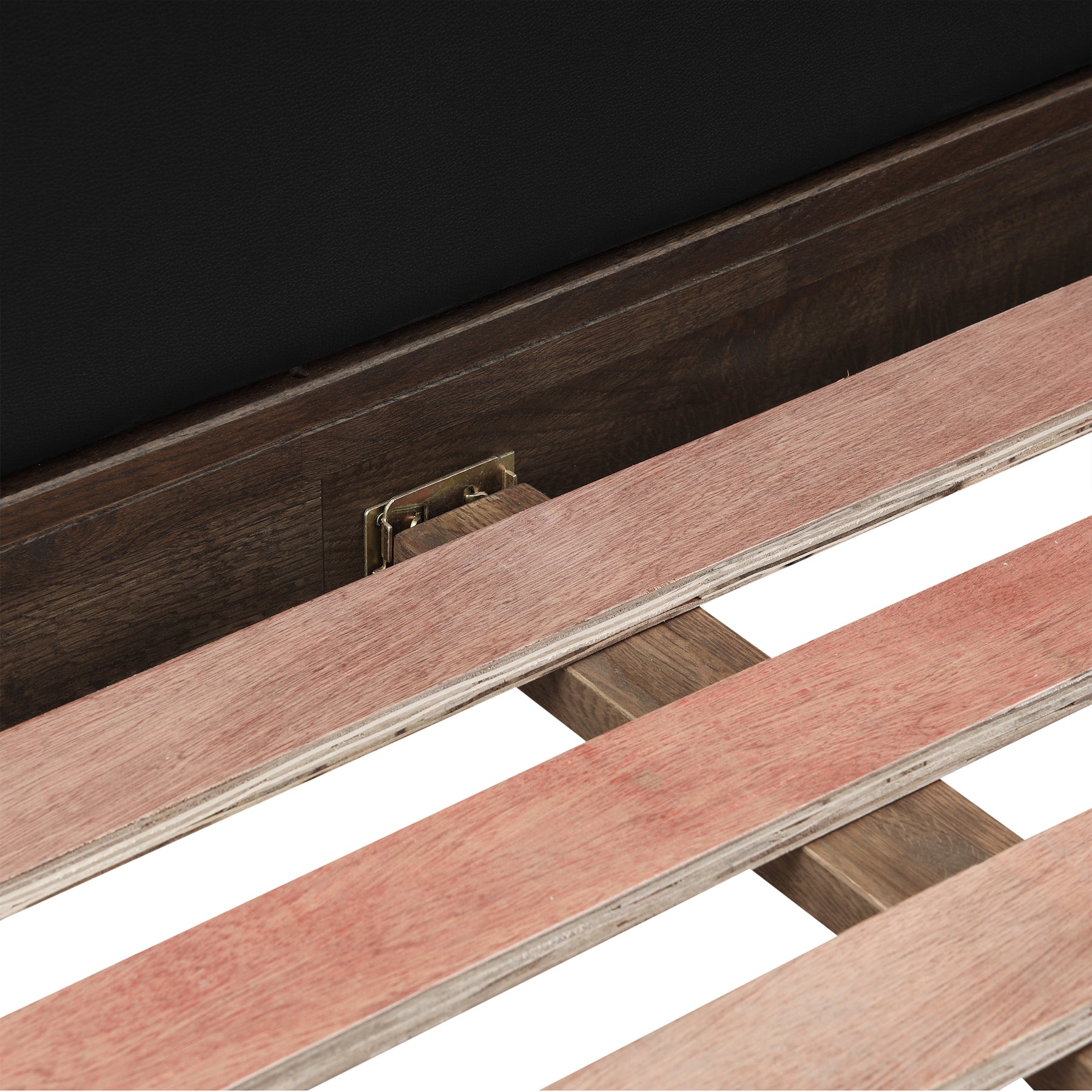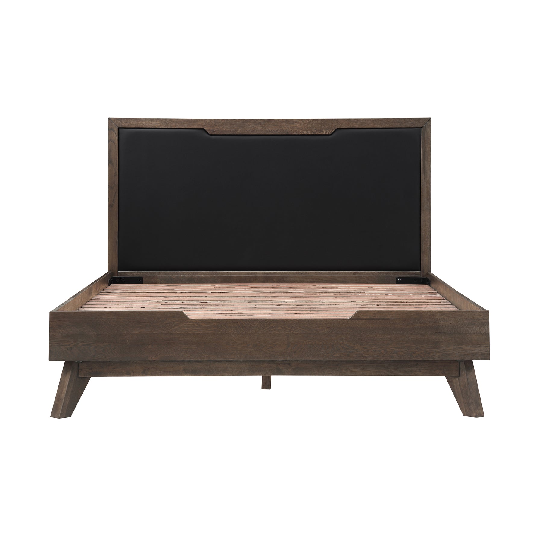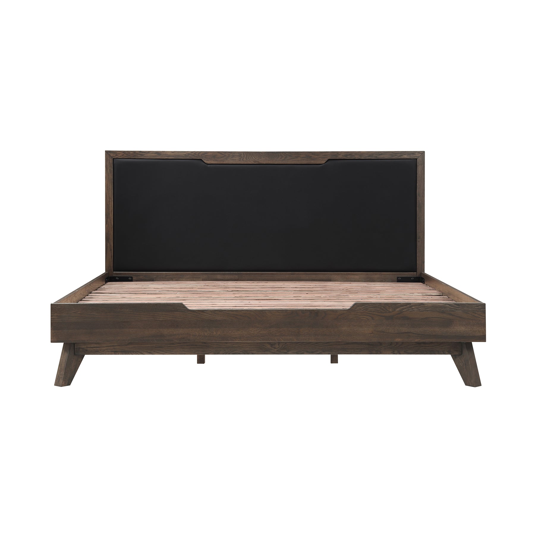 Crafted from solid oak wood and sporting a beautiful faux leather upholstered headboard, the Astoria platform bed frame from Armen Living is the best choice to modernize your home instantly. It comes complete with a platform base to provide optimal support for your latex, spring, or memory foam mattress without a box spring for a low-profile look. This upholstered king bed frame with headboard features a solid oak boarder around soft and easy to clean black faux leather, creating a chic color and texture contrast. It has a gorgeous gray wash that allows the wood s natural wood grain color variation to shine through. In addition, the bed frame offers plenty of storage space under it for your convenience. The Astoria s platform design is perched atop thick tapered legs, lending a mid-century modern feel to your space. The brown and black color theme easily blends into your existing décor and adds a flair of modern elegance. The Astoria Solid Oak Platform Bed from Armen Living is available in your choice of king or queen sizes.Product Dimensions