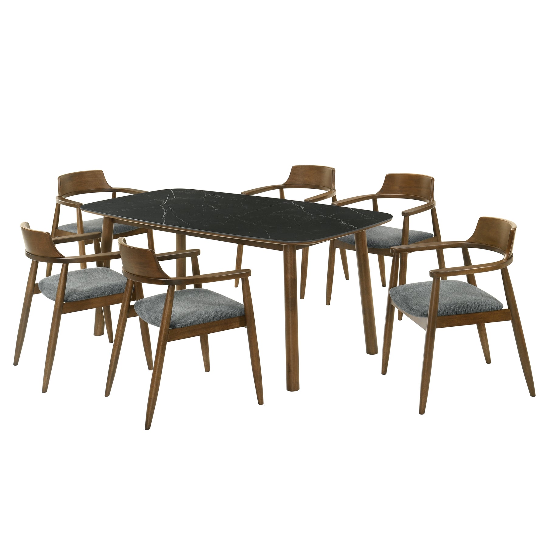 Emorie Mid-Century Modern 7-Piece Wood Dining Set in Walnut Finish with Sintered Stone Top