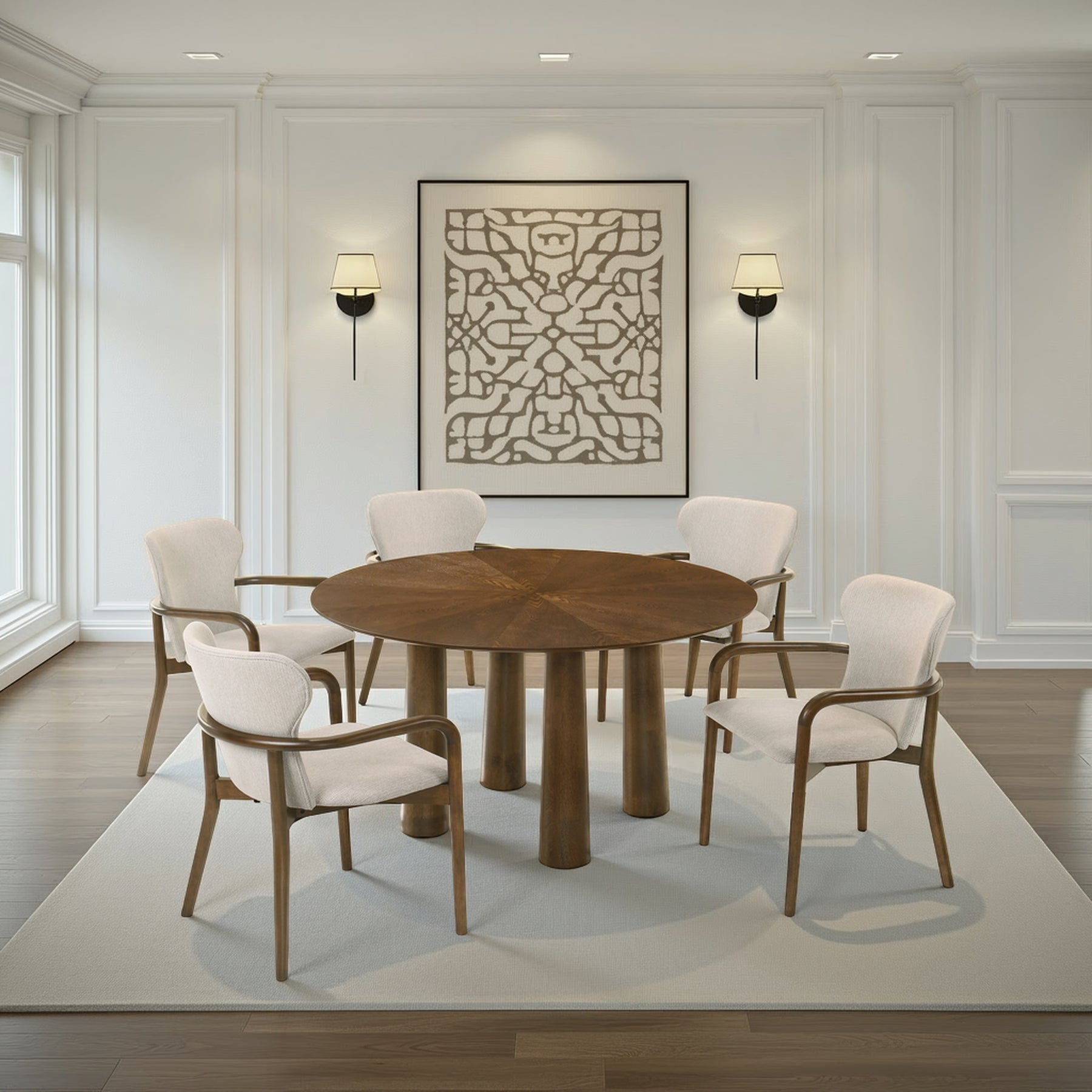 Klarissa Mid-Century Modern 6-Piece Wood Dining Set in Walnut Finish from the Klarissa collection brings together refined aesthetics and everyday functionality, making it a standout centerpiece for any dining space. With clean lines and tapered legs, this set reflects mid-century modern sophistication while offering comfort and long-lasting quality. The round dining table features a smooth walnut-finished wood top supported by a sturdy rubberwood frame, creating a warm and welcoming focal point. Five matching chairs complete the set, each upholstered in soft cream performance fabric that resists stains and is easy to care for. The rich walnut wood and neutral upholstery create a versatile look that fits seamlessly into a wide range of interiors, from cozy breakfast nooks to stylish open-concept spaces. Perfect for both casual meals and special occasions, the Klarissa set is designed to bring people together. Assembly is simple and takes about 10 minutes with two people. The set comes with a 1-year manufacturer's warranty for added peace of mind. This dining set isn’t just functional, it’s an invitation to gather, share, and enjoy timeless design.Product Dimensions