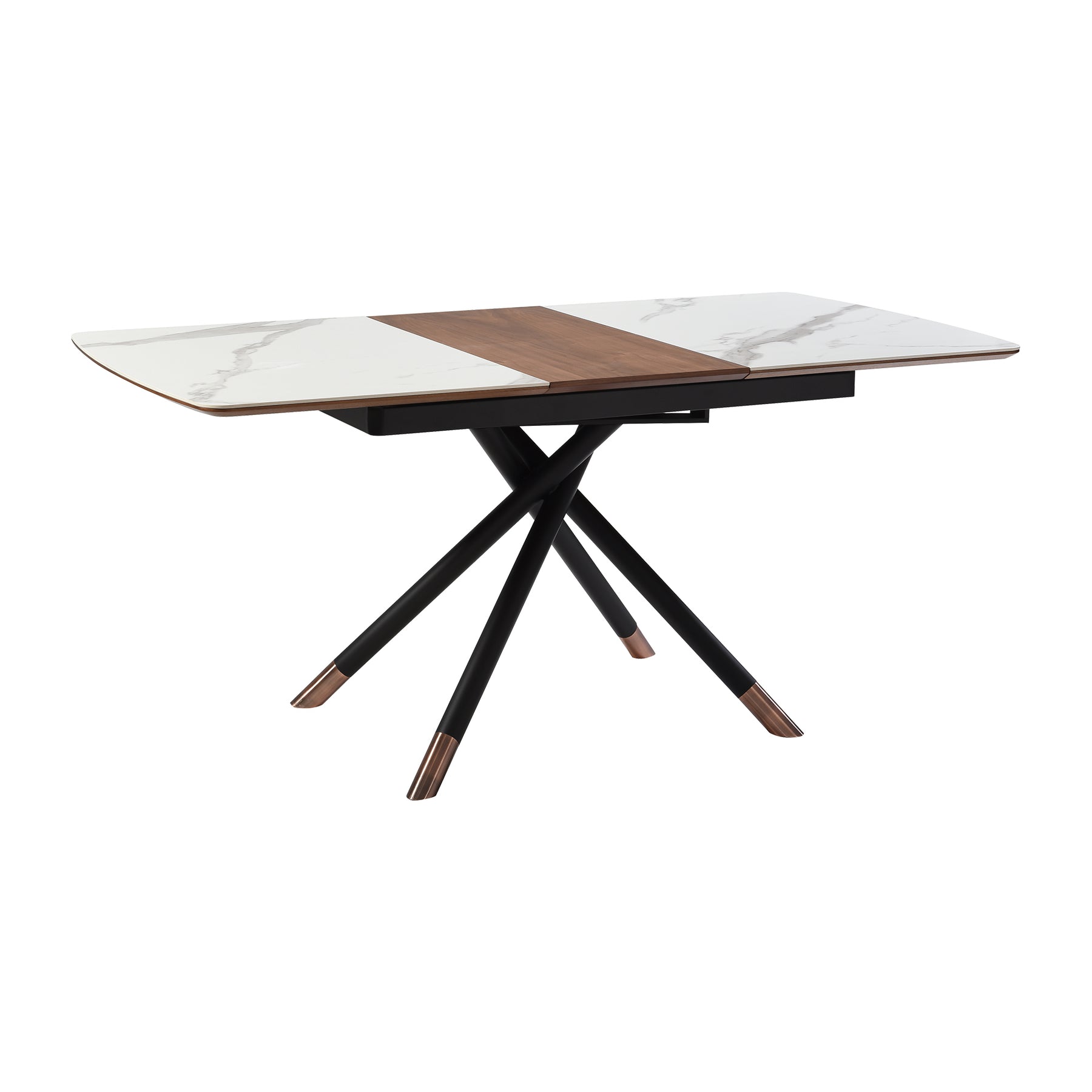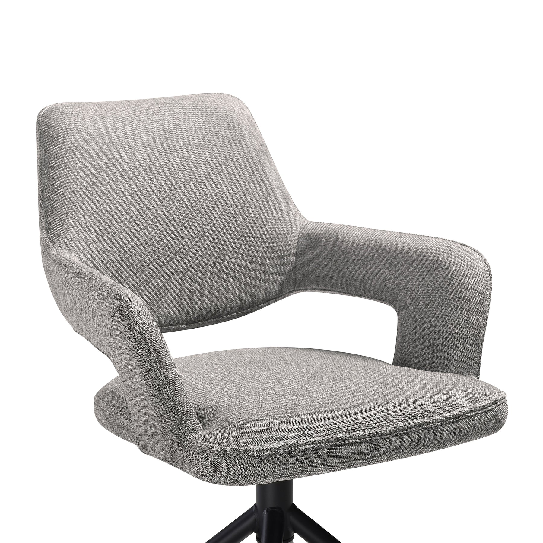 The impressive Alora Penny 7 Piece Extendable Dining Set with Grey Fabric Chairs features 1 Alora extendable dining table and 6 Penny swivel dining chairs. Featuring a sleek and modern silhouette, this kitchen chair attains a chic and stylish presence in any room. The streamlined back elegantly flows into the sloping arms to offer a dose of comfort and style. A stylish cut-out in the back lightens the sculptural appeal of our dining room chair. Finished off with pyramid-shaped black metallic legs, the chair serves as a striking and sturdy accent for any corner. The dining table chair includes a tall back, padded arms, and a cushioned seat to deliver a cozy and comfortable stay. From offering a comfy seat in your kitchen to serving as a stylish and comfortable accent chair for your workspace, the Penny brings comfort and convenience to any room. It includes a 180-degree swivel function allowing you to follow conversations with ultimate ease. The tabletop features a harmonious combination of light grey ceramic with a walnut finished wood accent in its center. Rounded edges attain a soft silhouette, and the metal cross leg base brings a cool touch with the copper caps. This table can easily extend from 51Â to 67Â to comfortably seat up to six of your closest friends or family members. From a perfect spot to enjoy your casual meals to a luxe place to host your formal dinners, our dining table remains a versatile and stylish addition to your home. The table is expertly crafted to offer durability and easy maintenance. The Alora Penny dining set is available in 5 and 7 piece set configurations and features a light grey ceramic and walnut wood table top with black metal legs and grey fabric swivel dining chairs.Product Dimensions