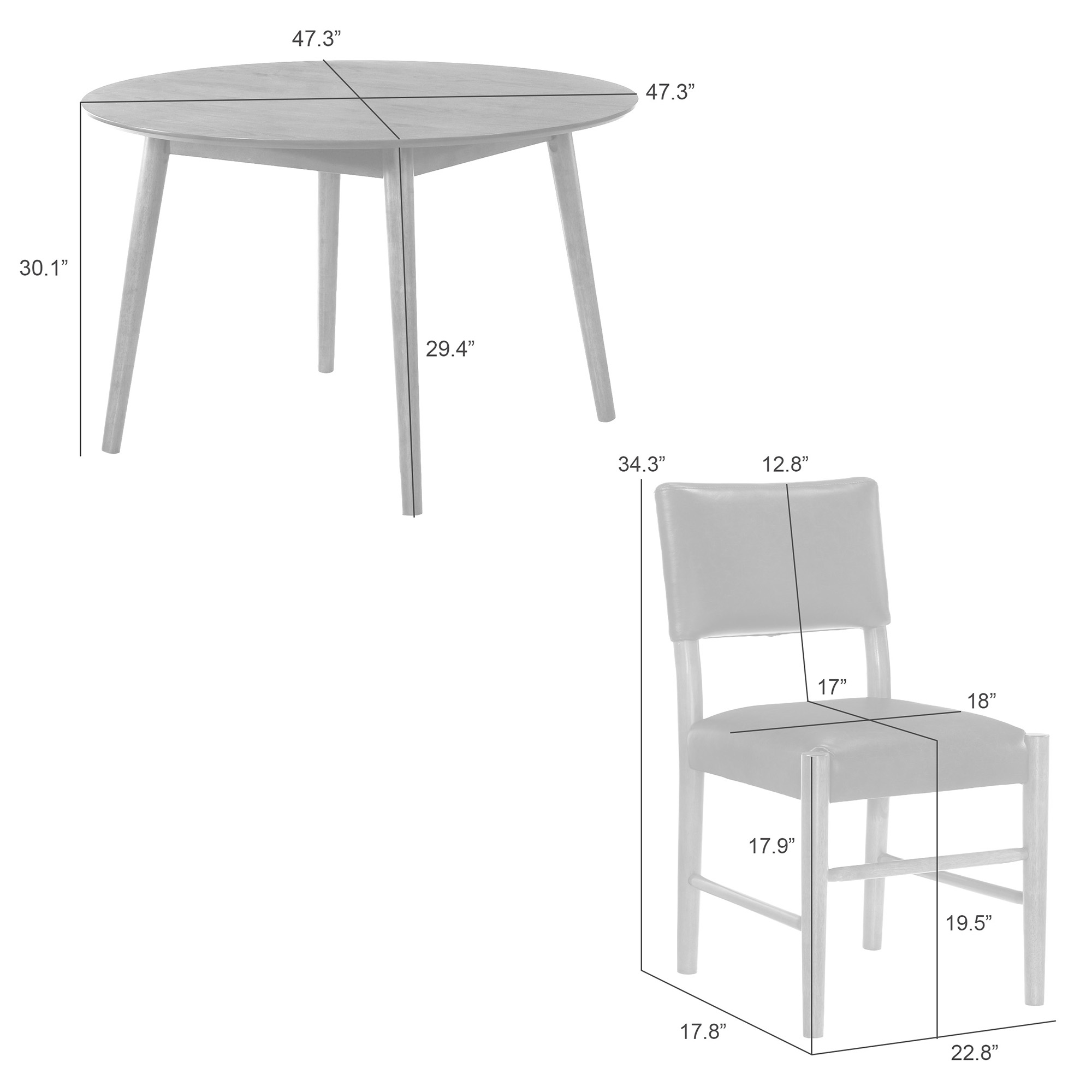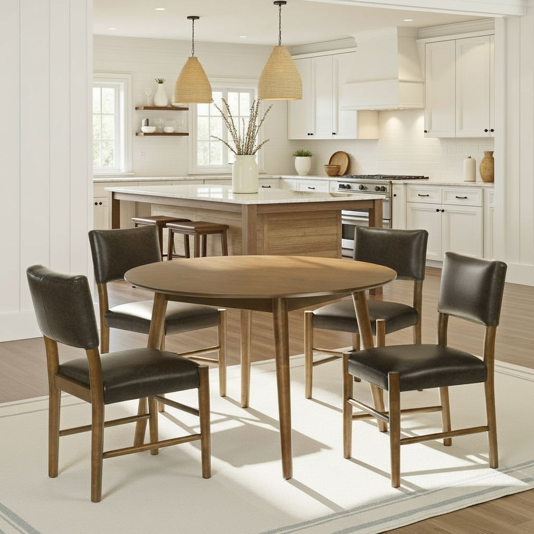 The Bennet 5-Piece Dining Set combines timeless craftsmanship with refined modern comfort, creating a stylish centerpiece for your home dining space. Featuring one 47-inch round dining table and four coordinating dining chairs, this set balances clean lines, warm tones, and premium materials for a look that s both contemporary and inviting. The Bennet Dining Table showcases a smooth, walnut finish that enhances the natural wood grain and adds rich visual depth. Crafted from solid natural wood, a sustainable and durable hardwood, the table s round top sits on four slender, tapered legs that give it a light, mid-century silhouette. The 47-inch diameter comfortably accommodates up to four people, making it ideal for cozy family meals or small gatherings. Its round shape encourages connection and open conversation while keeping a balanced, space-efficient footprint. The matching Bennet Dining Chairs bring both comfort and sophistication to the table. Wrapped in black vegan leather, the cushioned seat and backrest provide supportive, plush seating with a sleek matte texture that s soft to the touch yet easy to clean. The sturdy solid natural wood frame in the same warm oak finish ties the set together beautifully, ensuring durability and design harmony. With slightly rounded edges, a supportive back, and a minimalist silhouette, the chairs complement the table s mid-century appeal while offering everyday comfort for dining, work, or conversation. Together, this 5-piece set creates a cohesive and elegant dining atmosphere that works beautifully in both compact apartments and open dining rooms. Assembly is simple, and all components are built to last,supported by a 1-year limited manufacturer warranty for added peace of mind.