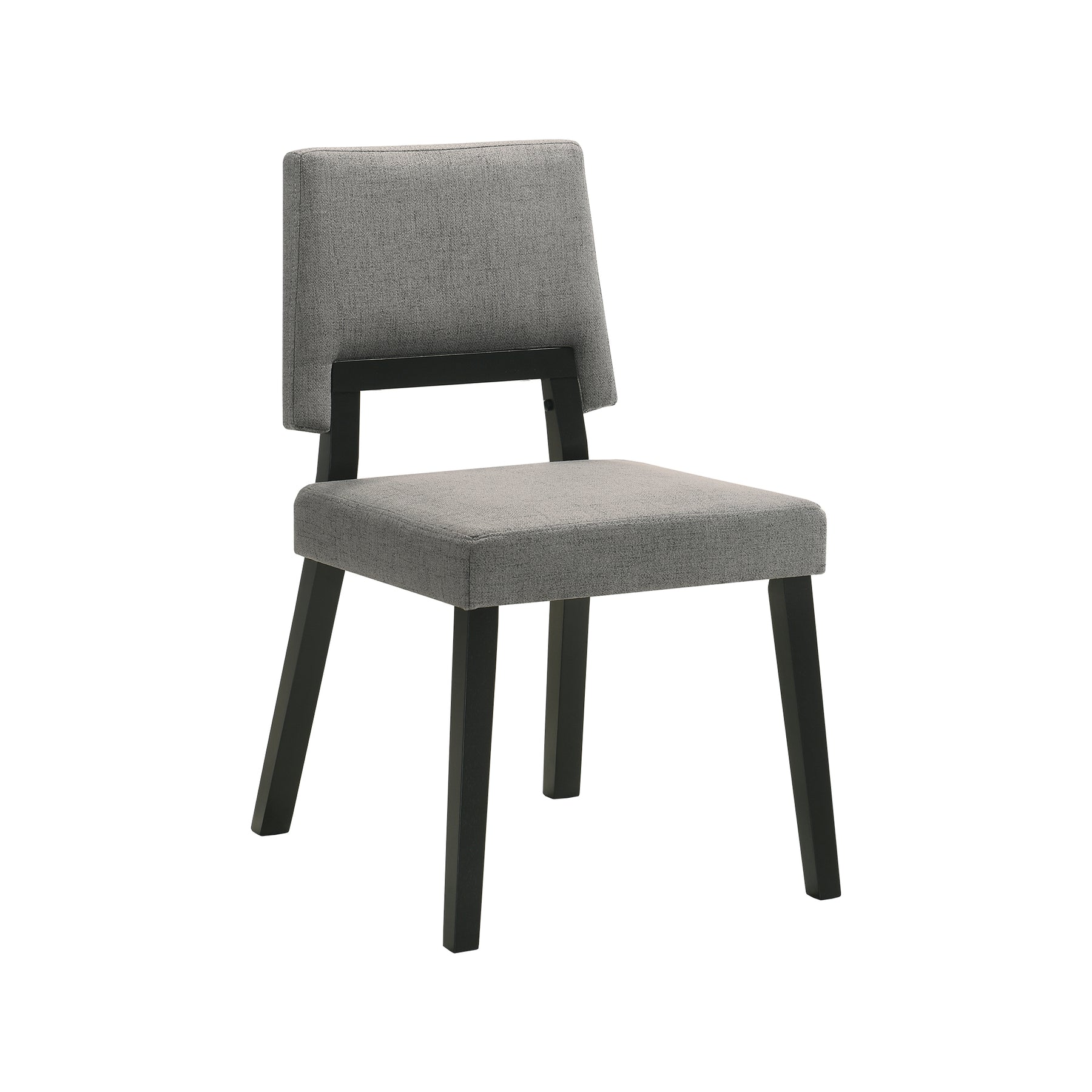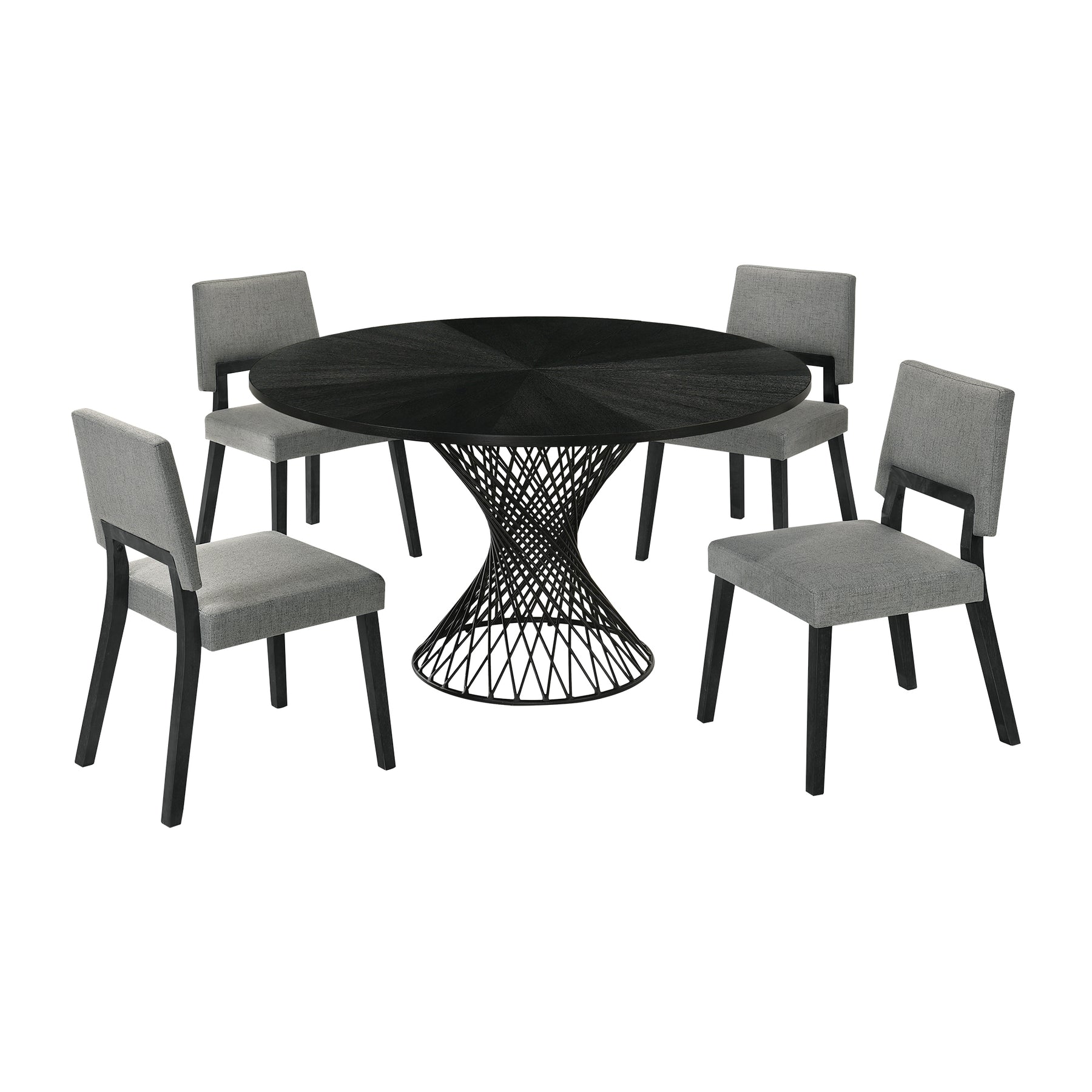 Add a cool modern touch to any dining room or kitchen with the Cirque Channell 5-piece Dining Set from Armen Living. This beautiful round dining set includes 1 Cirque dining table, and 4 Channell dining chairs. The 54-inch tabletop can easily accommodate more guests if needed. The unique style lends itself to a mid-century modern design theme, but it can easily integrate into any home. Defined by sleek proportions and elegant details, the chairs remain an inviting and versatile addition. The neatly tailored chairs feature an upholstered back and seat to deliver a comfortable stay, the back opening offers breathability. The wooden frame and gracefully angled legs add to the elegance and feature a subtly reclined back for optimal comfort. The spiral design on the pedestal base adds an artistic and eye-catching element to the table, this cohesive 5-piece dining table set is a work of art that will last for many years to come. The space efficient dining table lacks sharp corners allowing for better traffic clow and can accommodate more people if used in a smaller space. The Cirque Channell Dining Set is available in a beautiful black wood finish with charcoal fabric upholstery.Product Dimensions