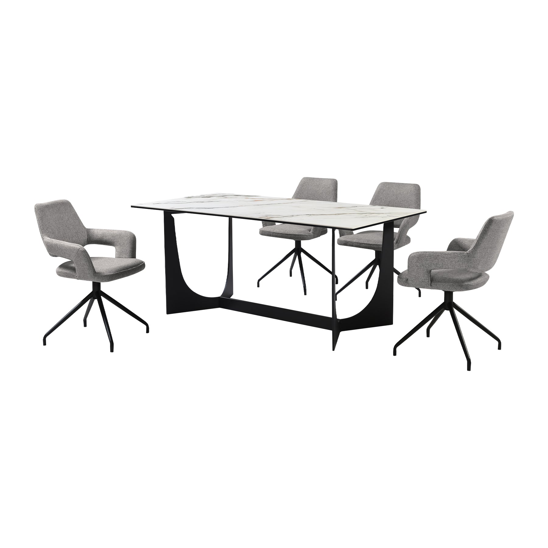 Gather friends and family for meals or game nights with the Esme Penny 5 Piece Dining Set with Grey Fabric Chairs. This set includes 1 Esme dining table and 4 Penny swivel dining chairs. Featuring a sleek and modern silhouette, this kitchen chair attains a chic and stylish presence in any room. The streamlined back elegantly flows into the sloping arms to offer a dose of comfort and style. A stylish cut-out in the back lightens the sculptural appeal of our dining room chair. Finished off with pyramid-shaped black metallic legs, the chair serves as a striking and sturdy accent for any corner. The dining table chair includes a tall back, padded arms, and a cushioned seat to deliver a cozy and comfortable stay. From offering a comfy seat in your kitchen to serving as a stylish and comfortable accent chair for your workspace, the Penny brings comfort and convenience to any room. It includes a 180-degree swivel function allowing you to follow conversations with ultimate ease. Clean lines and clever details lend a sophisticated and eye-catching presence to our dining table. It features a rectangular tabletop showcasing the rich textures of Golden Jade stone. Its trestle, black metal base showcases eye-catching curves to add soft elegance to your home. Our dining table can comfortably seat up to six individuals to complement both your formal and casual meals. With a versatile styling potential, the table can serve as the perfect spot to entertain and spend leisurely time in your formal or casual dining room or kitchen. It is crafted with durable and easy-to-care material. The Esme Penny dining set is available in 5 and 7 piece set configurations and features a black metal base with golden jade stone tabletop and grey fabric upholstered swivel chairs.Product Dimensions
