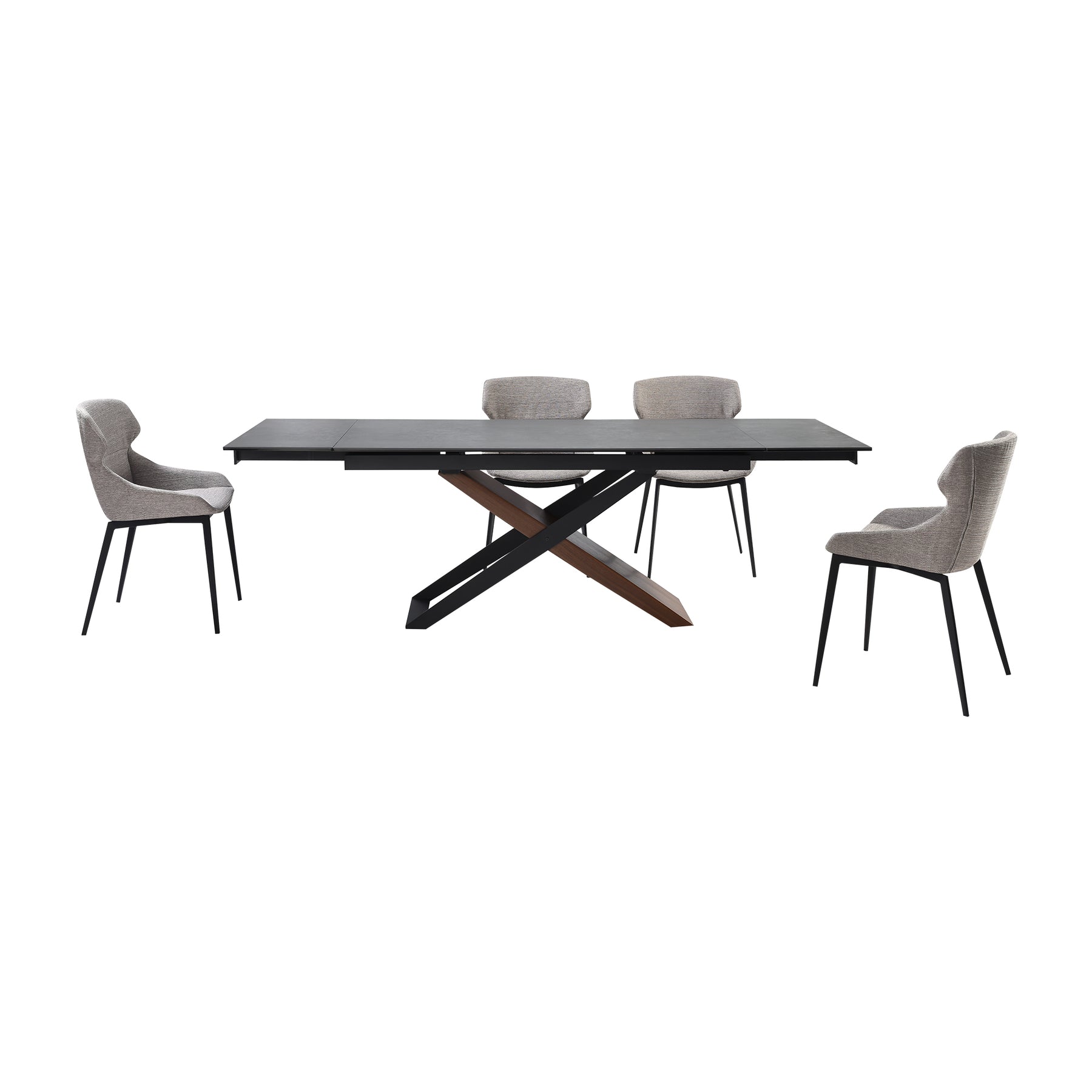 Function and style come together with the Milena Kenna extendable 5-piece dining set from Armen Living. The Kenna's sturdy steel frame includes a matte black metal finish that is beautifully complemented by the chair's stylish fabric upholstery. The Kenna's tall back is uniquely shaped, offering excellent upper back support. The chair's bucket seat is foam padded, assuring comfort and support while seated. The Kenna's straight leg design includes floor protectors, assuring that the chair will not damage or slip on floors when moved. With clean lines and dramatic construction, our long dining table serves as a stunning focal point. Its linear, rectangular tabletop is crafted from shadow stone for a versatile and sophisticated appeal. It is perched upon a cross-shaped base to capture the eye. The chunky wooden leg is covered in walnut veneer, creating a visual contrast with the airy black wooden frame. Our chic and stylish dining table can easily extend to comfortably seat up to six to eight individuals. Serving as the perfect fit for your casual meals and garnished dinners, the table remains a stunning complement to your dining room or living space. It supports durable construction and easy-to-care materials to serve as a long-lasting addition to your home or apartment. Extending from 63 inches to 94, this dining table can allow for more guests if needed. The Milena extendable dining table is available in Shadow Stone, Walnut and Black wood veneer. The Kenna dining chairs feature durable grey fabric upholstery and black metal legs.