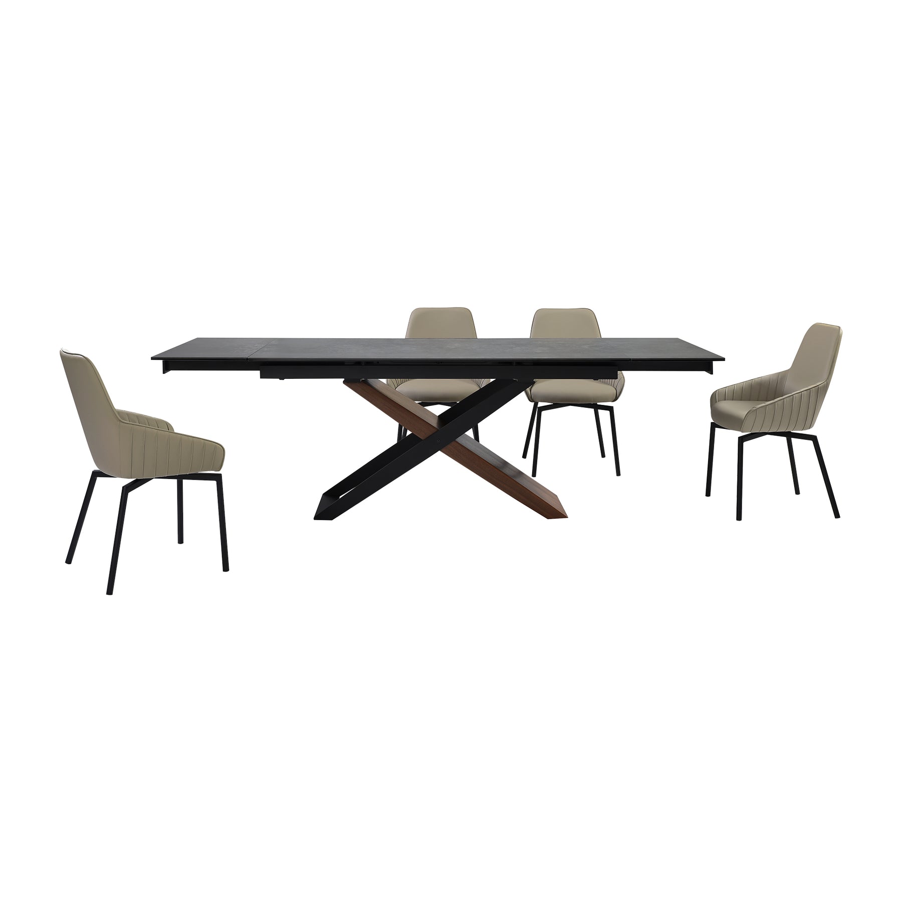 Bring friends and family together in a stylish fashion with the Milena Shilo 5 Piece Extendable Dining Set with Faux Leather Chairs. This 5 piece dining set includes 1 extendable Milena dining table and 4 Shilo faux leather swivel dining chairs. The refined and shapely silhouette of the kitchen chair is updated with stunning details to amp up the style of your home. The back and arms showcase clean lines and sleek curves to attain a sophisticated appeal. A stunning channel stitch detail on the arms adds charm and character to our modern dining chair. It is perched upon slender black metallic legs to serve as a welcoming and chic addition. The dining table chair includes a high back that elegantly swoops down to hug the back. Finished off with a generously cushioned seat, the dining room chair offers exceptional comfort and support. It can bring style and comfort anywhere from your kitchen, lounge, dining area, or home office. The Shilo accent chair also includes a 180 degree swivel function enabling you to enjoy your meals and conversations to the fullest. It is upholstered in UV and stain-resistant faux leather which does not crack or fade easily to provide easy care and maintenance. With clean lines and dramatic construction, our long dining table serves as a stunning focal point. Its linear, rectangular tabletop is crafted from shadow stone for a versatile and sophisticated appeal. It is perched upon a cross-shaped base to capture the eye. The chunky wooden leg is covered in walnut veneer, creating a visual contrast with the airy black wooden frame. Our chic and stylish dining table can easily extend to comfortably seat up to six to eight individuals. Available in 5 or 7 piece set configurations, this beautiful 5 piece extendable dining set features a shadow stone, walnut and black wood veneer table and your choice of taupe grey or champagne faux leather chairs.Product Dimensions