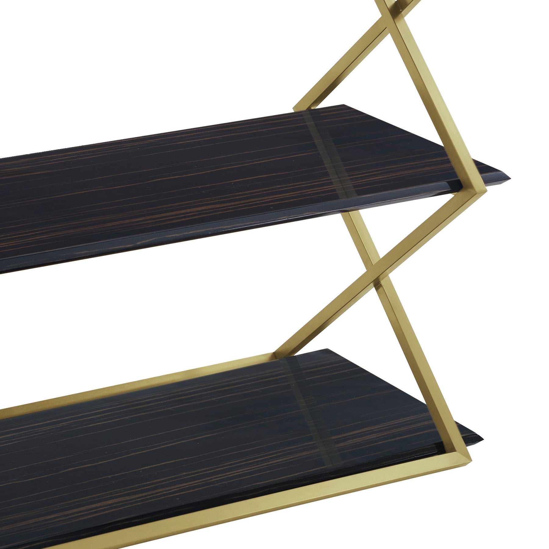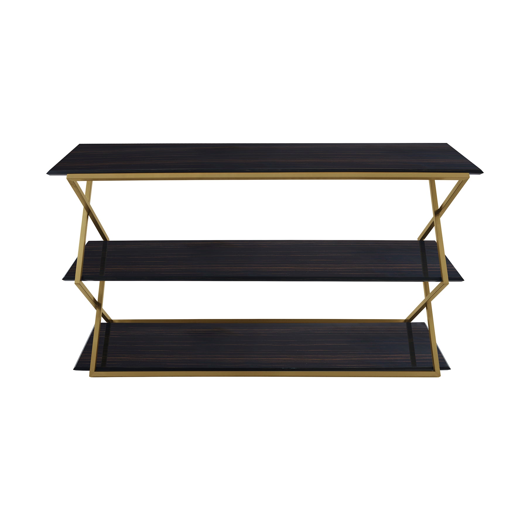 The Westlake Dark Brown Wood and Brushed Gold Console Table from Armen Living will help reduce clutter in your entryway or living room area and upgrade your home decor! The Westlake table features three tiers of resting shelves that maximize your storage space - giving you ample surface area to place your favorite personal items or decorative centerpieces. The wood of the console table is waterproof and wear-resistant, fighting off everyday wear and tear and giving you years of enjoyment. The craftsmanship shown through the design of the table is very apparent - the rich gold accents, the unique x-shape frame, and the gorgeous wood all contribute to this special piece.Product Dimensions