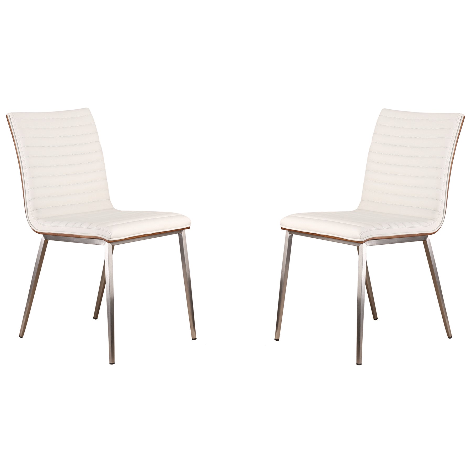 The Armen Living Café contemporary dining chair is a perfect statement piece for any modern dining room. This clean, elegant chair combines a faux leather upholstered, walnut veneer seat with an exquisite brushed stainless-steel frame. This wonderful combination of top of the line materials makes the Café a standout piece. This is simple but add a luxurious feel and design to any room in your home. The medium high cushion back is ideal for posture alignment and an unmatched support for days on end. The smooth and soft upholstery will keep you at ease all day, with detailed horizontal lines stitching for texture look and feel. The accent walnut back add to the overall modern look with a contemporary flare. The foundation of the product is supported by brushed stainless steel for a sturdy and modern look without comprising practicality and functionality of this item. This item is a versatile piece that can be ideal for dining, kitchen or even home office desk chairs. This product ships in one box with easy and quick set up. We stand by the quality, the craftsmanship and the integrity of our product by offer 1-year warranty for all our products. While perfect when set around a table, this versatile and stylish piece of furniture can easily double as additional seating in any room in the house. The Café is available in gray and white. Product Dimensions: 17"W x 22"D x 34"H.Product Dimensions