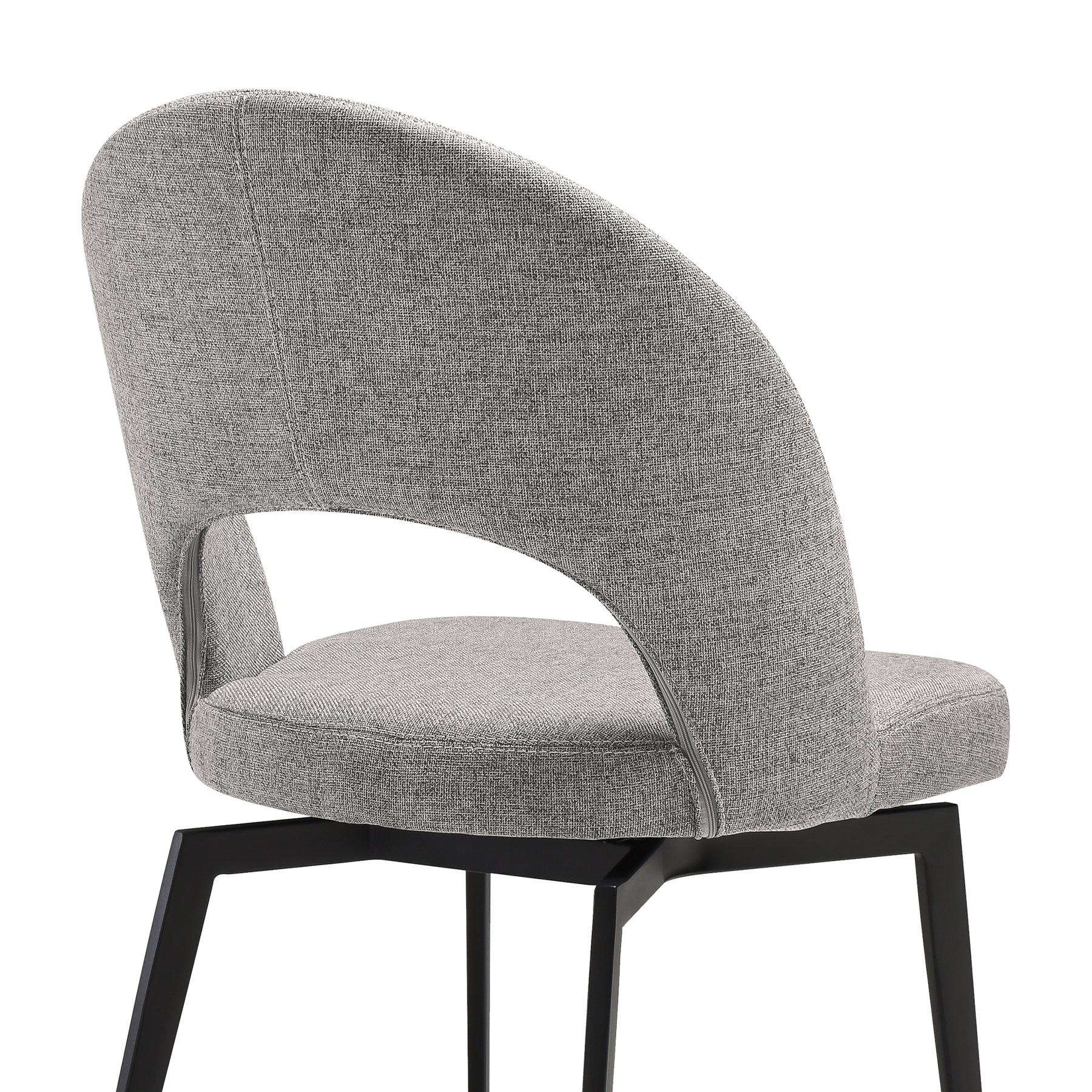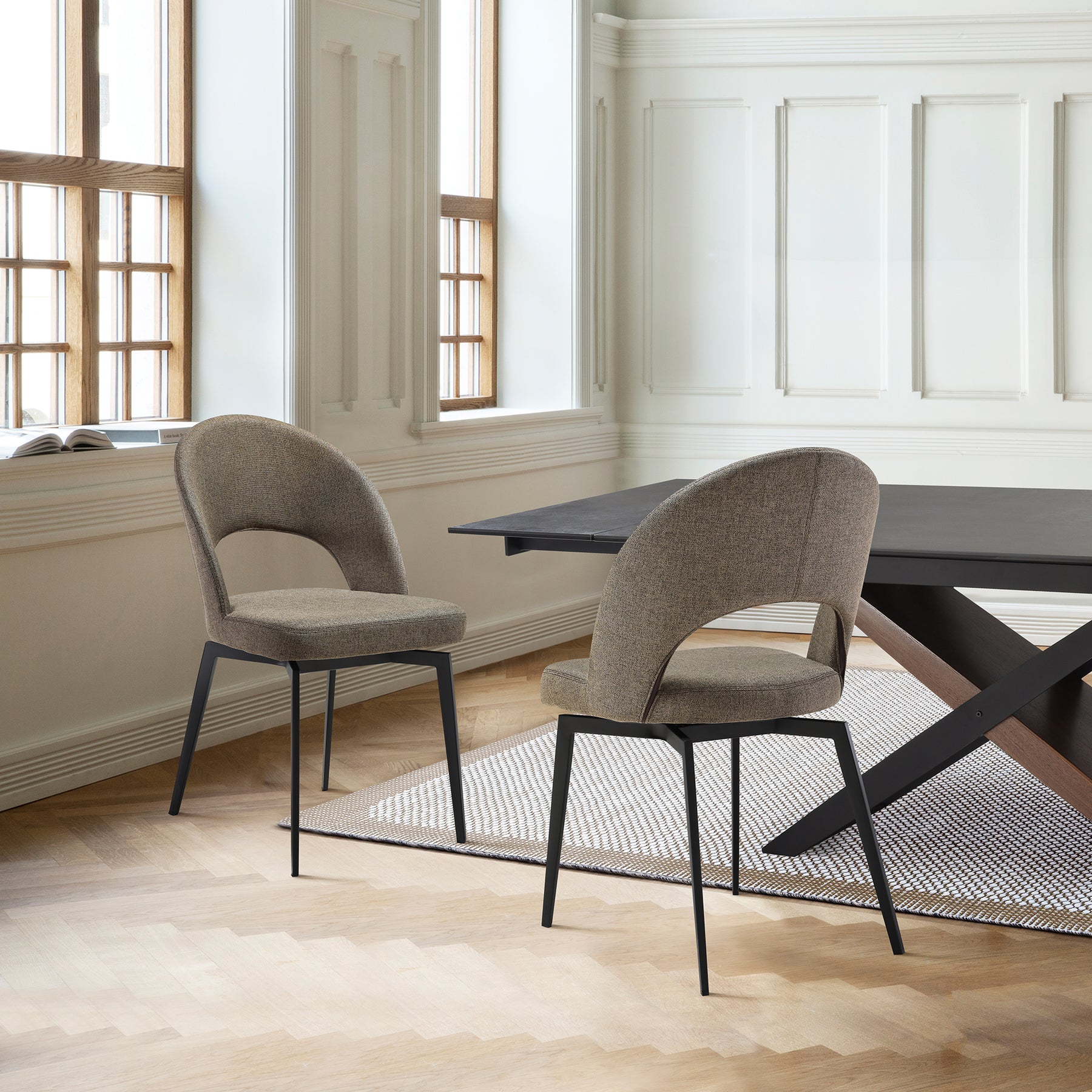 Elevate your home with the modern charm and elegance of our Lucia Upholstered Swivel Dining Chairs - Set of 2 in Fabric with Black Metal Legs. Beautifully minimalistic, our dining chair stands out with a refined and striking silhouette. A sleek cut-out and slender black metallic legs complete the modern and sophisticated appeal of the kitchen chair. It's ergonomically sculpted back delivers exceptional comfort, supporting you in just the right places. The back and seat are both generously padded to bring a dose of comfort to your formal and casual meals. Our dining room chair can also serve as a comfy seat in your home office or provide a comfortable spot to relax in your living room. The dining table chair also includes a 180 degree swivel function allowing you to change directions and follow conversations with ultimate ease. It is upholstered in performance fabric for easy care and maintenance. Our Lucia dining chair is available in your choice of Grey or Brown Fabric Upholstery with Black Metal Legs to perfectly befit your modern or contemporary home or apartment. These dining chairs are sold as a set of 2.Product Dimensions