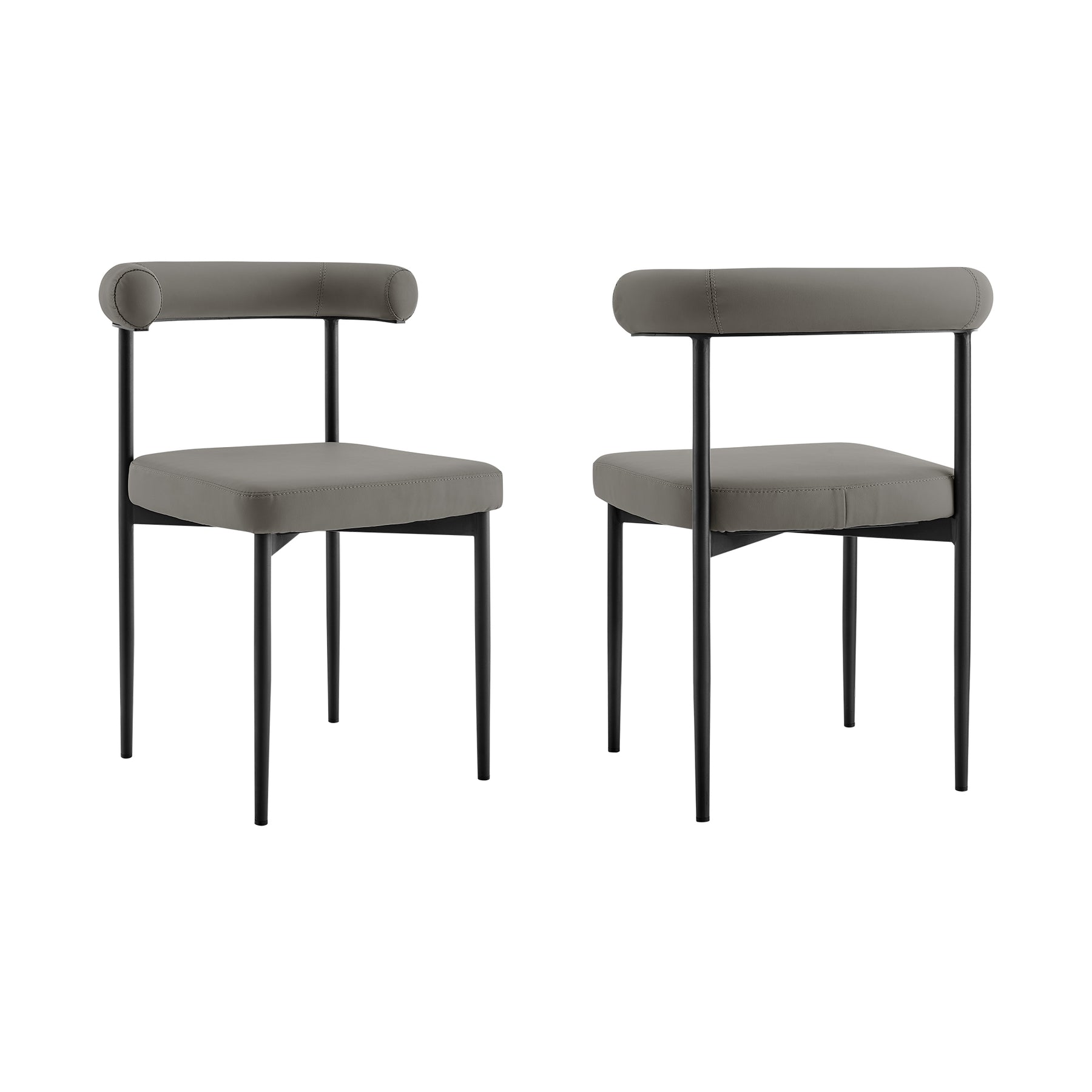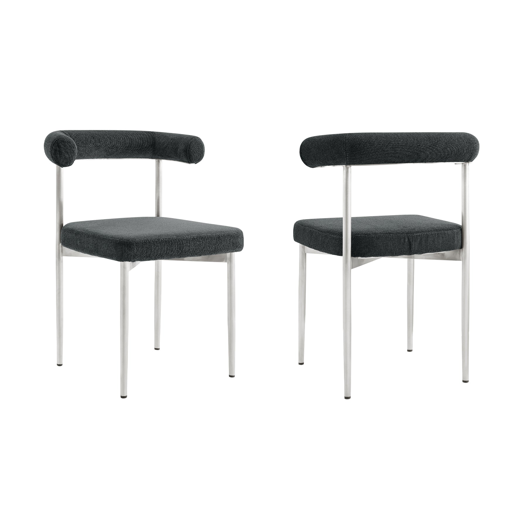 Bring effortless style and comfort to your home with our Shannon Dining Chair in Fabric and Metal - Set of 2 by Armen Living. This contemporary dining chair makes a sophisticated statement with its chic and refined style. A cylindrical cushion complements the curved backrest to offer perfect back support. The chair includes a generously padded seat, to provide a comfortable seating experience. It is covered in performance fabric to offer easy care and maintenance. Featuring a sleek and slender metallic frame, this dining chair lends effortless elegance to any corner. It can bring everyday charm to your eat-in kitchen and dining room. The Shannon chair can offer an easy-to-land spot anywhere from your living space to your home office. Its sturdy and durable construction allows years of use. Available as a perfect pair, the Shannon Dining Chair comes in brushed stainless steel with: Light Gray, Charcoal, Blue, or Taupe Fabric or matte black iron with: Thundercloud Gray fabric, Black fabric, Cream fabric, or Light Gray faux leather to effortlessly blend and complement your existing style and decor.Product Dimensions