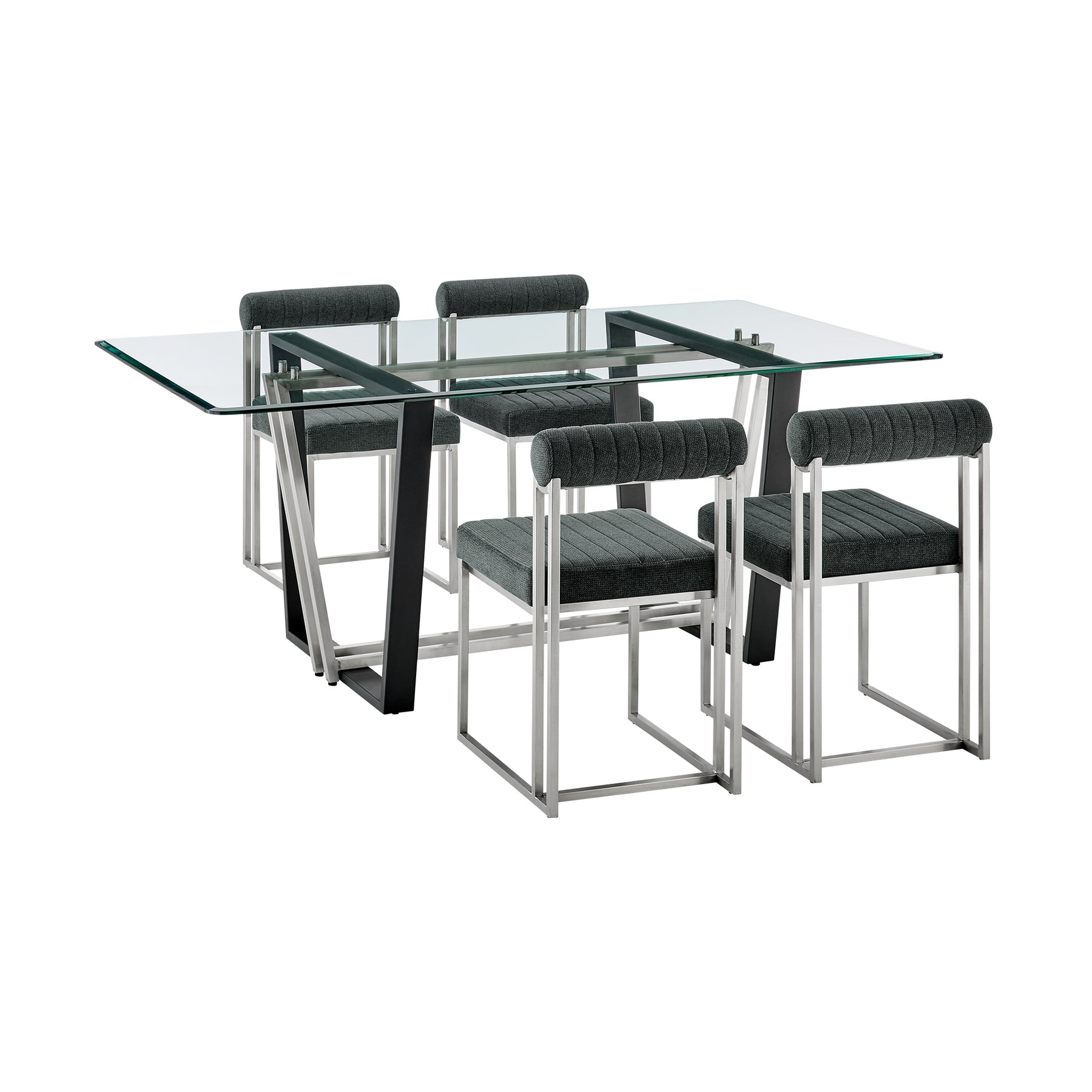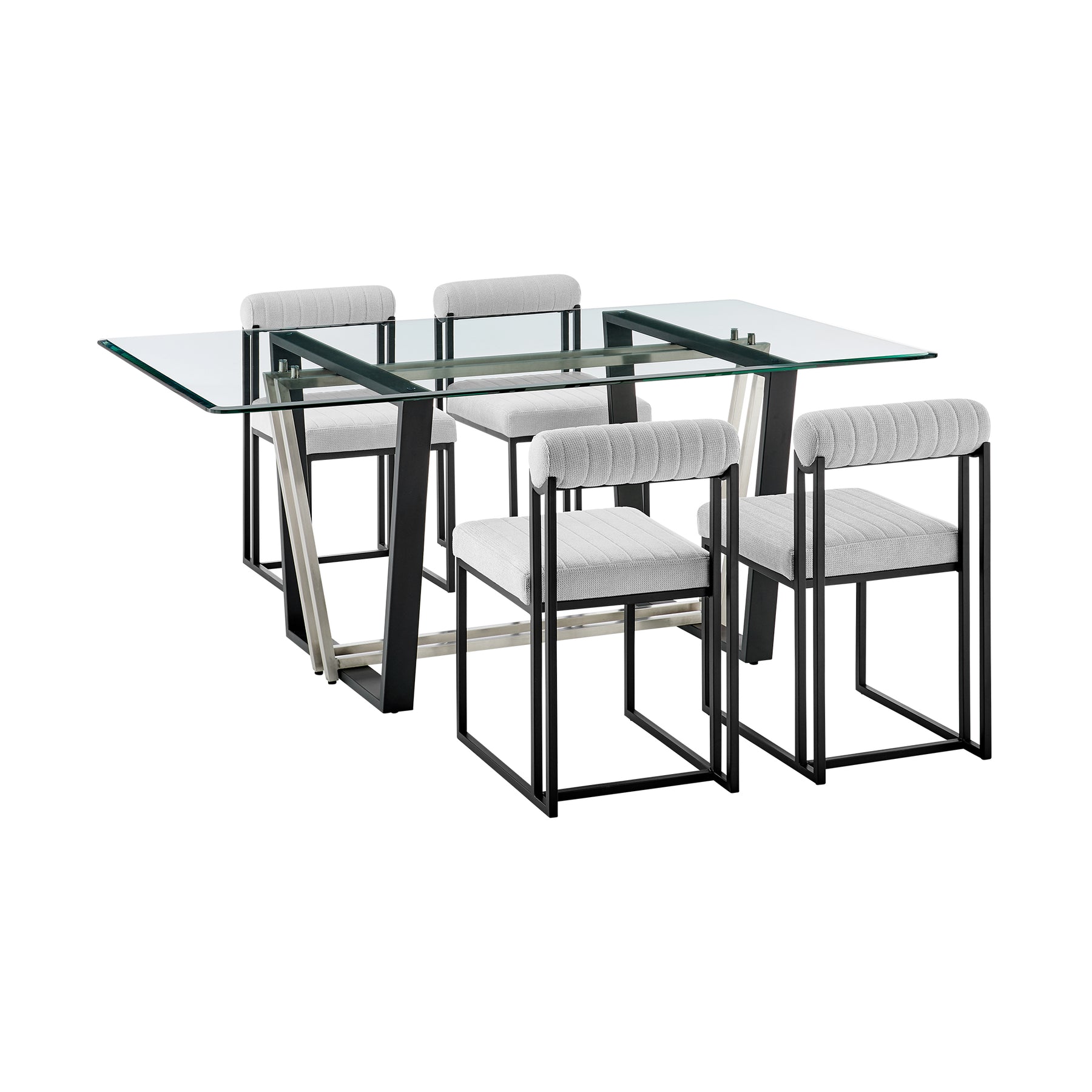 Give a sophisticated upgrade to your dining area with the Kai Anastasia Dining Set by Armen Living. This set includes 1 Kai Rectangular Glass Dining Table with Metal base and 4 Anastasia Upholstered Dining Chairs. The crisp and clean-lined design of our dining set offers modern drama and elegance. The rectangular, glass tabletop beautifully balances on a streamlined metal base. The sharp angles and contrasting finishes lend a touch of polish and definition to our dining table. It serves as a brilliant complement to our Anastasia dining chairs. The Anastasia's cushioned backrest and padded seat showcase a neat channeling detail that provides texture for a chic and inviting look. Creating a beautiful contrast with the sleek frame and comfortable cushions, these dining chairs are set to make a stylish impact. The chair is upholstered in performance fabric or smooth faux leather to offer easy care and maintenance. Together, this dining set can bring an elevated tone to your kitchen, dining room, or living space. It serves as the perfect spot to enjoy dinners, engaging conversations, and activities. With sturdy construction and high-quality materials, our dining set will continue to bring style and comfort to your home. The Kai Anastasia 5 Piece Rectangular Glass Dining Table Set is available in matching finishes and a variety of colors, or sold separately to achieve any look you desire..