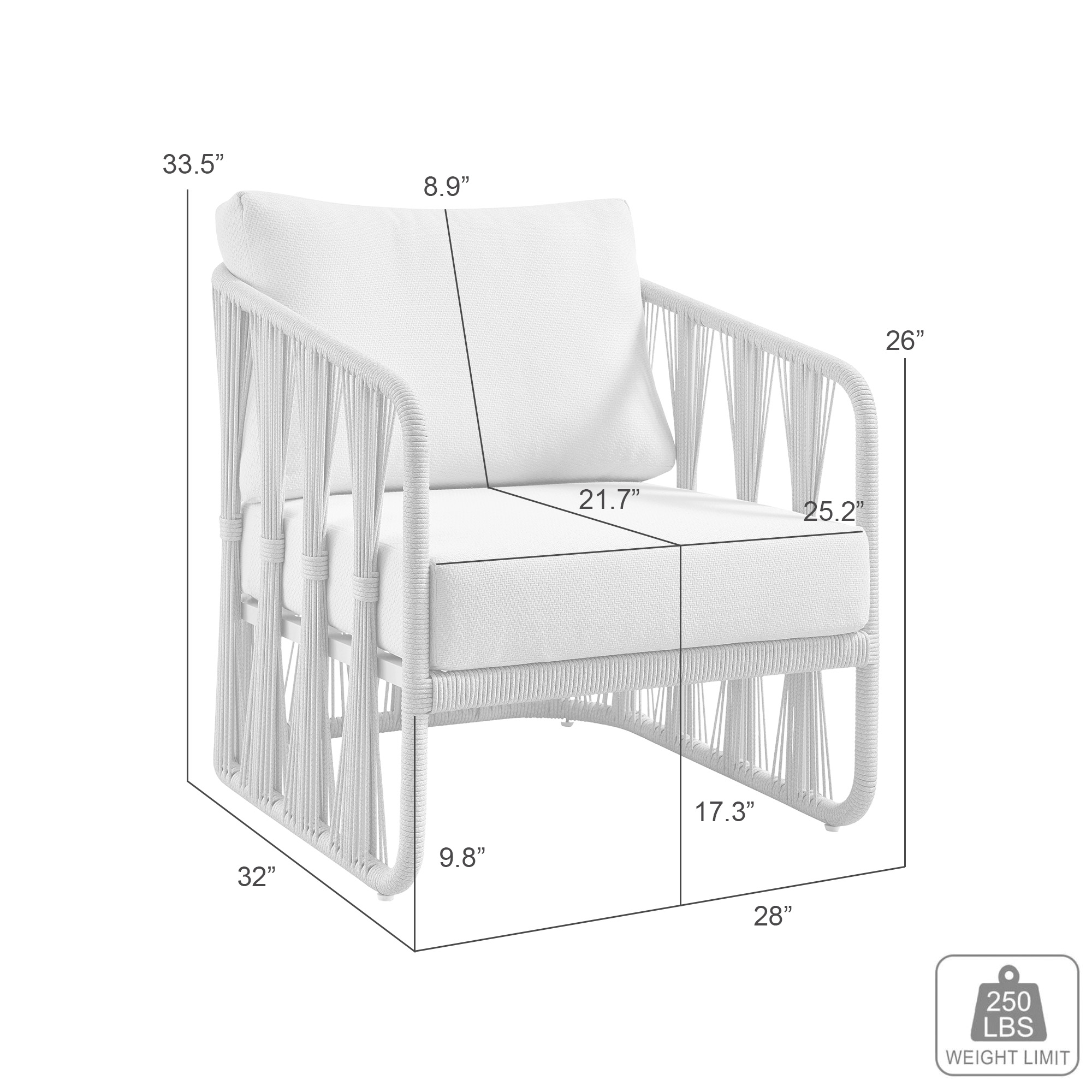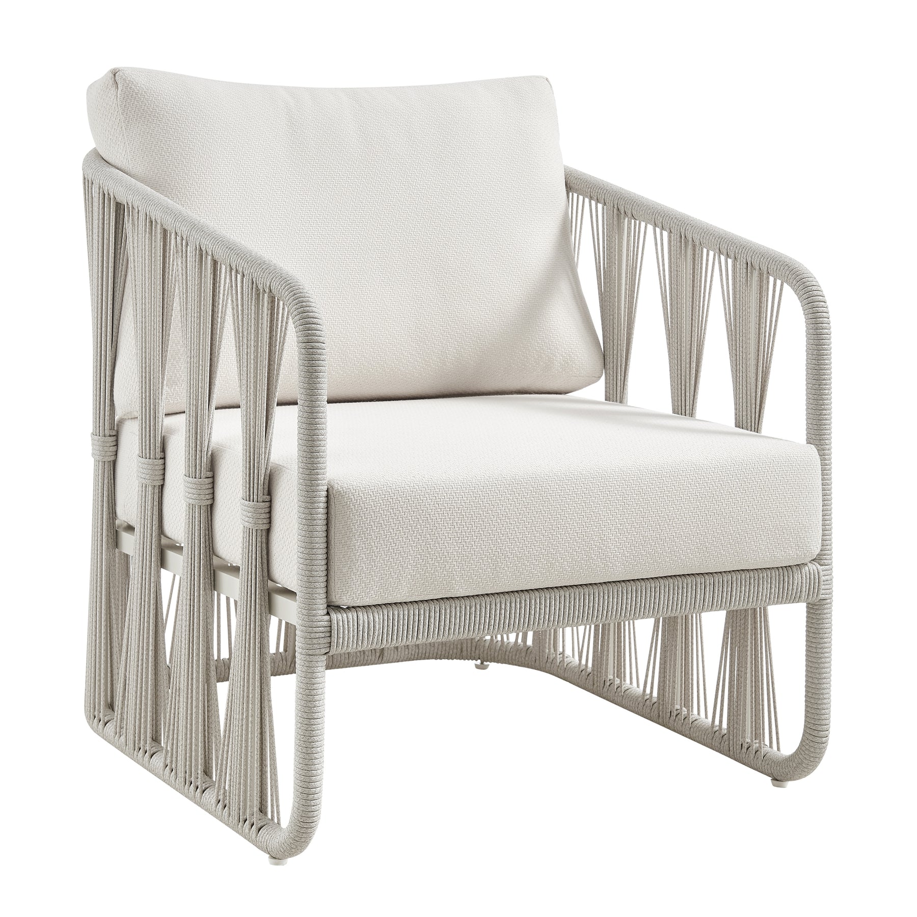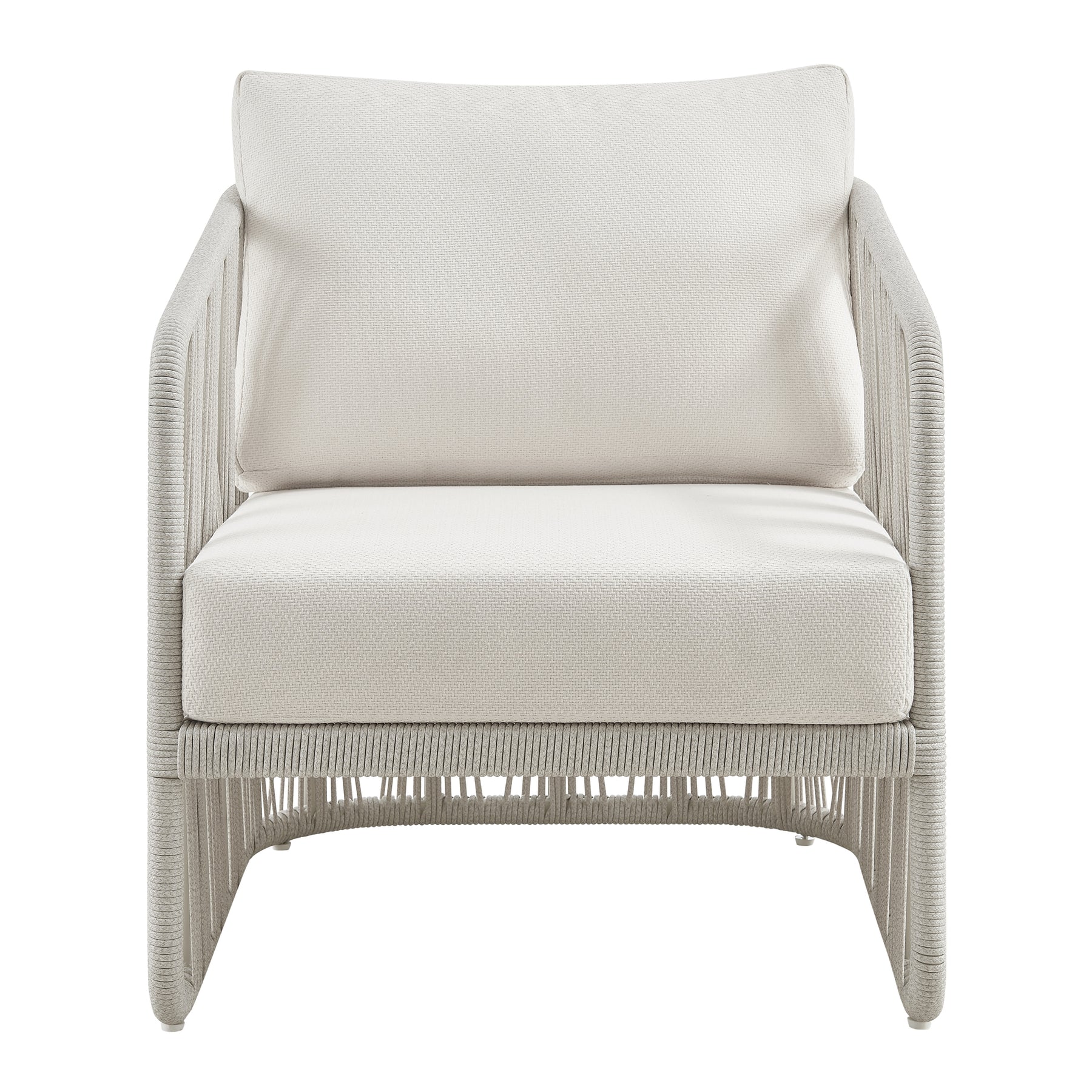 The Breeze Outdoor Club Chair brings a refined, resort-inspired presence to any open-air space, offering a generous seat for relaxed lounging, reading, or casual conversation. With its comfortably scaled proportions, supportive cushions, and gently angled back, this chair becomes an inviting focal point for patios, decks, balconies, and poolside seating areas. Clean lines and a soft neutral palette allow it to blend easily with a wide range of outdoor decor styles, from coastal to contemporary and modern minimalist spaces. Built on a cream powder coated aluminum frame, the chair balances visual lightness with sturdy construction suited to outdoor living. The frame outlines a calm, structured silhouette with open sides and broad arm contours that define the seat. Greige ropes are carefully laced along the sides, introducing texture, pattern, and a sense of crafted detail while maintaining an airy, modern character. Pearl olefin upholstered cushions rest on the seat and back. Olefin is a functional outdoor upholstery fabric that helps resist unwanted surface buildup on the fabric, supporting a fresher, more balanced feel on frequently used cushions and making everyday upkeep easier. Inside the cushions, quick dry foam is used for outdoor suitability, helping the seating feel ready for regular use in open-air spaces. Perfect as a single accent chair or arranged in multiples around a coffee table or fire feature, the Breeze Outdoor Club Chair brings easy, elevated comfort to outdoor lounges, covered terraces, and stylish hospitality settings where relaxed seating and a polished look are equally important.Product Dimensions