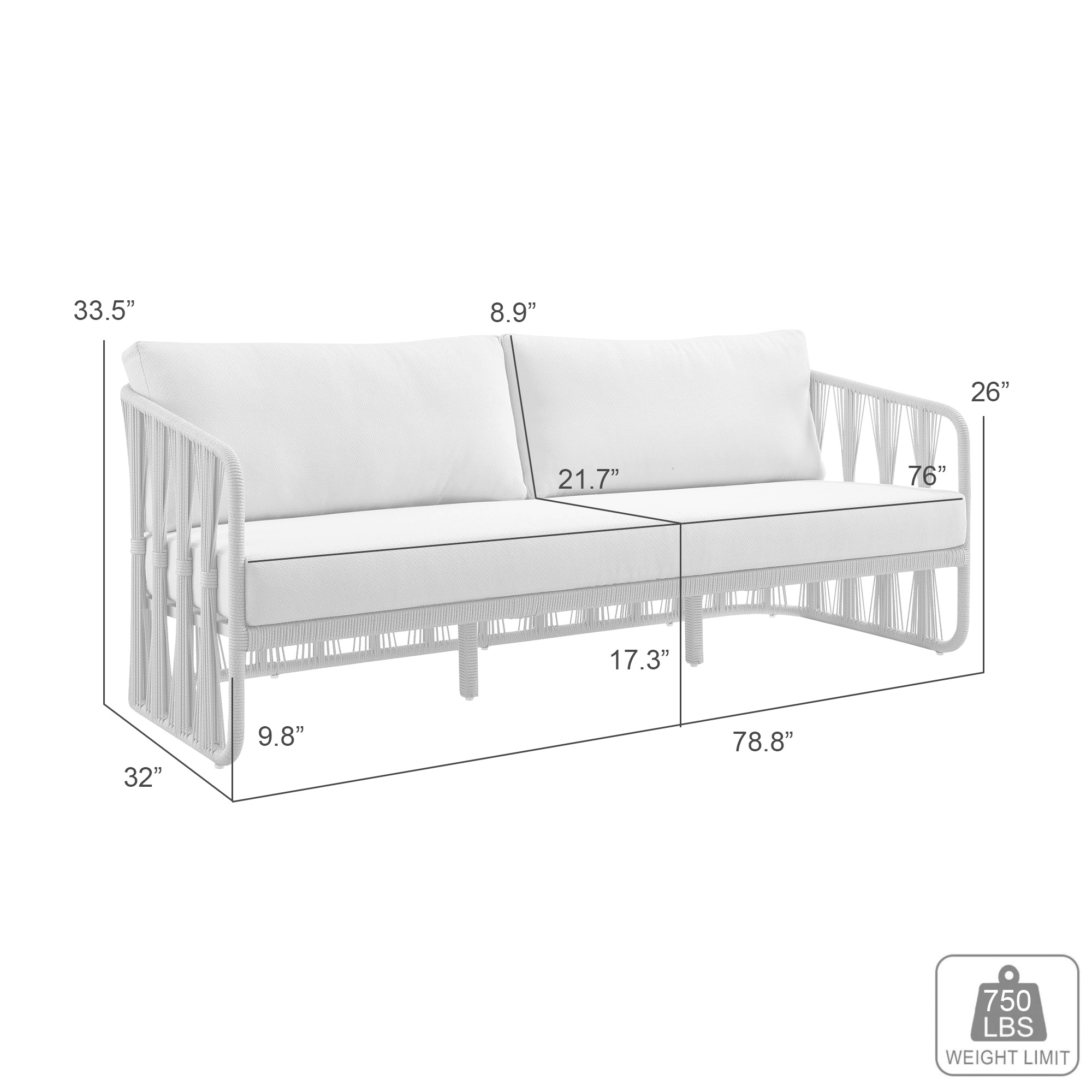 The Breeze Outdoor Sofa is designed to anchor an outdoor lounge space with an easy, refined presence. With its wide three seat layout, supportive cushions, and open rope back, it invites relaxed conversation on a terrace, poolside deck, or garden patio. Clean lines and a soft neutral palette pair effortlessly with a variety of outdoor styles, from coastal inspired to modern minimalist. Crafted for real outdoor living, this sofa features Pearl Olefin upholstered cushions, a natural functional fabric that resists unwanted surface buildup in open air settings. Quick dry foam in the seat and back helps water drain and moisture dissipate more quickly after exposure to the elements. The frame is built from aluminum with a smooth cream powder coated finish, giving a light, contemporary look while helping protect the structure. Greige rattan ropes are neatly hand wrapped along the back and arms, adding texture, visual interest, and an airy feel that keeps the profile light. Perfect for anyone seeking a polished yet relaxed outdoor seating piece, this sofa suits morning coffee, sunset gatherings, and every slow afternoon in between.Product Dimensions