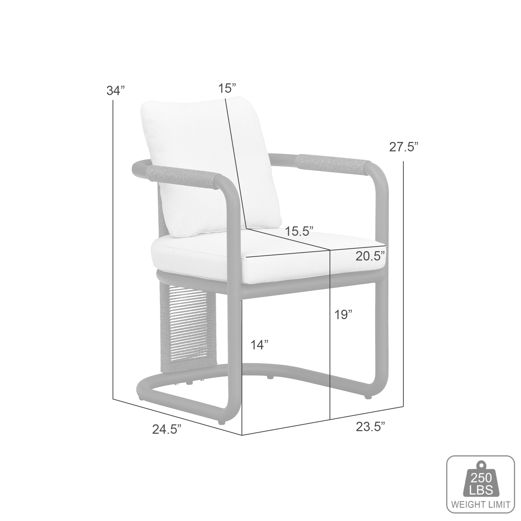 Elevate your al fresco dining experience with the Dorado Outdoor Dining Chairs. Sold as a set of two, each chair features a sleek gray powder-coated metal frame accented with handwoven rope detailing and plush off-white olefin cushions. Designed for comfort and durability, these chairs combine modern design with weather-resistant functionality for stylish outdoor seating.Product Dimensions