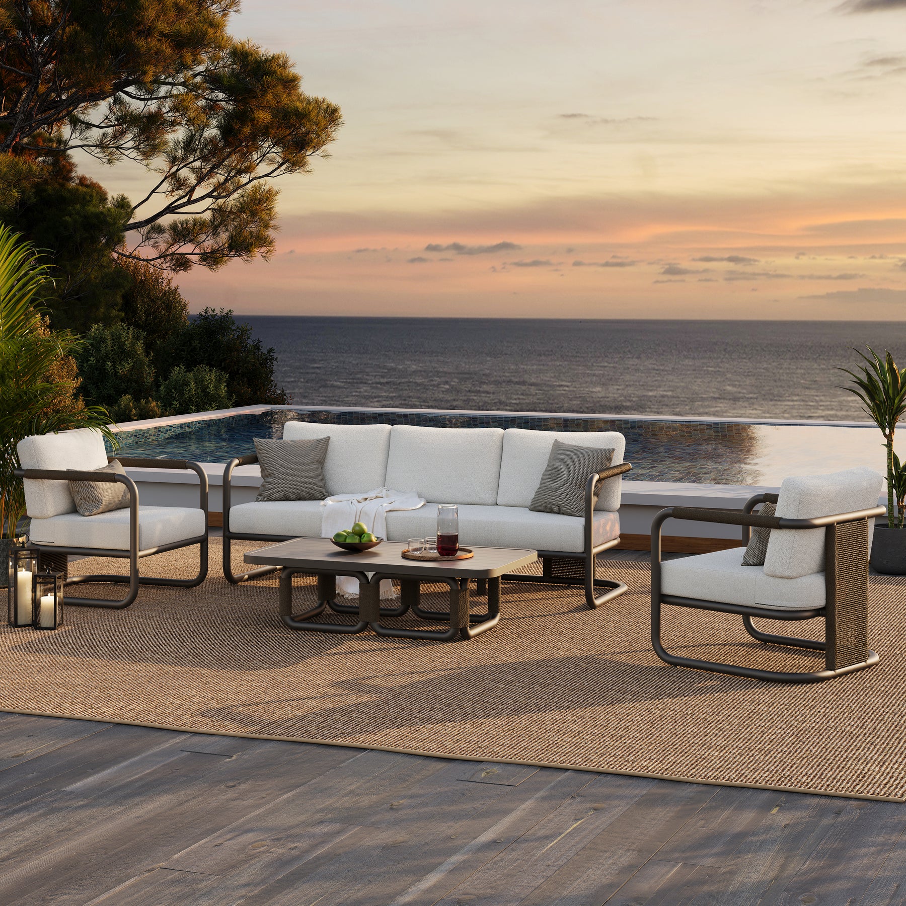 Transform your patio or deck into a relaxed social hub with the Dorado Outdoor 4-Piece Conversation Set. Designed for casual gatherings, this ensemble offers a three seat sofa, two lounge chairs, and a matching coffee table, creating a cohesive space for morning coffee, evening drinks, or quiet reading outside. Clean, low profile lines and a calm neutral palette blend easily with a wide range of outdoor decor styles. Built with a sturdy aluminum frame in a powder coated gray finish, each seat is wrapped with rattan detailing for a warm, textured look. Thick seat and back cushions feature olefin upholstery with quick dry foam filling, supporting comfortable lounging while standing up to outdoor use. The rectangular coffee table echoes the same aluminum and rattan mix, providing a stable surface for trays, decor, or everyday essentials. Perfect for a modern terrace, poolside lounge, or small garden patio, this set anchors an inviting outdoor living space you will return to day after day.