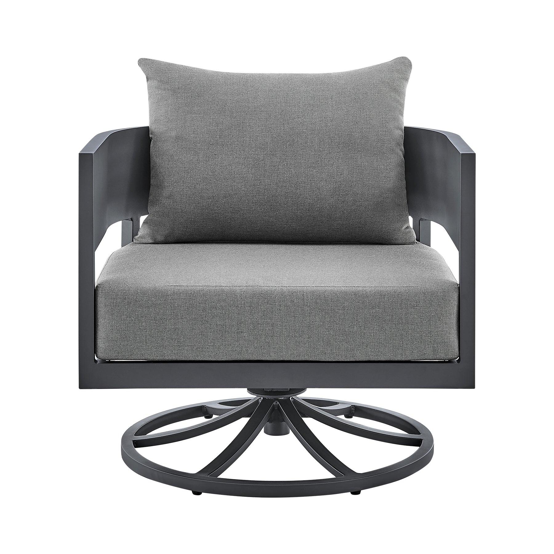 Lounge in style with the Menorca Outdoor Patio Swivel Rocking Chair in Grey Aluminum with Cushions. It’s 360-degree swivel and rocking motion allows optimal mobility and convenience. Featuring a modern and elegant design, this outdoor chair remains a versatile addition to any setting. This swivel chair embraces a barrel silhouette to wrap you in comfort. The dark grey cushions are removable and feature a zipper closure, making clean up a breeze! The Menorca features high-quality materials that come together gracefully for a look that is well-suited to your backyard, patio, pool area, garden, or screened in porch. Lightweight and durable aluminum framework make the Menorca outdoor chairs with cushions are easily portable and feature a multi-layer powder coating for further effective protection from the elements and everyday wear and tear. Without having to worry about UV, rust, or weather damage, the Menorca swivel rocker is ideal for your home, regardless of your location.