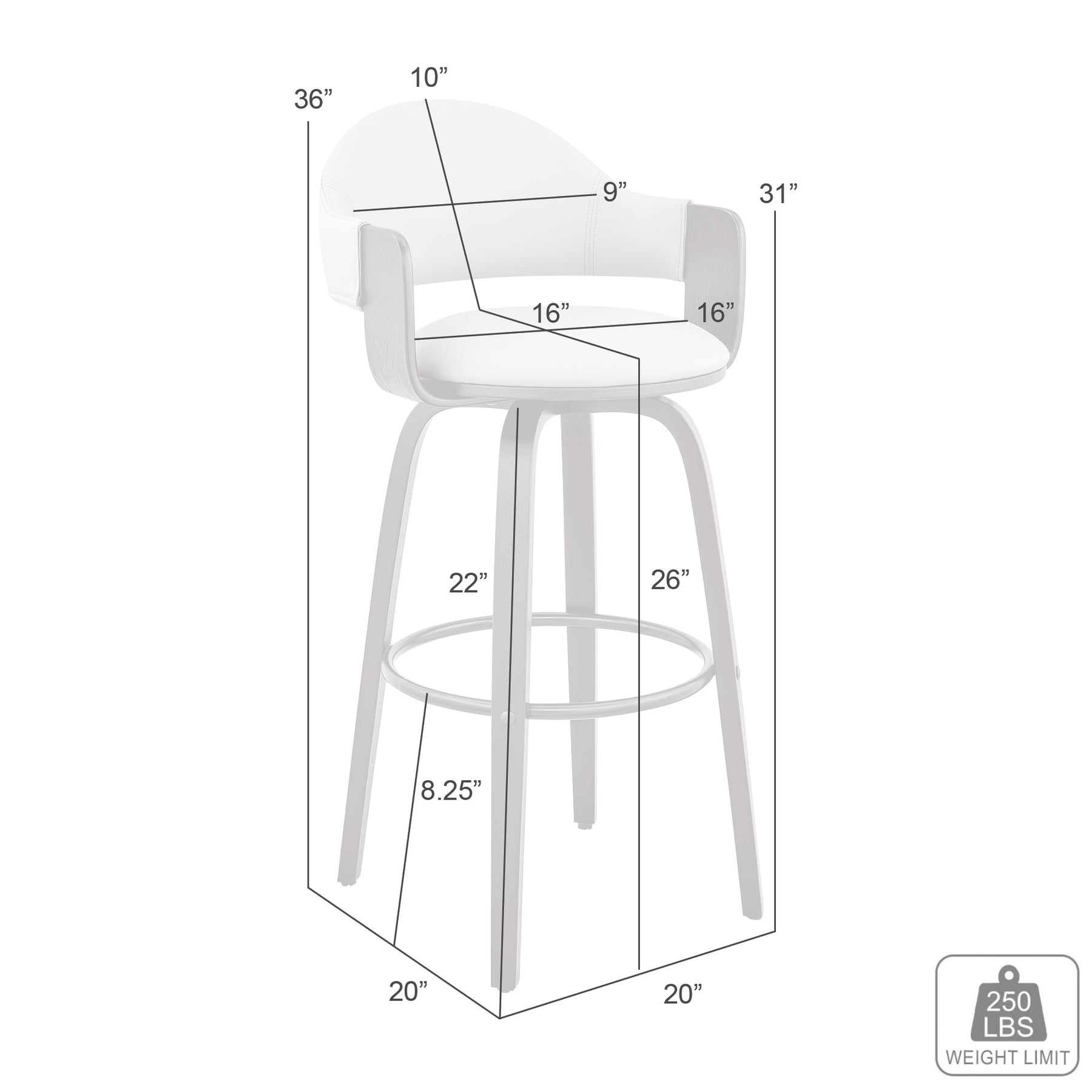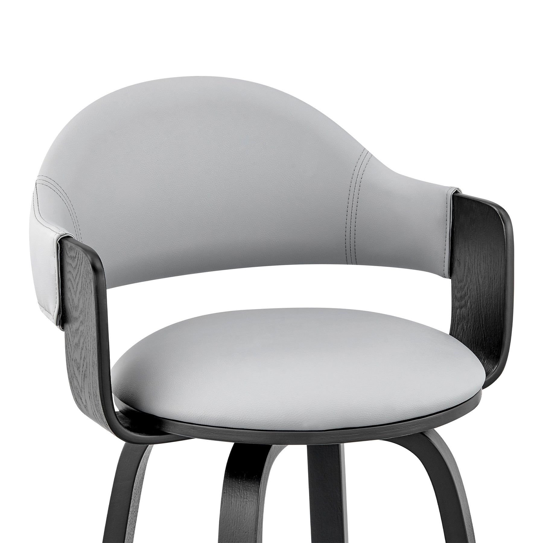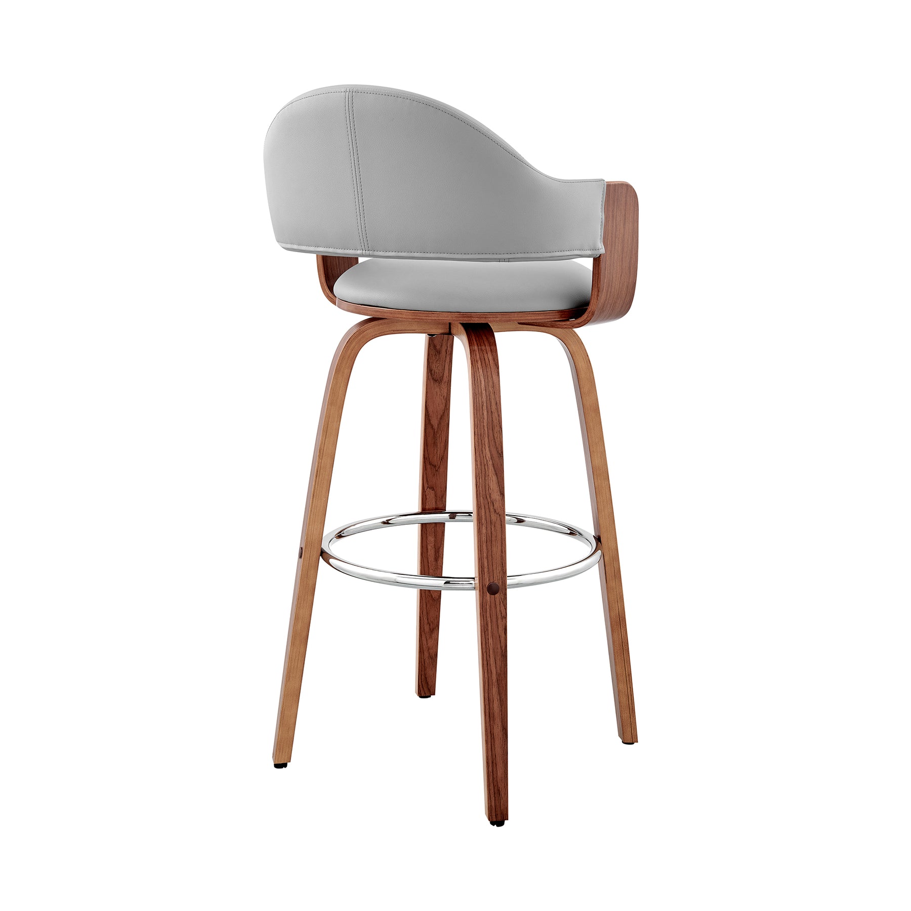 The Daxton 26" Gray Faux Leather and Black Wood Bar Stool will complement the existing decor in your home and help elevate it to the next level. The Daxton features a 360-degree swivel function that allows you to keep the conversation going in every direction. The Daxton is also crafted with a ring footrest - meaning you can relax your feet regardless of the direction you decide to turn! The plush seat cushion is padded with high-density foam that will provide you with immense comfort. The Daxton is available in your color choice of Gray, cream, or brown faux leather with walnut wood or Gray faux leather with black wood. Product Dimensions: W:20 x D:20 x H:36 x SH:26Product Dimensions