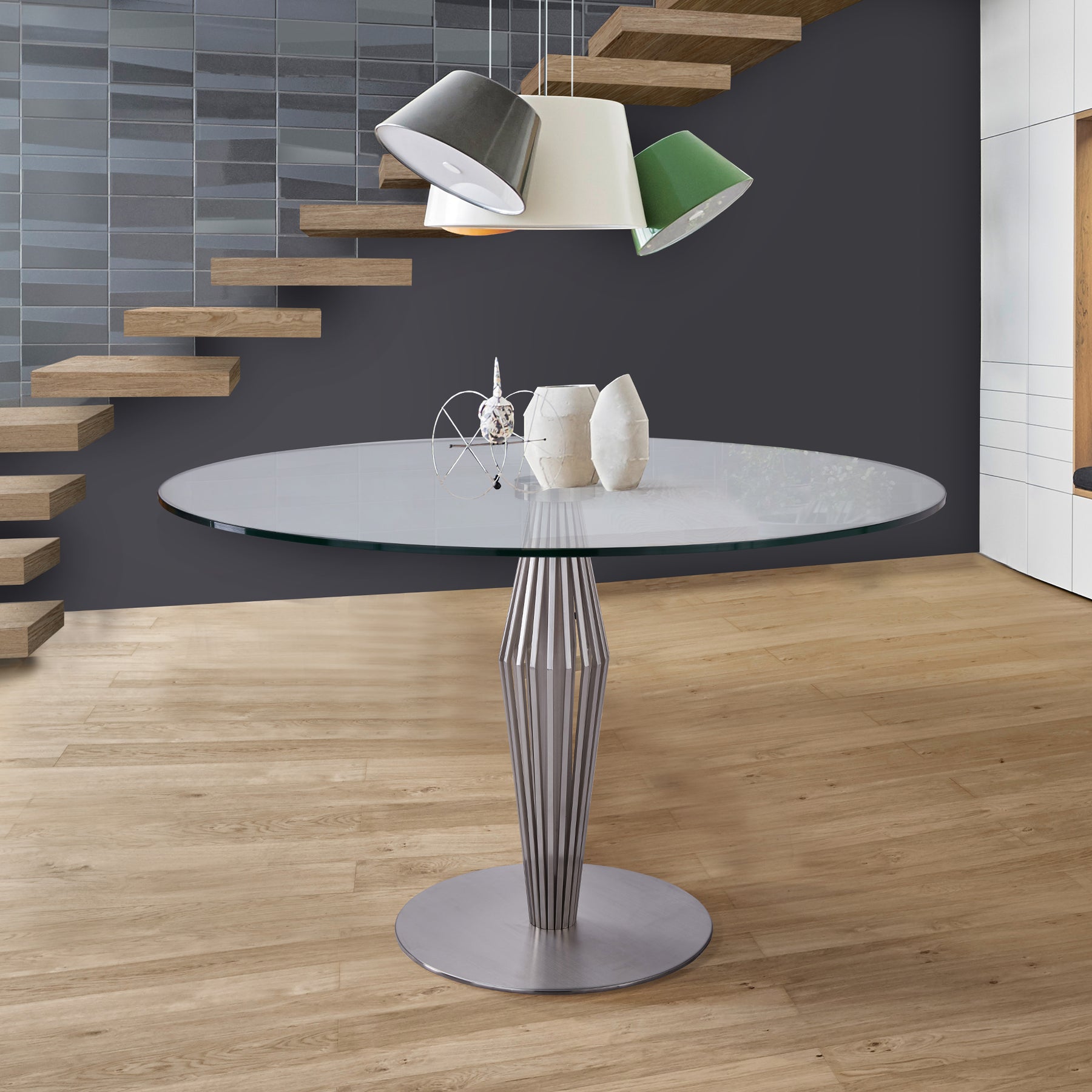 The Lindsey round dining table with 48" clear tempered glass top with stainless steel base is a beautifully made table that will add style and beauty to your dining area. The pedestal base of this dining table is beautifully constructed of stainless. It is sturdy, built to stun, and never makes for a boring dining experience. This table will absolutely grab attention at your next social gathering. This table seats up to five people, giving you ample tabletop space. The Lindsey adds a touch of sophistication and glamour to your home with this modern dining table. Classically styled, this timeless pedestal table perfectly complements a modern and contemporary home decor. This product ships in one box with an easy and quick set up. We stand by the quality, the craftsmanship, and the integrity of our product by offering a 1-year warranty for all our products. We want our customers to enjoy our product and we will always be there to help with our top-notch customer service support. Product Dimensions: 48"W x 48"D x 29. 5"HProduct Dimensions
