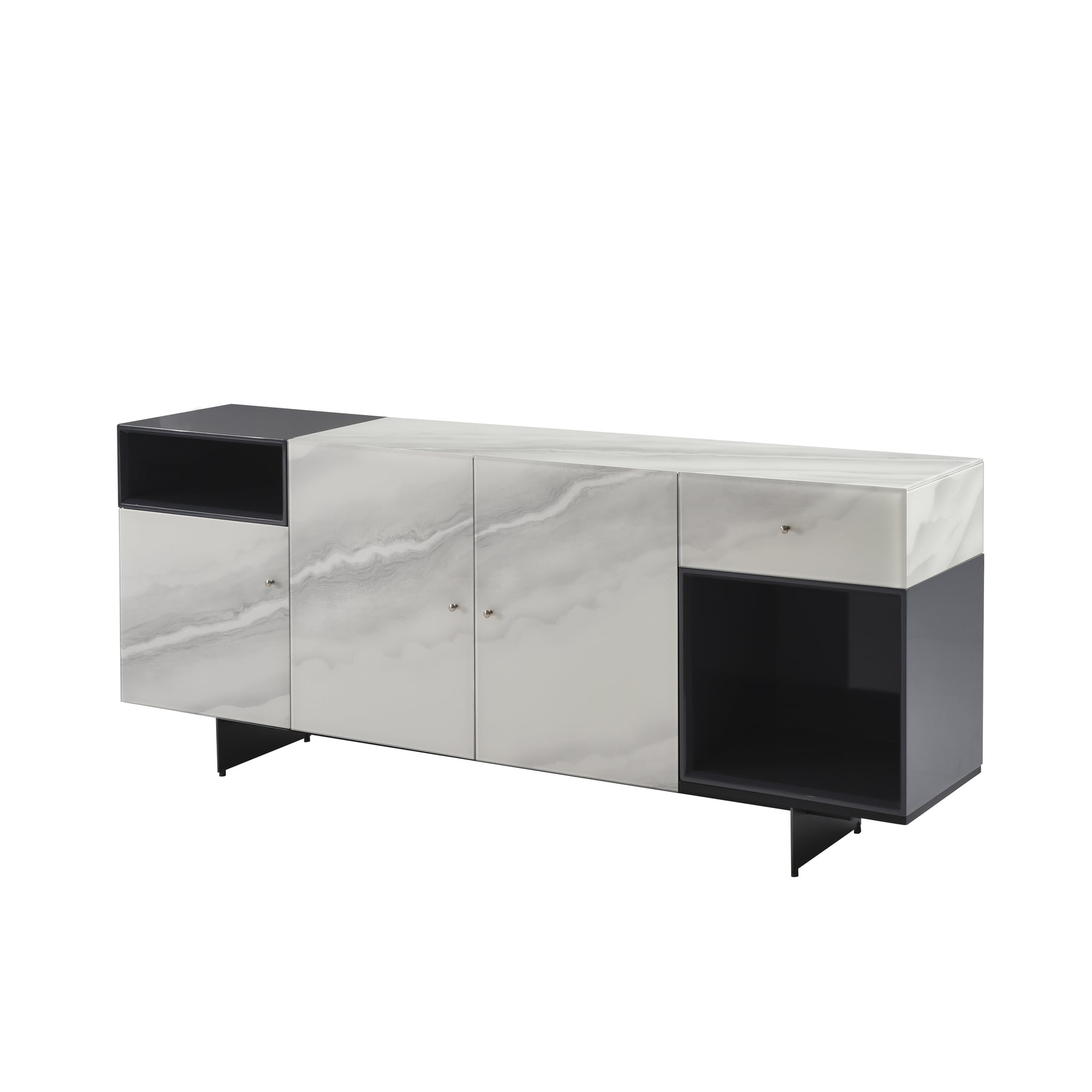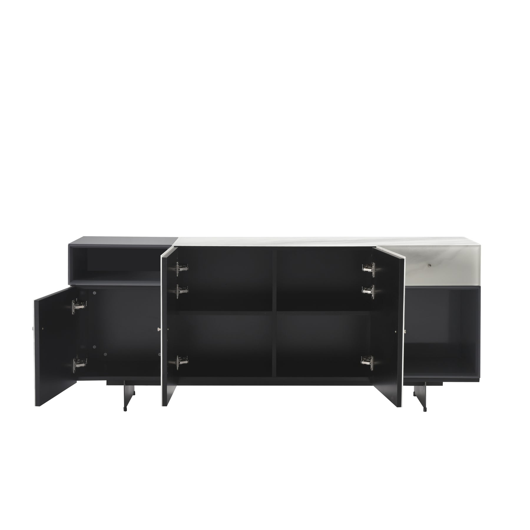Elevate your dining space with the Olivia Modern 8-Piece Dining Set a complete ensemble that blends sleek materials, sculptural design, and functional elegance. At its core is the Olivia dining table, featuring a radiant white tempered glass top that reflects light beautifully and creates a crisp, clean centerpiece for any room. The tempered glass surface is highly resistant to heat and everyday wear, offering durability without sacrificing style. Its sculptural base, finished in soft gray powder-coated metal, adds architectural interest and sturdy support, making it a versatile fit for modern, Scandinavian, or transitional interiors. Accompanying the table are six Alicia dining chairs, offered in two refined upholstery options: deep Plum for a bold, dramatic accent, or soft Gray for a more neutral, calming palette. Each chair features a gracefully curved backrest that merges into flared arms, forming a wraparound silhouette designed for comfort and visual flow. Fully upholstered and structured with sled-style metal legs, the Alicia chair adds a luxurious, tailored look while ensuring strength and stability. Floor-safe glides keep surfaces protected, and the chairs arrive fully assembled for your convenience. Completing the set is the Olivia 3-door sideboard, a standout piece that balances open storage with closed functionality. Its sleek black frame is paired with three tempered glass doors in a marble-effect white finish, echoing the tables glass top for a cohesive visual narrative. Inside, ample cabinet space offers storage for dinnerware, linens, and hosting essentials, while the open shelving adds space to showcase decorative pieces. Designed to impress and built to perform, the Olivia 8-piece set brings designer-level sophistication to everyday dining. Whether you're setting the tone with Plum or layering neutrals with Gray, this collection is your all-in-one solution for elevated, effortless living..