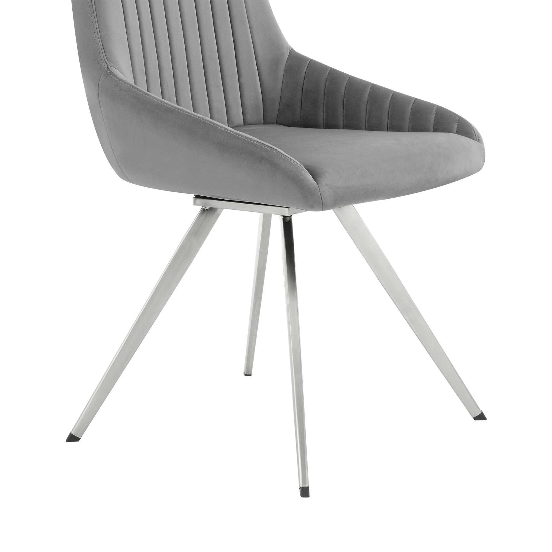 Bring the Skye Gray Velvet Set of Two Dining Chair from Armen Living into your home! The fabric upholstery is luxuriously wrapped around the entire seat. Featuring a wide back and spacious seat, its metal swivel mechanism allows you to turn and glide a full 360-degrees. The clean geometric upholstered lines add a textured look to this chair, covering the ultra-comfortable foam-padded cushion. The refined look of the Alison will update the decor in any dining room, bar or lounge area, or wherever you decide to place it! This wonderful chair features a sturdy metal frame that assures dependability and will give you years of enjoyment. Comes in a set of 2 dining chairs.Product Dimensions