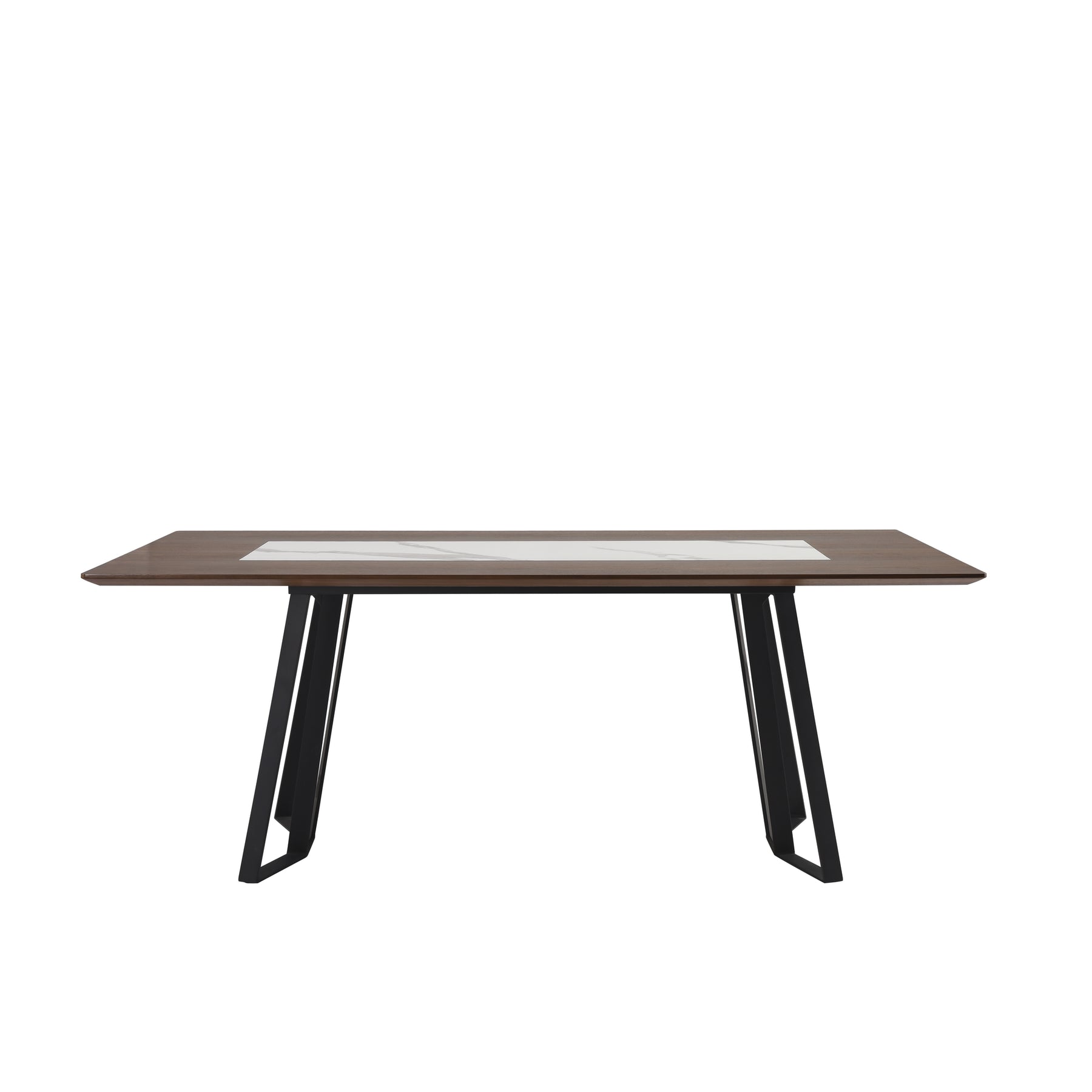 Balancing natural warmth with sleek surfaces, the Tanya Dining Table offers a fresh take on transitional design. Featuring a 79-inch rectangular tabletop composed of crisp white sintered stone framed by rich brown wood, this table delivers a visually layered experience that blends classic materiality with modern minimalism. Designed to comfortably seat six, Tanya is an ideal statement piece for dining rooms that prioritize both form and function. At the center of the table, the sintered stone inlay mimics the refined look of marble with soft veining and a luxurious matte finish but with significantly greater durability. Highly resistant to heat, stains, and scratches, the surface is perfect for everyday meals, special occasions, and everything in between. The surrounding walnut-toned wood provides an earthy contrast that warms the tables overall aesthetic while complementing a wide range of interior color palettes. Supporting the table is a pair of flared metal legs finished in a sleek black powder coating, angled slightly for added visual interest and balance. The sculptural geometry of the base adds modern sophistication while offering open legroom and rock-solid support. Designed for both residential and hospitality environments, Tanya adapts beautifully to contemporary, transitional, or mixed-style interiors. The tables core structure is built with sintered stone, reinforced by wood and metal for superior strength. Assembly is minimal and intuitive, with all tools included to get you set up quickly. Floor-protective rubber pads beneath each leg ensure that your space stays scratch-free, no matter how often the table is moved or repositioned. With its striking blend of materials and its clean, inviting profile, the Tanya Dining Table invites everyday elegance to your dining space..
