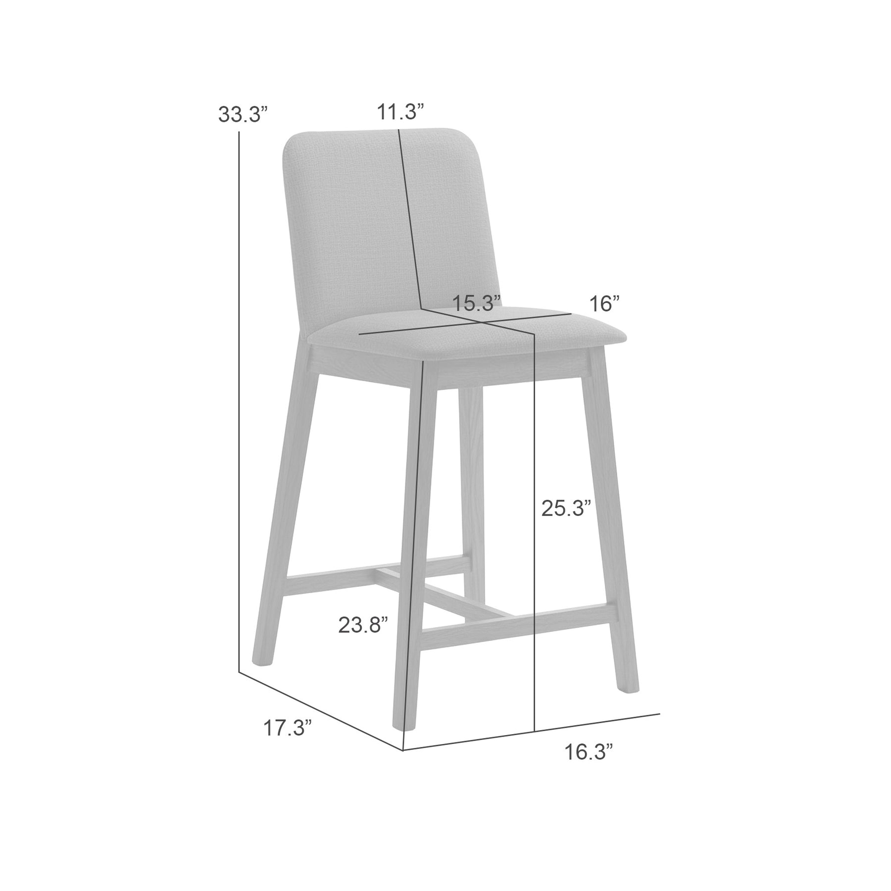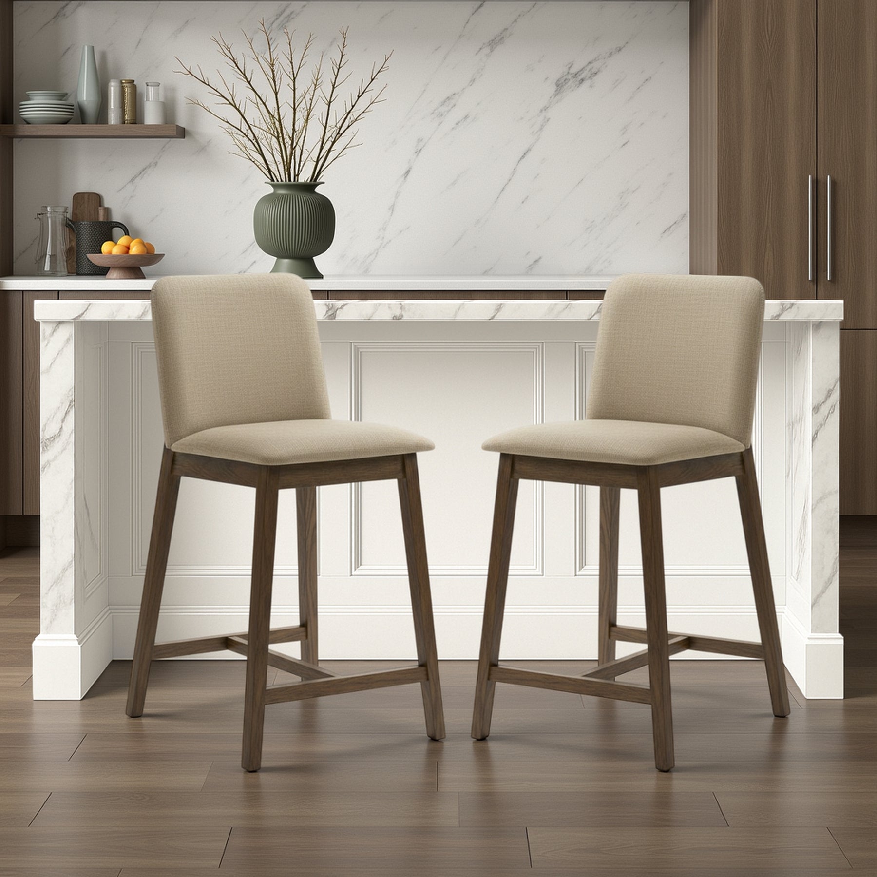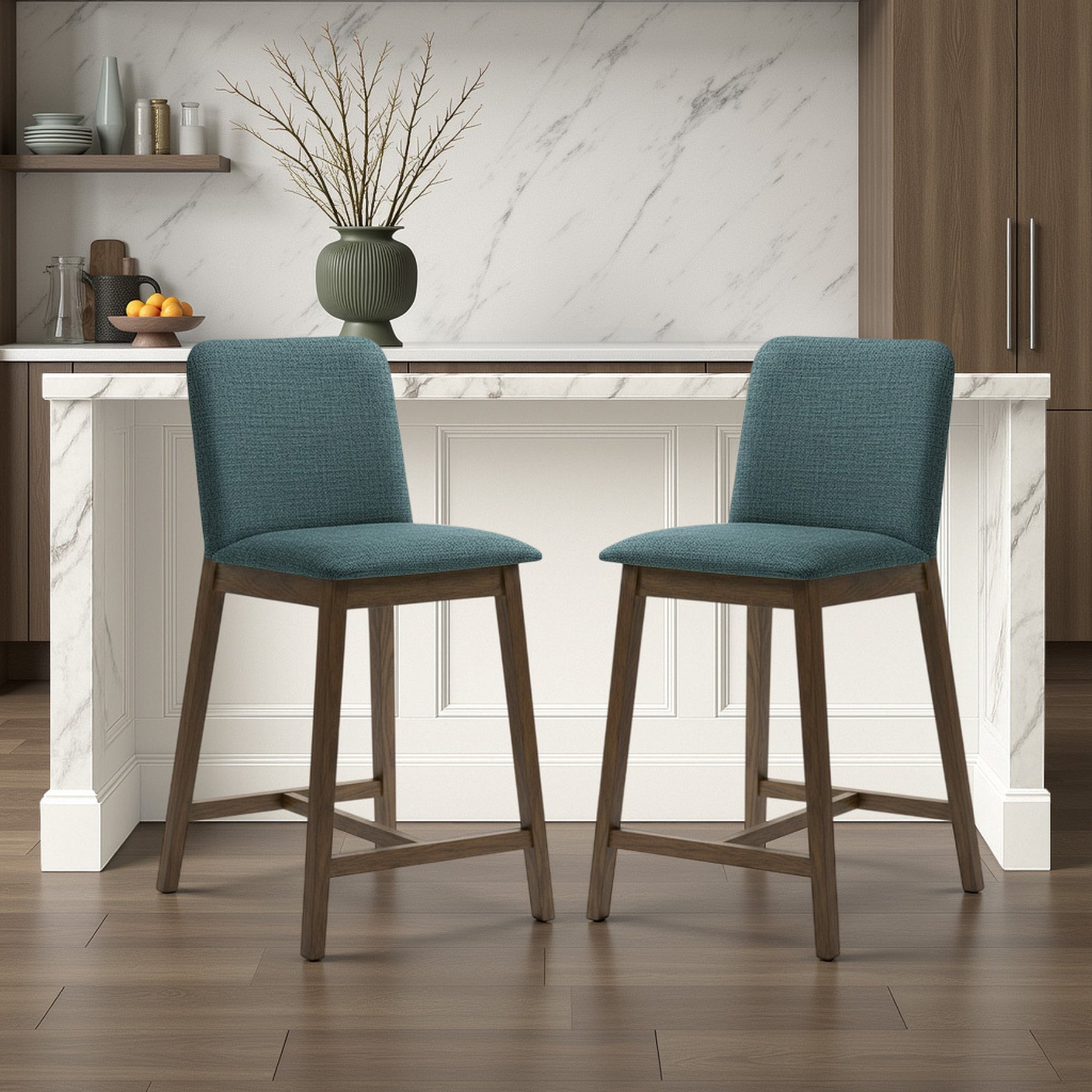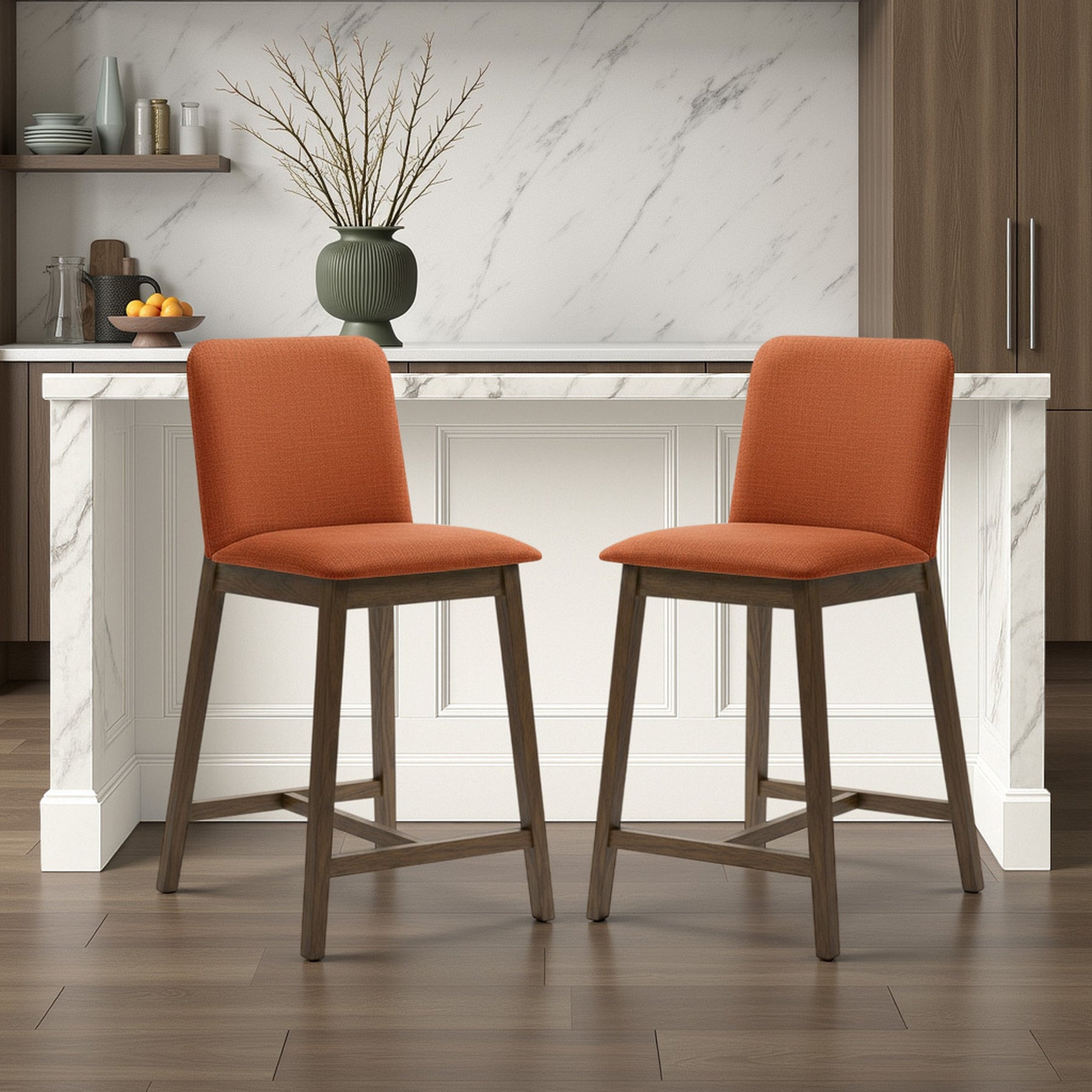The Allin Collection barstools offer a more structured and supportive seating option for kitchen islands and dining counters. Built with a solid wood frame finished in a rich stained tone, each stool combines stability with a refined, furniture-inspired presence. The collection features a high back silhouette with a clean, squared profile, providing added support and a more tailored look. Upholstered in soft fabric seating with comfortable cushioning, the Allin Collection is designed for relaxed seating during meals, entertaining, and everyday use. These barstools are available in a curated range of colors, including Green, Yellow, Grey, Orange, and Blue, making it easy to add either subtle warmth or a bold accent to your space. The cushioned seat and supportive back encourage comfortable posture, especially during longer gatherings. With a fixed, non-swivel design and no arms, the ALLIN Collection maintains a streamlined appearance that integrates easily into a variety of layouts. The base is defined by sled-style legs paired with a cross base, creating a grounded, architectural look while enhancing stability. An integrated footrest adds comfort, while adjustable leg levelers help ensure balance on uneven flooring. Finished in a matte stained wood look, the Allin Collection combines comfort, structure, and everyday functionality.Product Dimensions