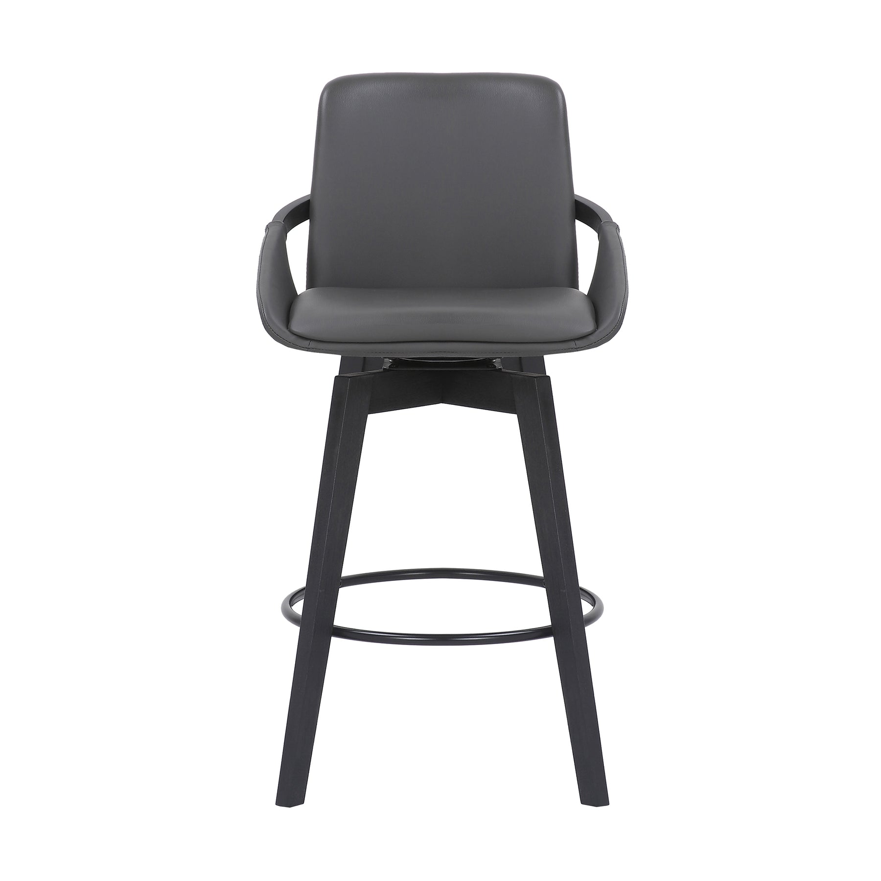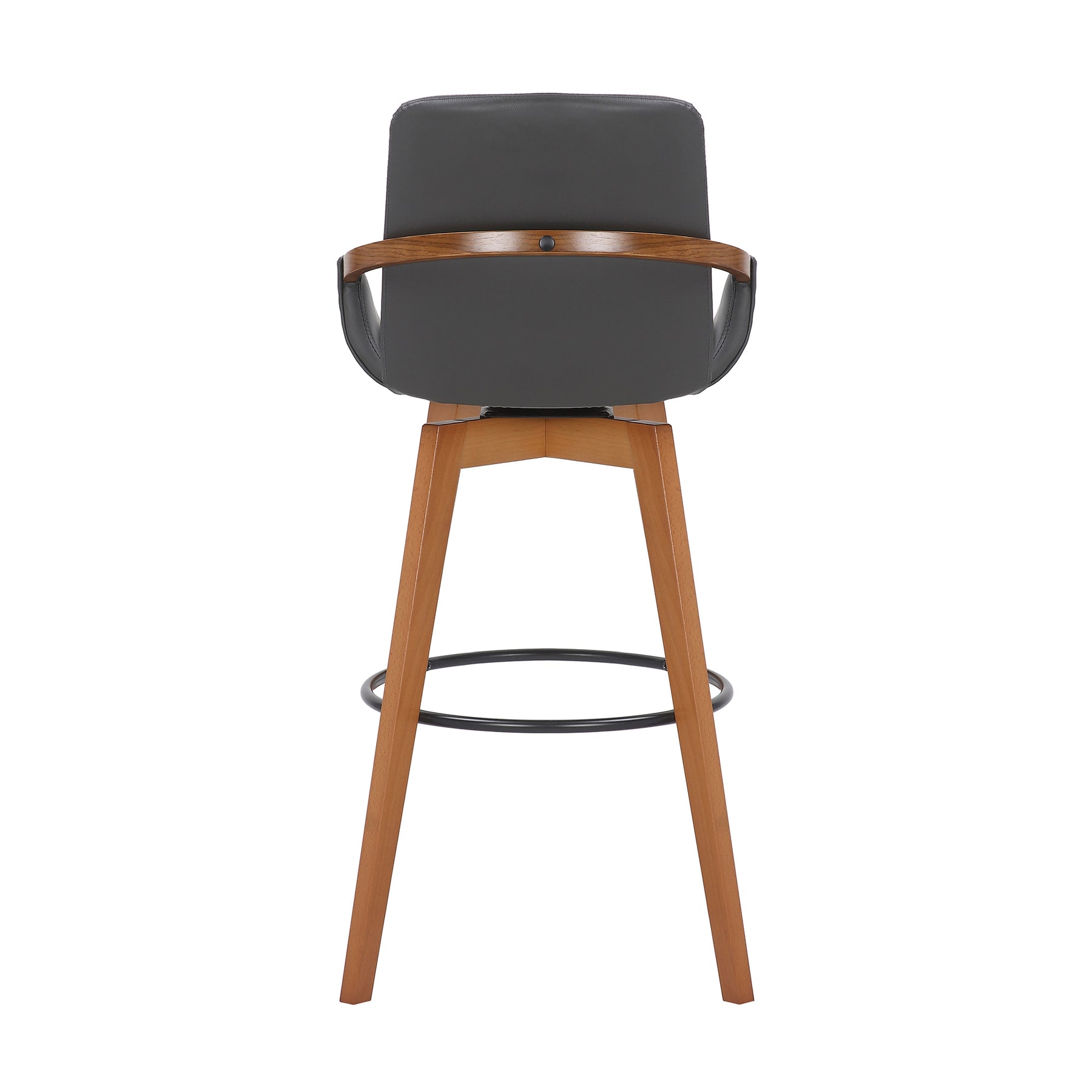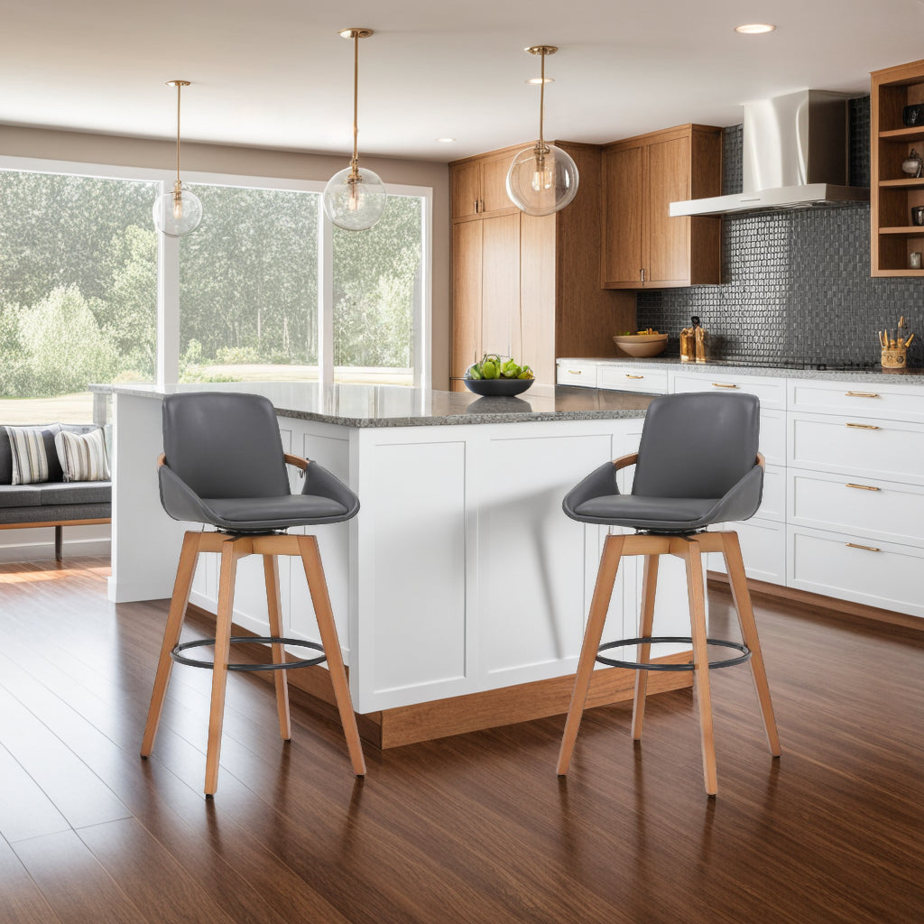 The Armen Living Baylor Swivel Wood Bar or Counter Height Stool in Faux Leather is the next great furniture addition to your beautiful, modern home. This refined and functional bar stool will absolutely enhance the aesthetic in any room. The Baylor's frame and legs are crafted with sturdy and durable wood, giving you years of enjoyment. This bar stool features a 360-degree swivel function which increases mobility for a greater user experience. The sleek, smooth lines featured throughout the body of this bar or counter height chair combined with the look of the soft faux leather upholstery create harmony throughout this piece. This stool also includes a circular metal footrest, which is both visually appealing and practical for the design. The Baylor Bar or Counter Height Stool is available in 26-inch counter height and 30-inch bar height. Also available in your choice of cream or gray faux leather with walnut wood finish or black brushed wood finish.Product Dimensions