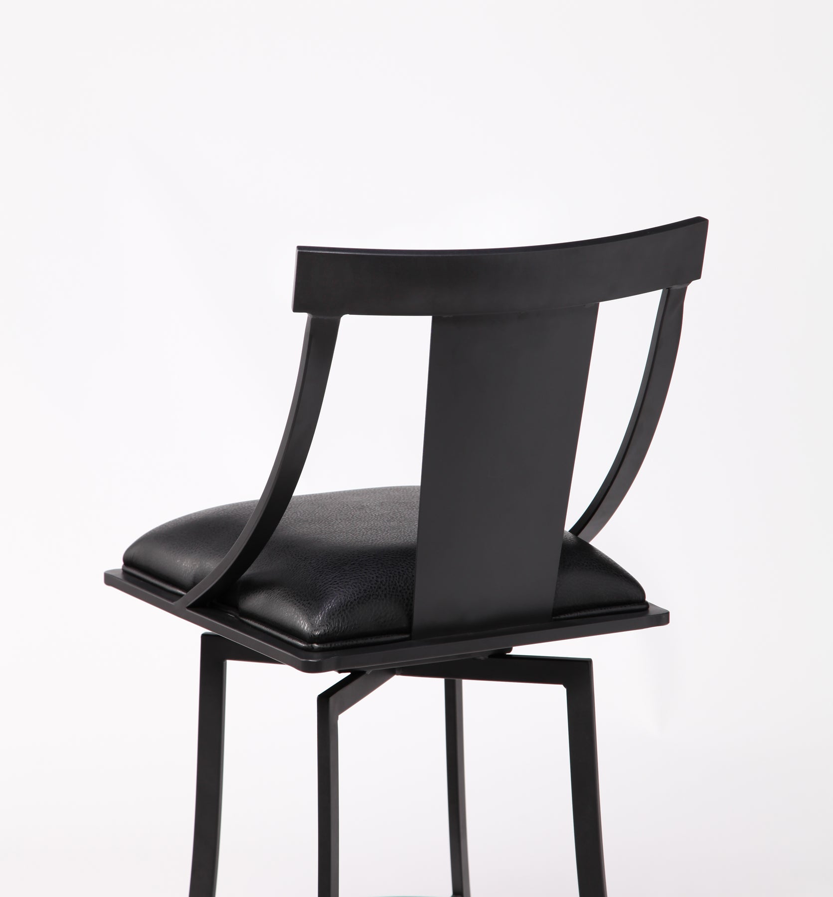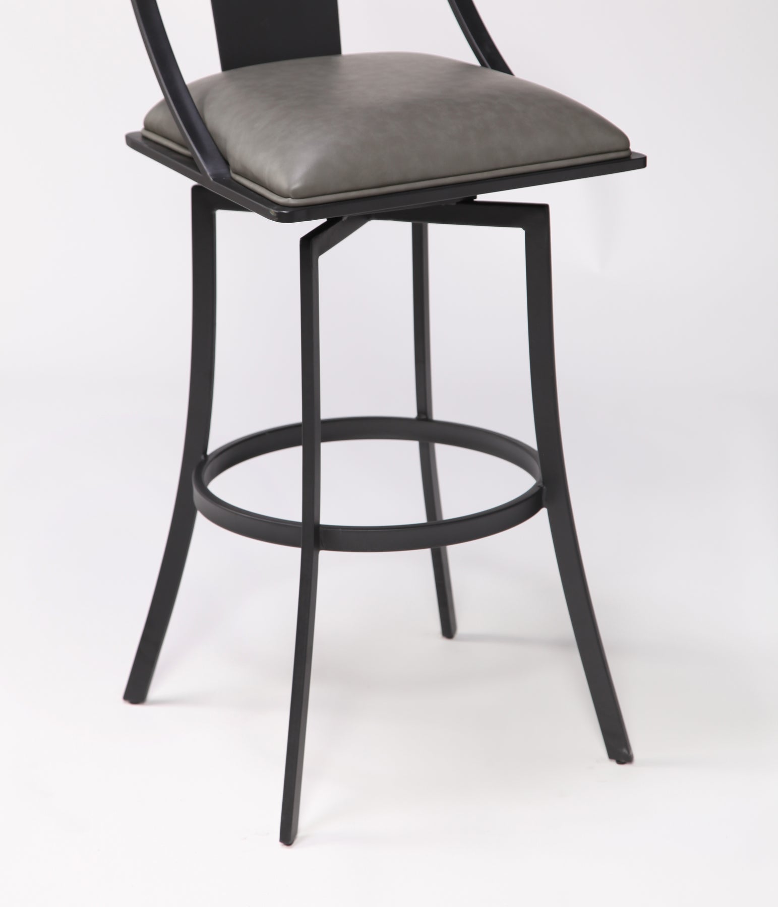 The Armen Living Brisbane contemporary barstool combines the durability of quality metal construction with modern aesthetics to bring you a truly attractive home furnishing piece. The Brisbane's beautifully curved tall back and legs are made of dependable steel while the seat is reinforced by wood and topped by a plump seat cushion. The Brisbane's exceptionally comfortable seat features a 360 degree swivel mechanism, allowing for a wide range of movement while seated. The stool's curved legs come complete with a convenient round footrest for added support. The tips of the Brisbane's legs feature rubber nibs, preventing the barstool from slipping on or scratching hardwood or tile surfaces. An excellent choice for the home bar or kitchen, the Brisbane is sold in three unique styles: A beautiful Matte Black finished variant with a Vintage Gray faux leather seat cushion, A Matte Black finished variant with a Ford Black faux leather cushion, and an Auburn Bay finished variant with a Ford Brown faux leather upholstered seat cushion. Each style is sold in two industry standard sizes; 26 inch counter and 30 inch bar height.Product Dimensions