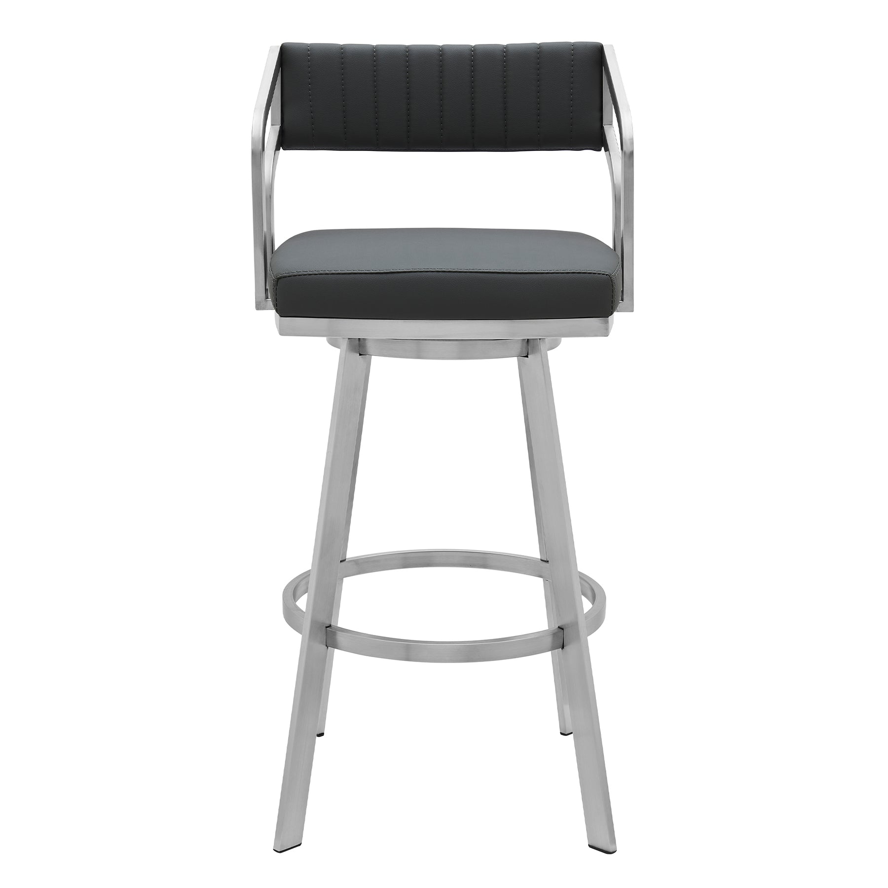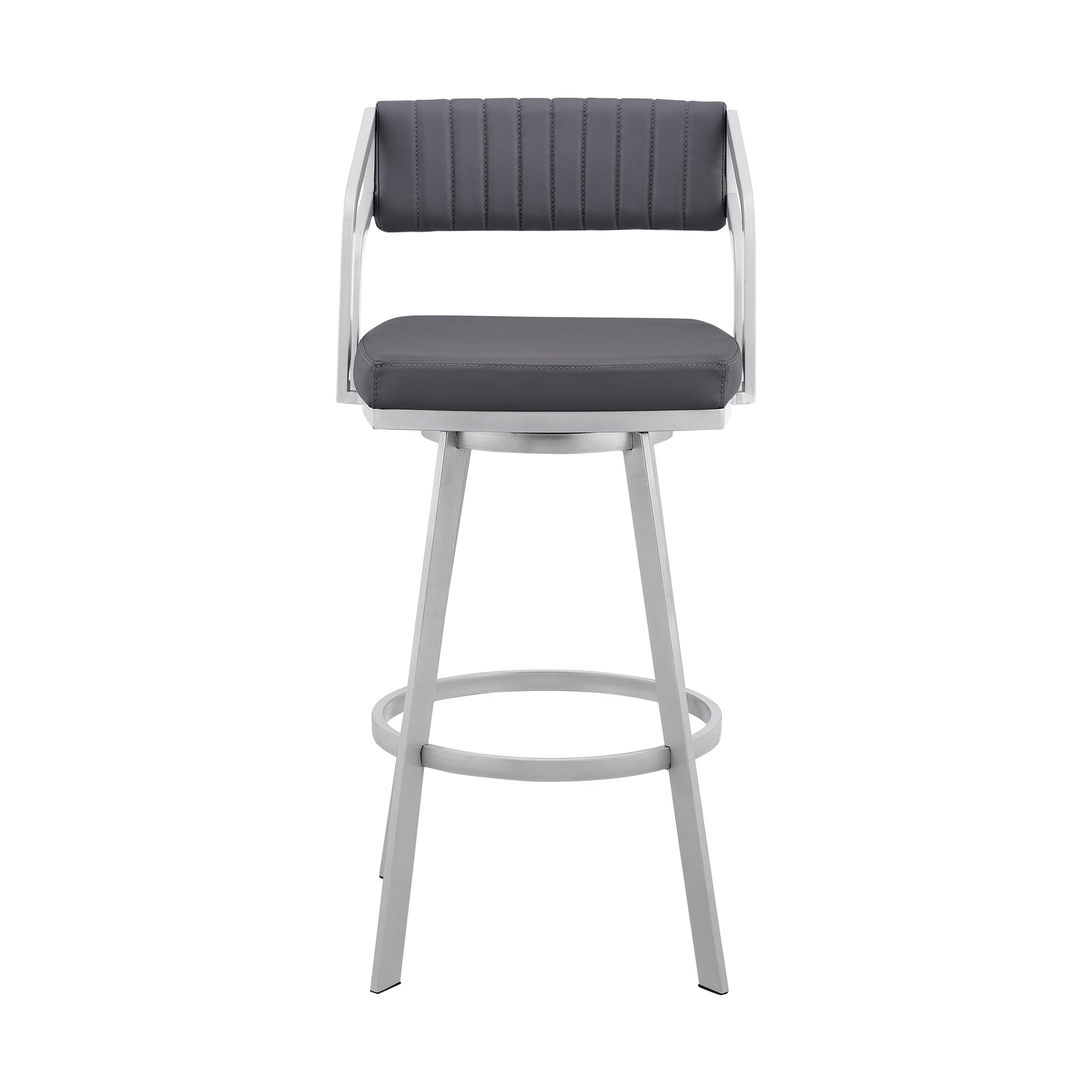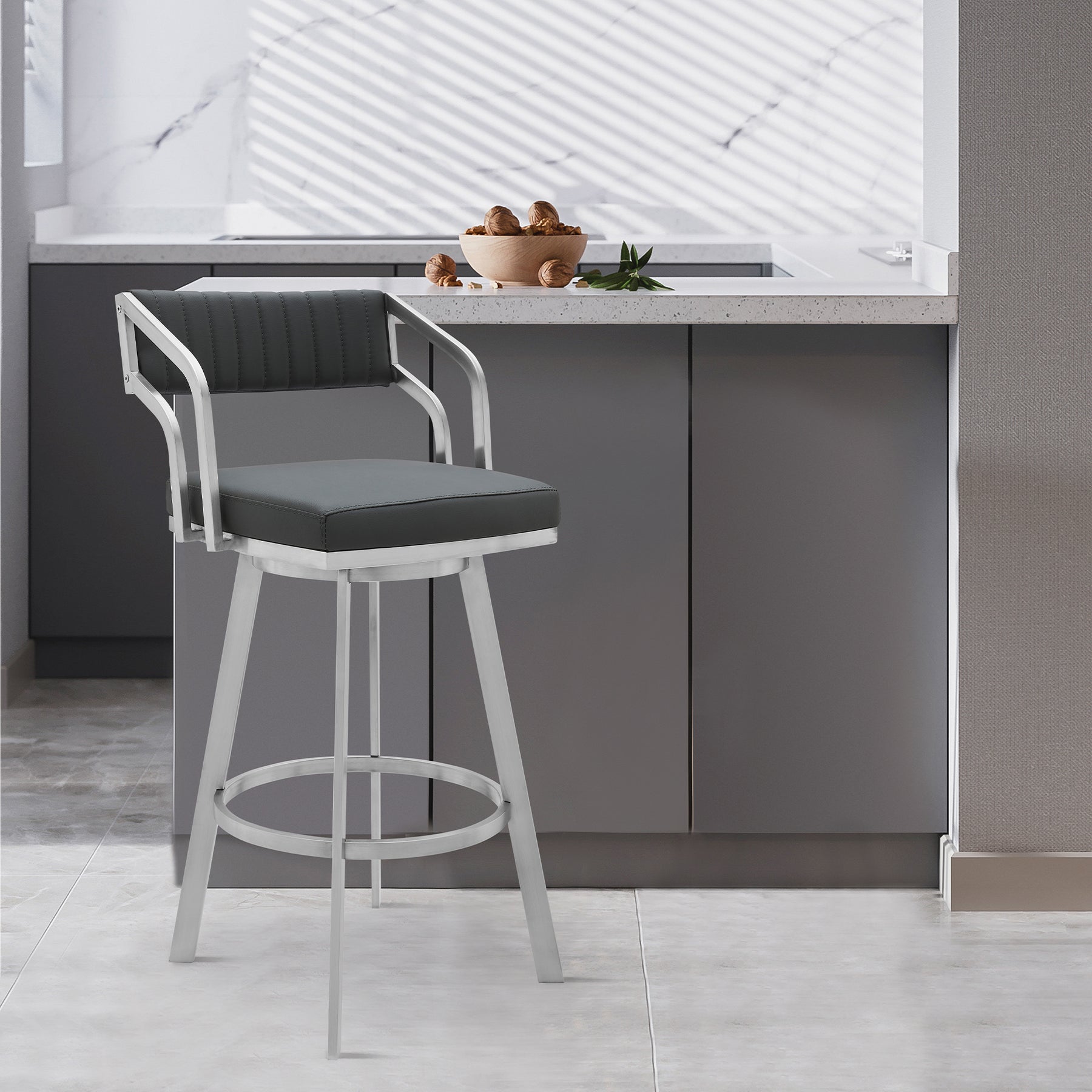 Add a modern furniture piece to your home with the Capri Swivel Modern Metal and Faux Leather Bar and Counter Height Stool. The Capri is a unique design that will be sure to start conversations at all your gatherings. Pull the Capri up to your kitchen island, counter, peninsula, bar, or pub table with ease due to the unique low arm design that allows you to sit as closely to your desired surface as needed. The Capri modern style silhouette is perfectly complemented by its channel style stitching on the back piece, the back of the Capri's open-lower back design allows for cool breathable seating. Enjoy full mobility with the 360-degree swivel function that keeps you fully engaged with guests on all sides of the room. The Capri Swivel Modern Metal and Faux Leather Bar and Counter Height Stool is available in your choice of a Matte Black or Brushed Stainless Steel finish and beautiful slate Gray faux leather and comes in a Bar 30" height or a Counter 26" height.Product Dimensions