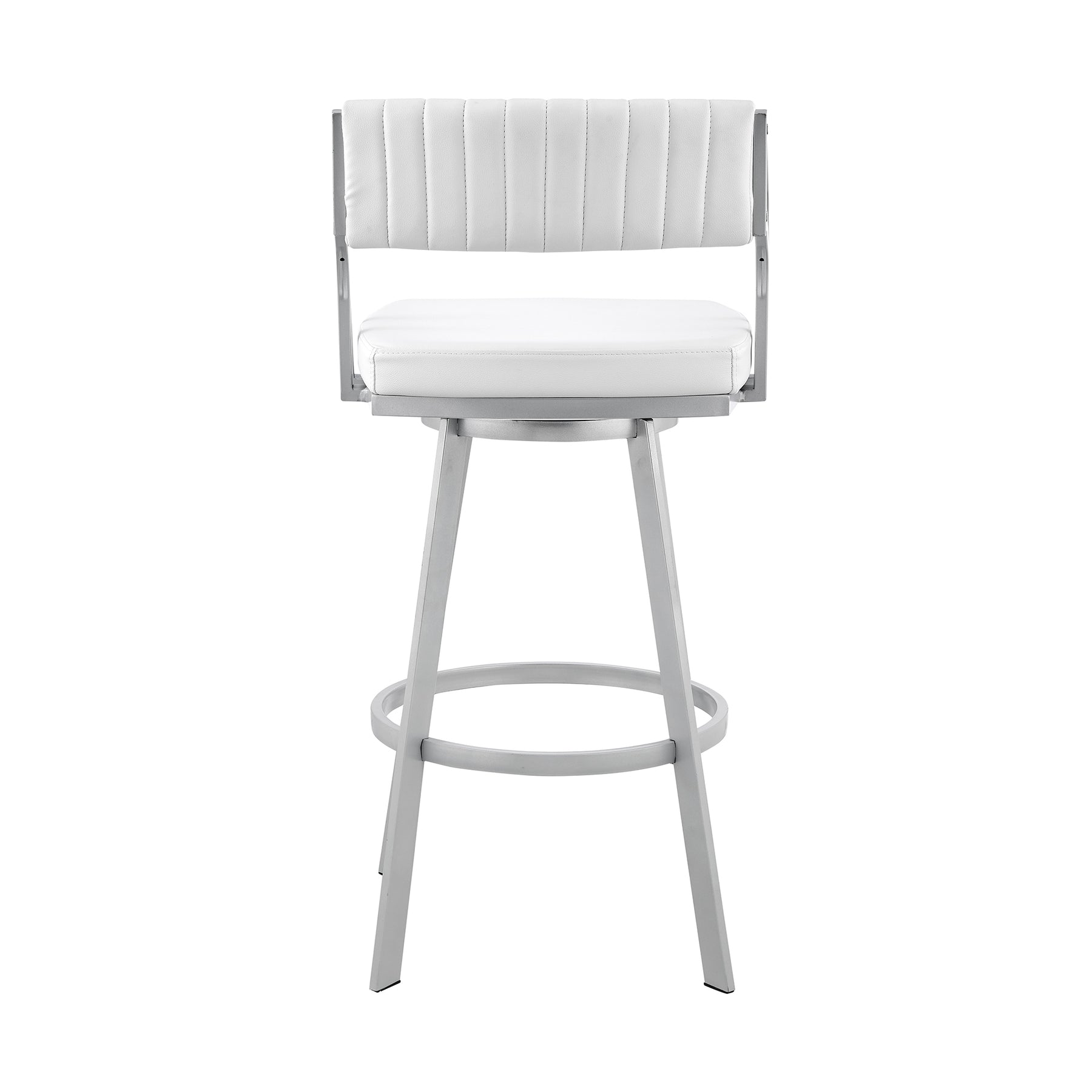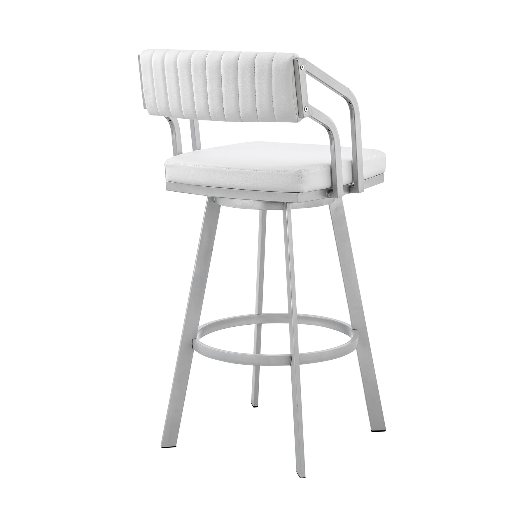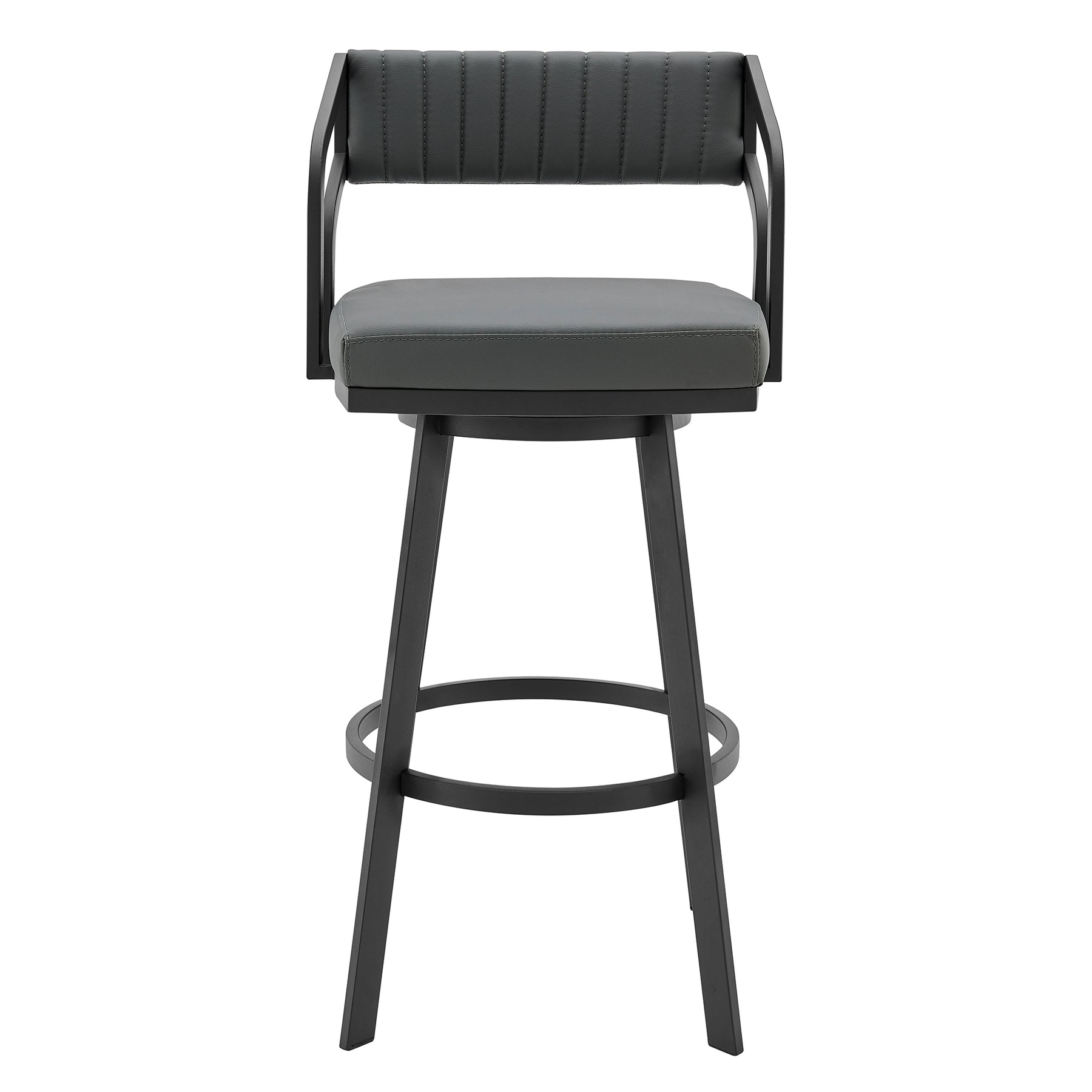 Add a modern furniture piece to your home with the Capri Swivel Modern Metal and Faux Leather Bar and Counter Height Stool. The Capri is a unique design that will be sure to start conversations at all your gatherings. Pull the Capri up to your kitchen island, counter, peninsula, bar, or pub table with ease due to the unique low arm design that allows you to sit as closely to your desired surface as needed. The Capri modern style silhouette is perfectly complemented by its channel style stitching on the back piece, the back of the Capri's open-lower back design allows for cool breathable seating. Enjoy full mobility with the 360-degree swivel function that keeps you fully engaged with guests on all sides of the room. The Capri Swivel Modern Metal and Faux Leather Bar and Counter Height Stool is available in your choice of a Matte Black or Brushed Stainless Steel finish and beautiful slate Gray faux leather and comes in a Bar 30" height or a Counter 26" height.Product Dimensions