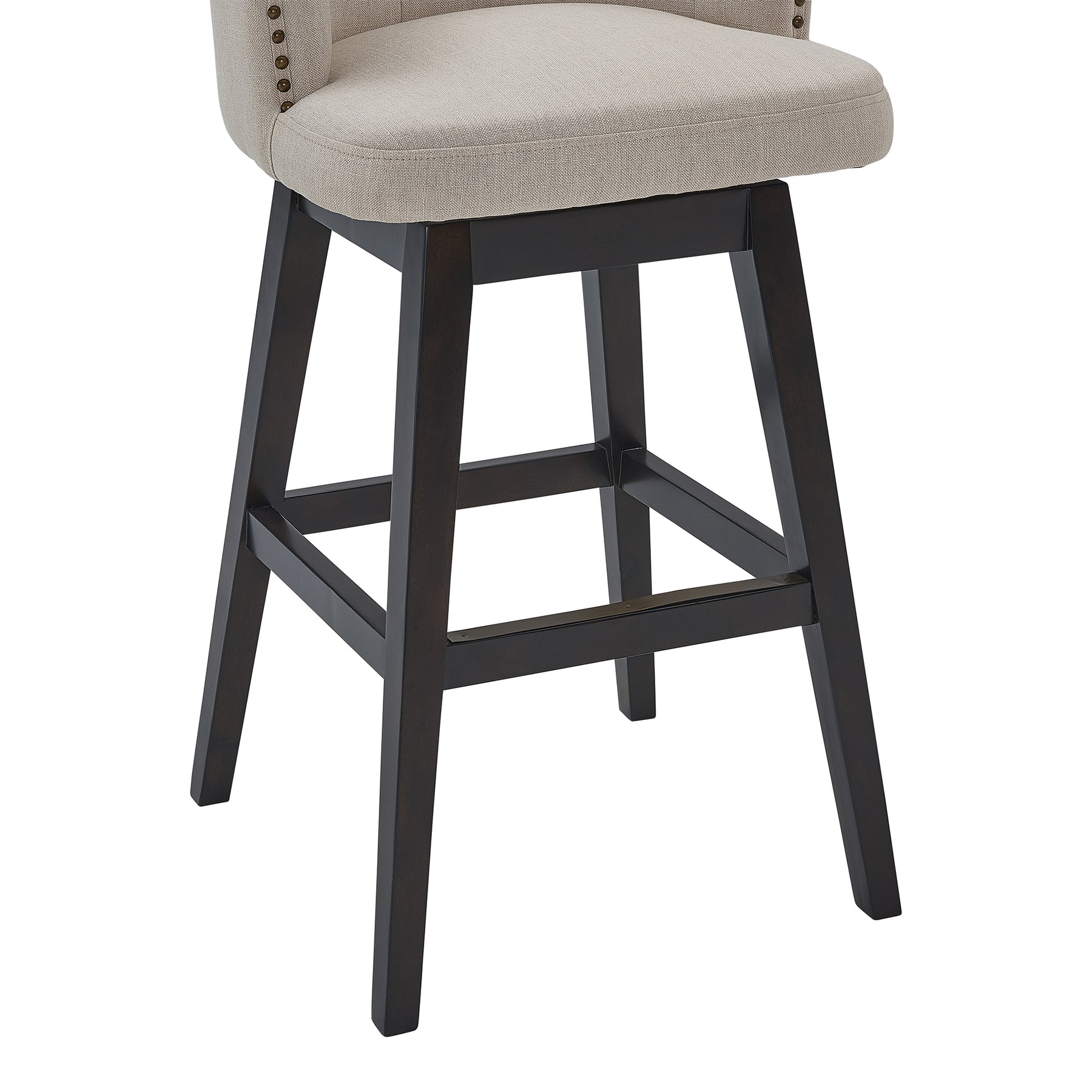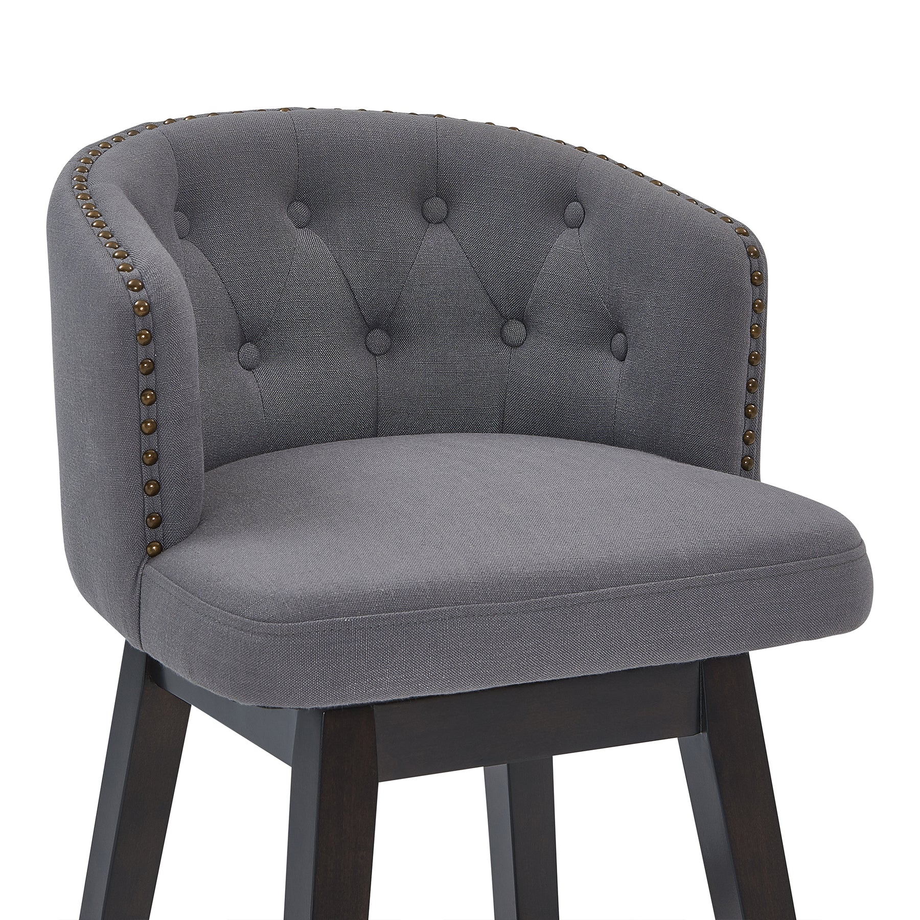 Timeless style is at your fingertips with the Armen Living Celine 26" Counter Height Swivel Grey Fabric and Espresso Wood Bar Stool. The rounded back features high-end diamond tuft stitching and nail head accents as well as ergonomic properties to keep your back healthy and properly aligned. The 360-degree swivel provides optimal mobility and allows you to easily engage with your friends or family regardless of their place in the room. The Celine's legs are tipped with floor protectors, assuring that the barstool will not damage floors when moved, making this a great addition to any room! Pull the Celine up to your kitchen island, peninsula counter, or home bar to create a warm atmosphere. The wooden frame features an espresso finish that easily incorporates to any home regardless of style theme and the elegant silhouette makes for a beautiful conversation piece that will liven up any party or gathering. The Celine kitchen bar stool is available in your choice of Tan or Grey upholstery and both feature a beautiful espresso wood 4-leg base.Product Dimensions