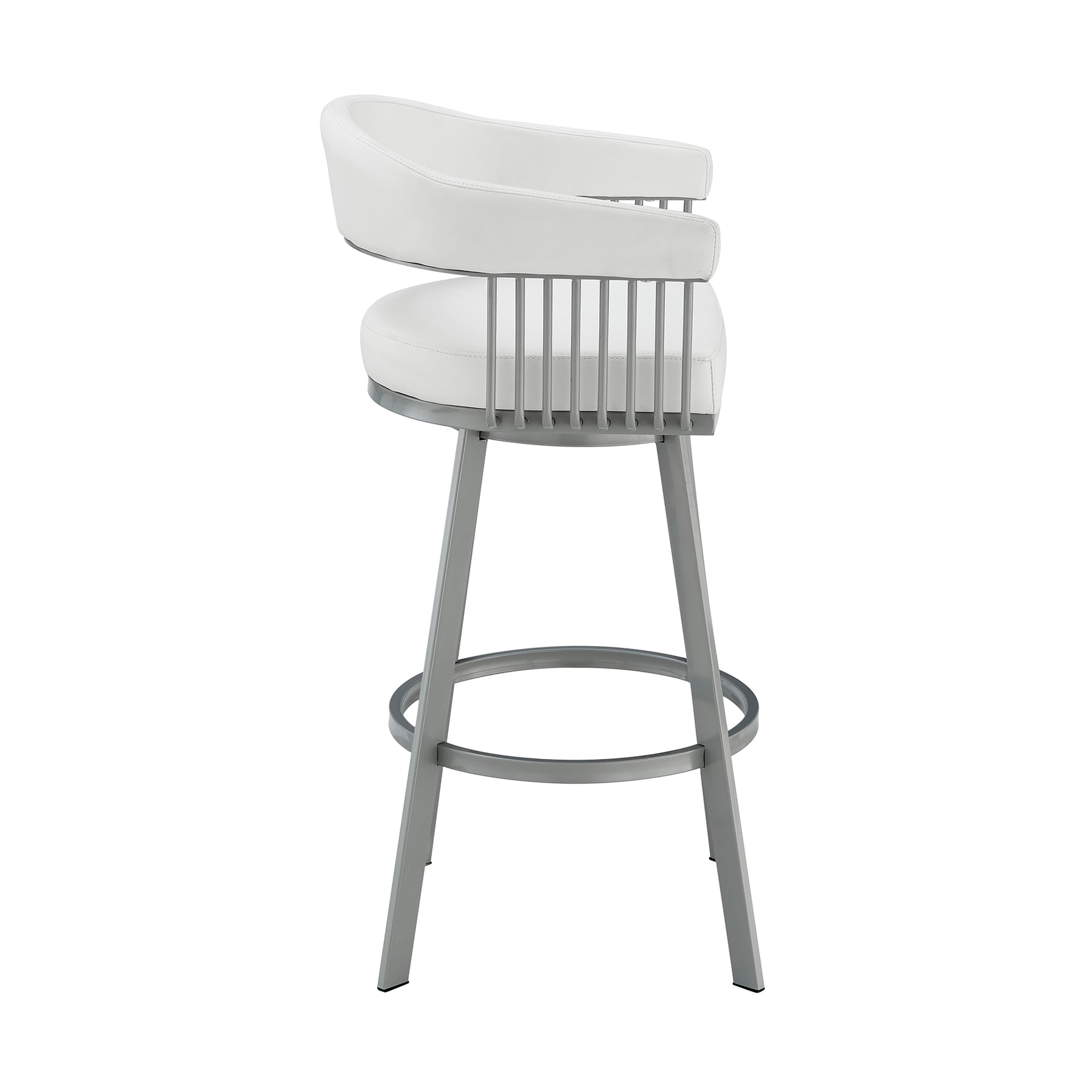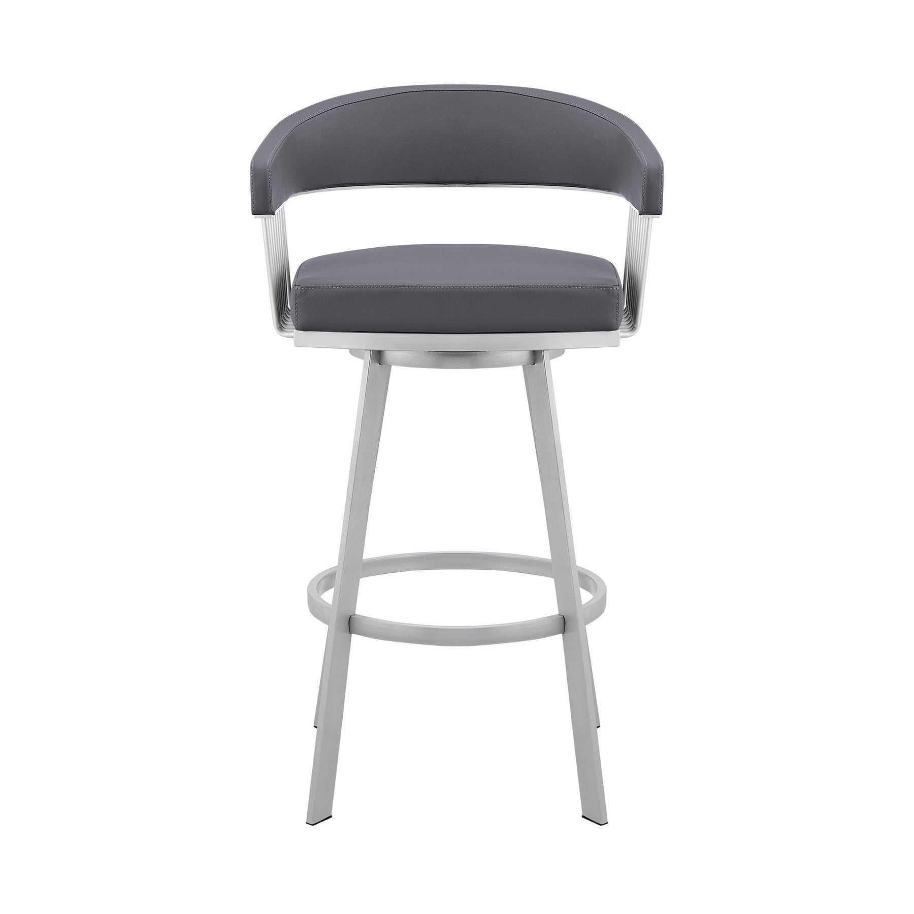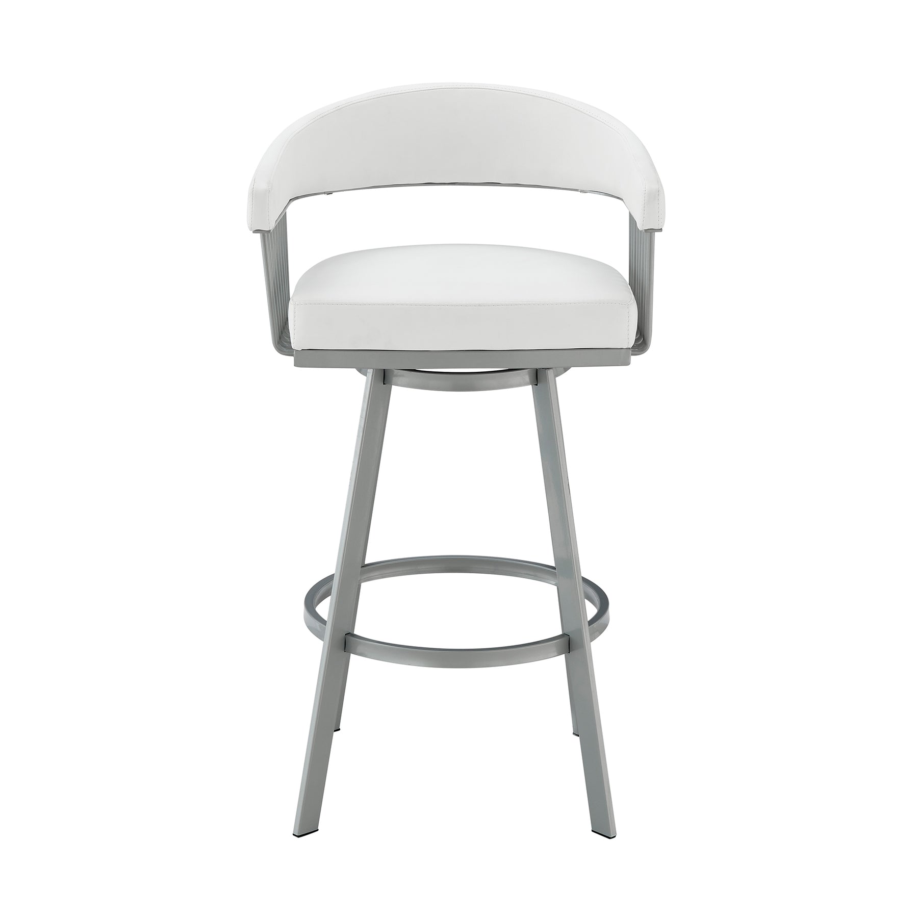 Give a luxe and stylish upgrade to your home with the Chelsea Swivel Upholstered Counter or Bar Height Stool with a Metal frame by Armen Living. Our barstool is sure to impress with its thoughtful, contemporary design and eye-catching details. The hugging silhouette of this floating backrest flows seamlessly into the arms, which are supported by intricate metal detailing. The backrest and seat are generously padded in high-density foam and upholstered in performance fabric or high-quality faux leather for elevated style, comfort, and convenience. The Chelsea is perched upon tapered metal legs that come equipped with floor protectors, ensuring that the bar stool will not slip on or scratch hardwood or tile floors. This counter or bar stool can be styled anywhere from your kitchen to your home office to give a stunning upgrade to your kitchen island, pub table, home bar, or adjustable desk. The stool includes a built-in circular footrest to relieve pressure from your legs and offer a more comfortable sitting position. Its smooth 360-degree swivel function enhances your space efficiency and mobility, allowing you to effortlessly turn and engage in conversations while being able to sit closer together. The Chelsea Swivel Counter or Bar Height Stool is available in several different finishes, colors, and textile combinations to make a chic and stylish impact in any home. Choose whichever design suits your space, and enjoy this minimal assembly barstool that is sure to stand out!Product Dimensions