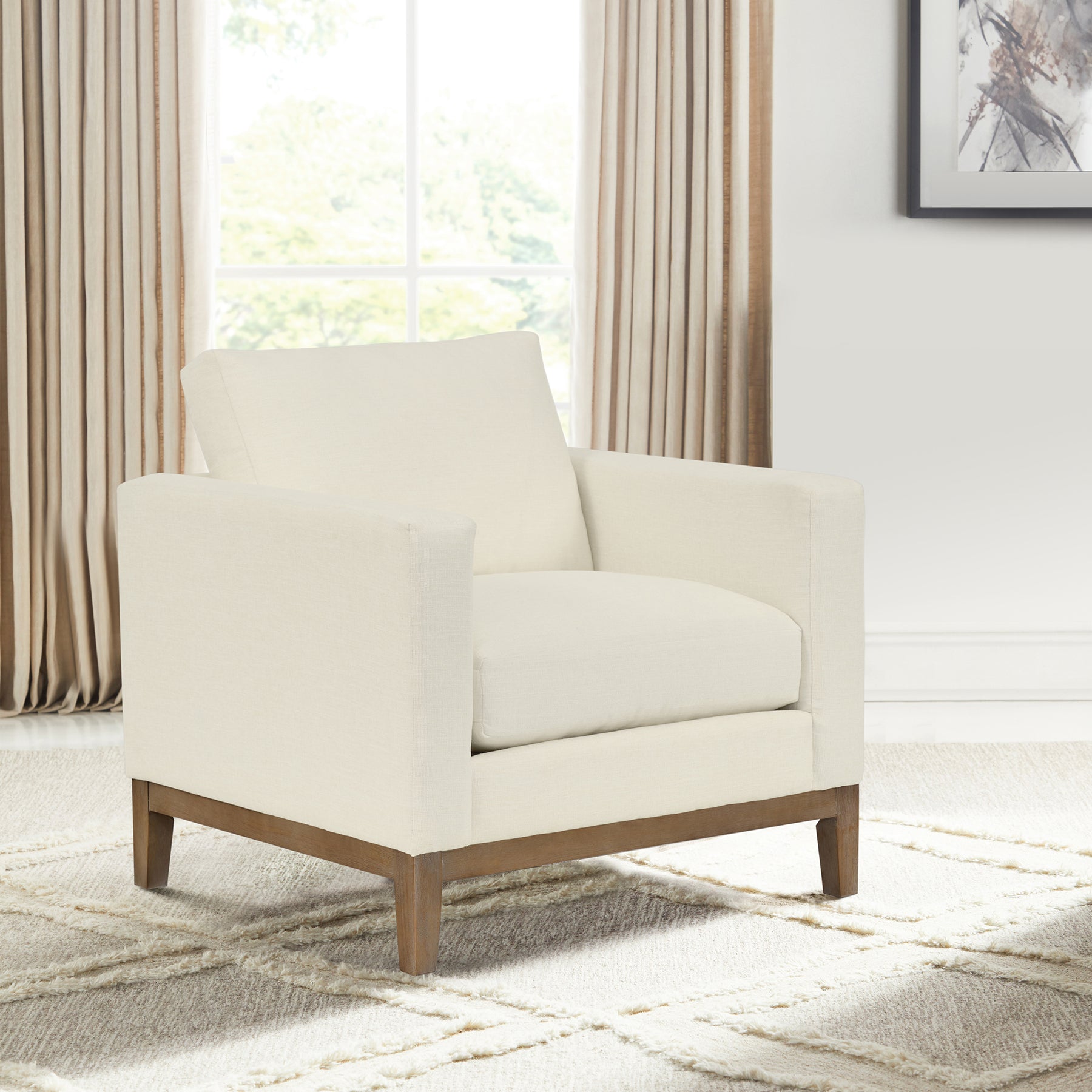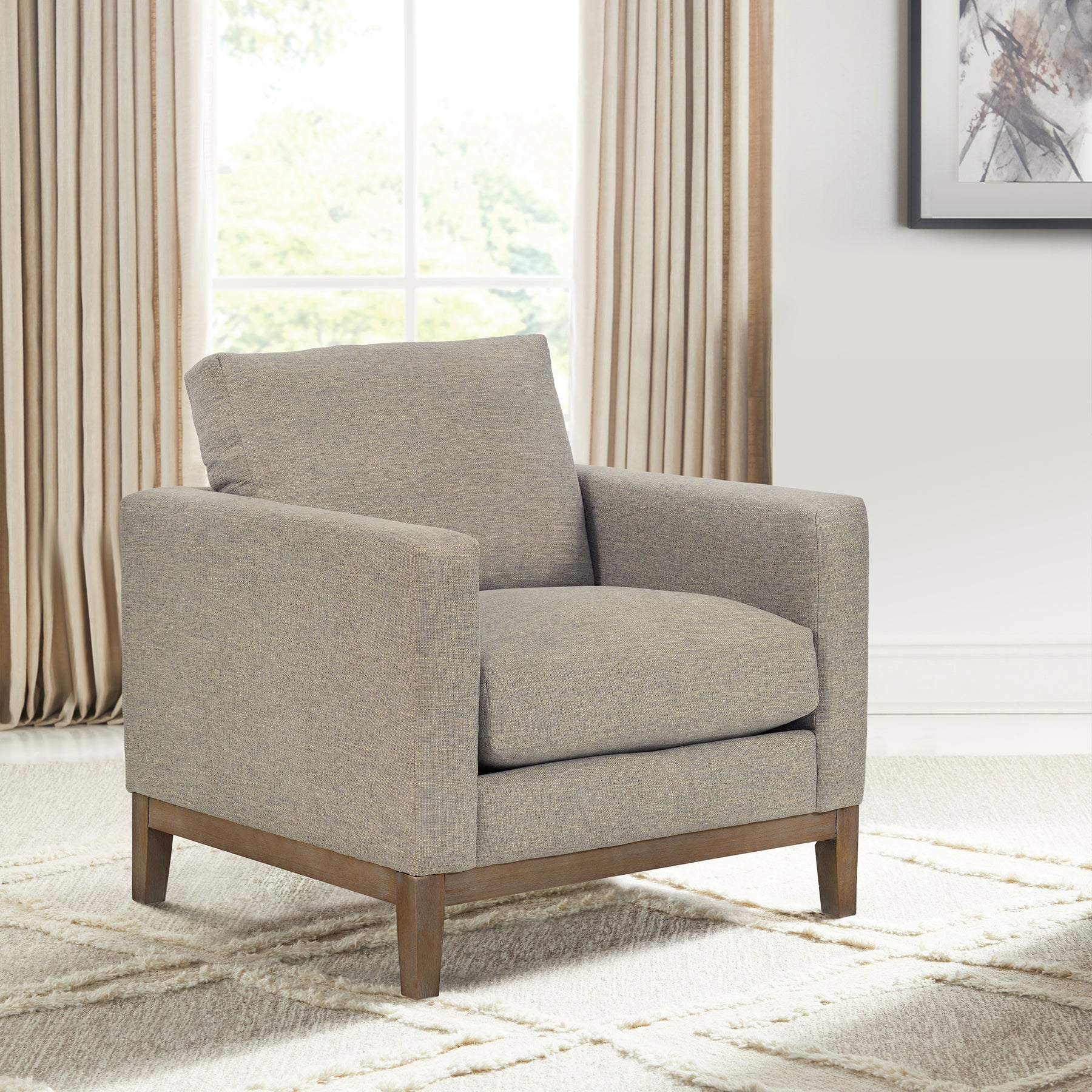 Introducing the Donna 35" Upholstered Accent Chair, a true embodiment of style, comfort, and quality. This beautifully designed accent chair effortlessly combines timeless elegance with modern craftsmanship, making it the perfect addition to your living space. With its classic silhouette, the Donna Armchair offers more than just a seat; it's a statement piece. Its use of mixed materials creates a unique blend of natural charm and sleek sophistication. Whether your decor leans toward traditional, modern, or contemporary, this chair effortlessly complements your style. Crafted with meticulous attention to detail, this living room chair boasts eight-way hand-tied seat construction, ensuring durability and lasting support. Its down, foam, and fiber blend seat cushion fill offers a plush and inviting seating experience. The Donna is all about practicality too, with its reversible cushions that enhance durability and allow you to effortlessly customize your decor. The compelling features, stunning design, and high-quality materials make the Donna accent chair the perfect addition for your living room, den, bedroom, or home office. The Donna is available with a coastal gray finish on the wood base and your choice of Sugar or platinum Gray upholstery.Product Dimensions