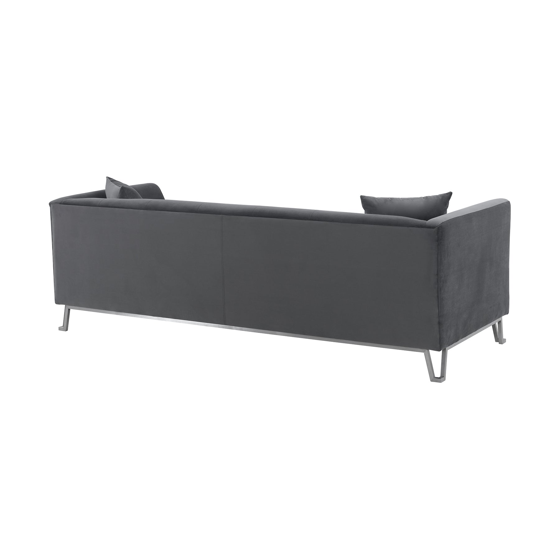 The Armen Living Everest Sofa is the seating option your home needs right now. Capable of accommodating up to four people with its high weight capacity, the wide seat and high chair back and arms will encapsulate your body and make you feel satisfied and secure. The incredibly comfortable foam-padded cushions of the Everest Sofa will keep you relaxed all day long and make you never want to get up! The striking brushed silver legs are a stand-out feature that compliments the fabric upholstery perfectly, while also adding to the uniqueness of this sofa. This wonderful chair comes with two additional toss pillows to accessorize with. The Everest is available in your color choice of Blue, Gray, and Blush fabric.Product Dimensions
