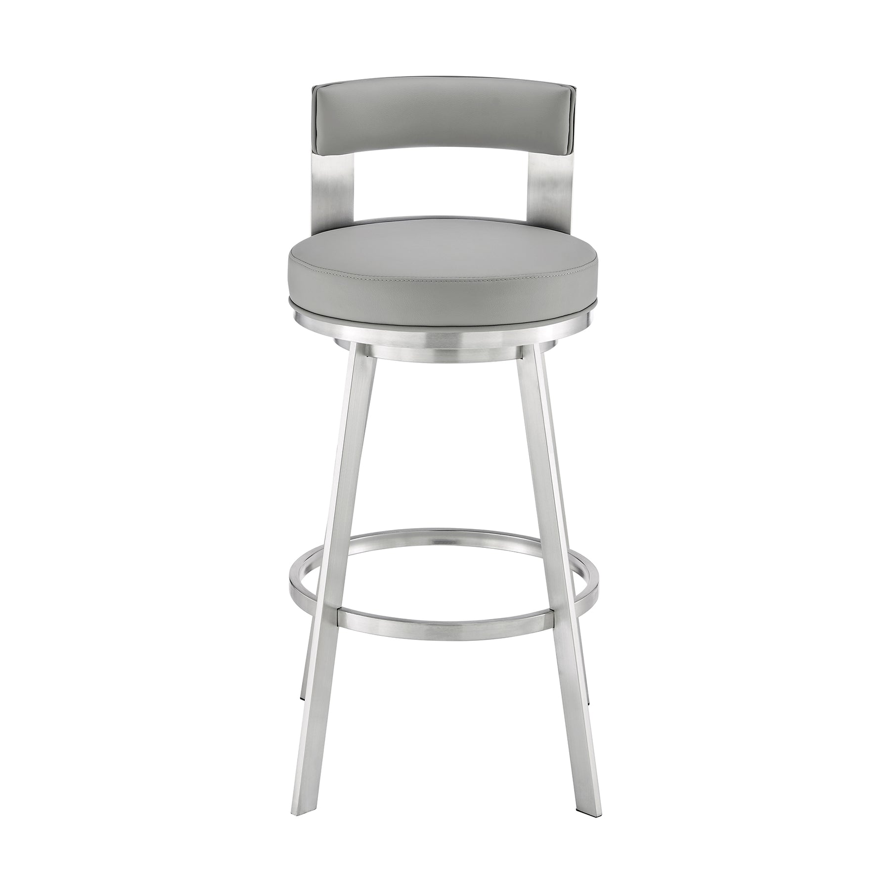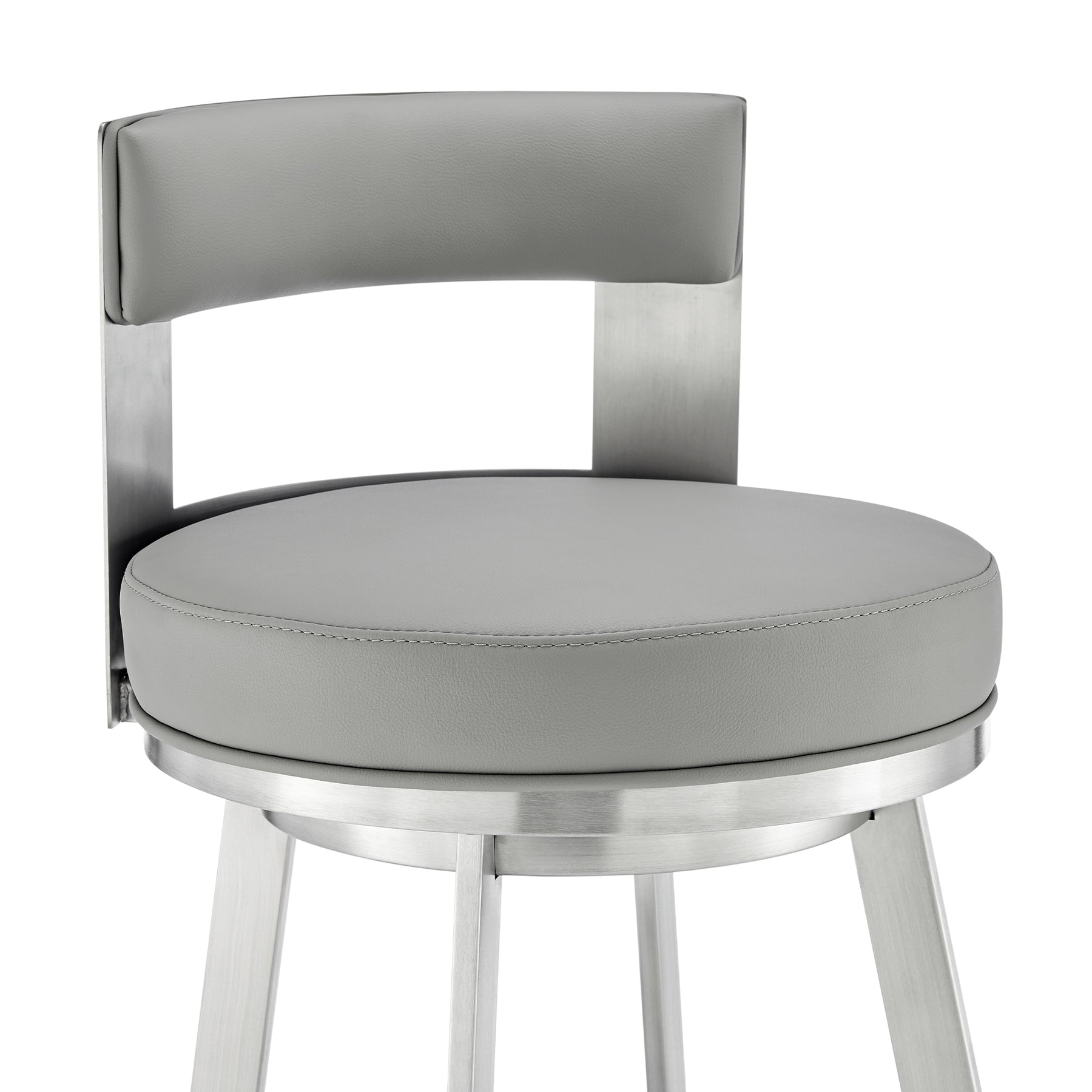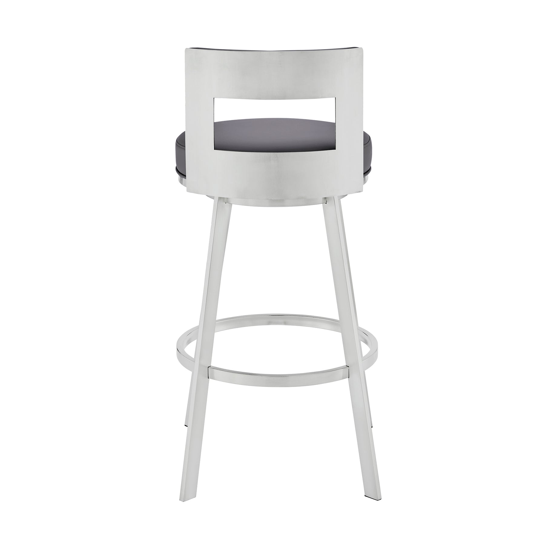 Modernize your home with the Flynn swivel bar or counter stool from Armen Living. The Flynn is available with a metal 4-leg base and features durable faux leather upholstery. Faux leather does not crack easily and is stain resistant, does not fade easily and is also UV resistant. Counter or bar height stools that feature a swivel mechanism tend to be much more convenient for everyday use or when entertaining. The wonderful full 360-degree swivel function allows for maximum mobility. The smooth glide swivel function allows you to change directions with ease, making this your new favorite seat in your home. This modern bar stool has an open back that creates a breathable seat, allowing you to sit comfortably for extended periods. Featuring a chic and streamlined profile, the modern counter stool features a subtly curved back. Complemented with a roomy round cushioned seat, our thoughtfully designed counter stool supports you in just the right places. The Flynn is available in a black finish with light grey faux leather, a brushed stainless-steel finish with black, white, or light grey faux leather, a brown finish with chocolate faux leather, or a silver with grey faux leather upholstery. This modern bar stool comes in your choice of 26-inch or 30-inch seat height options.