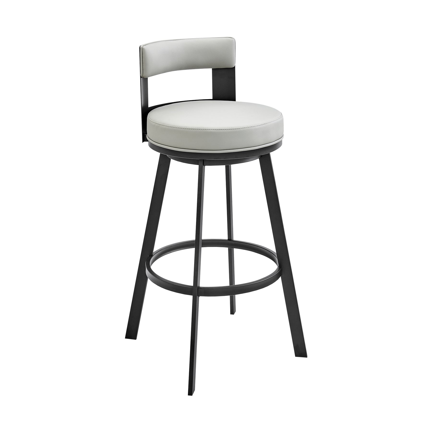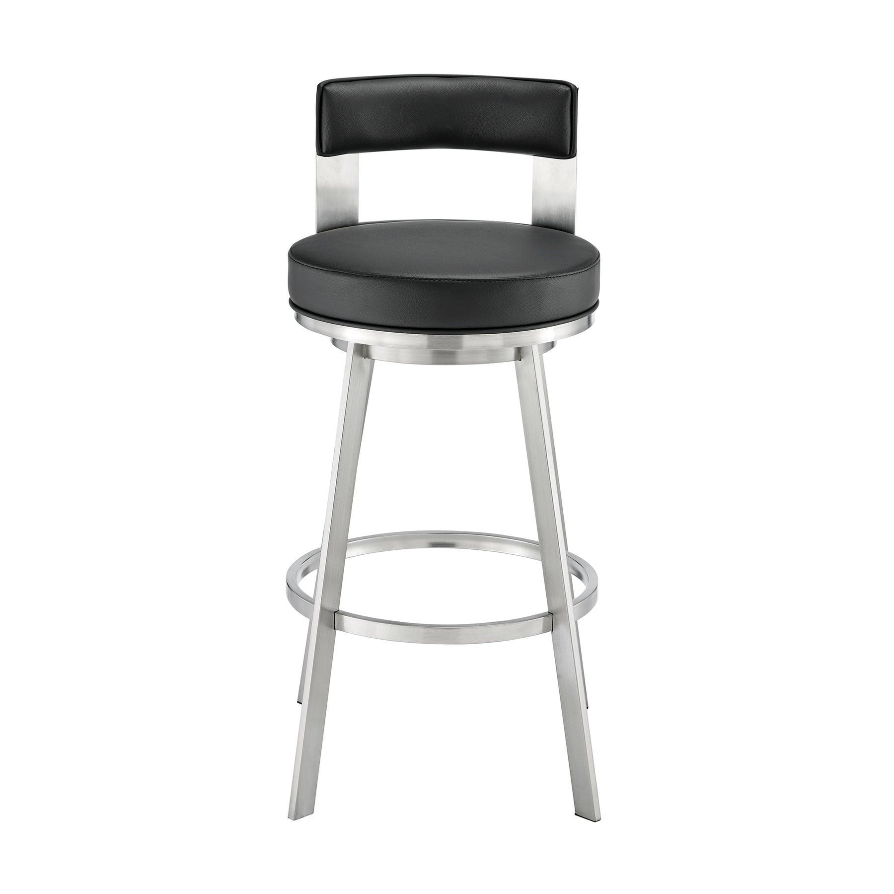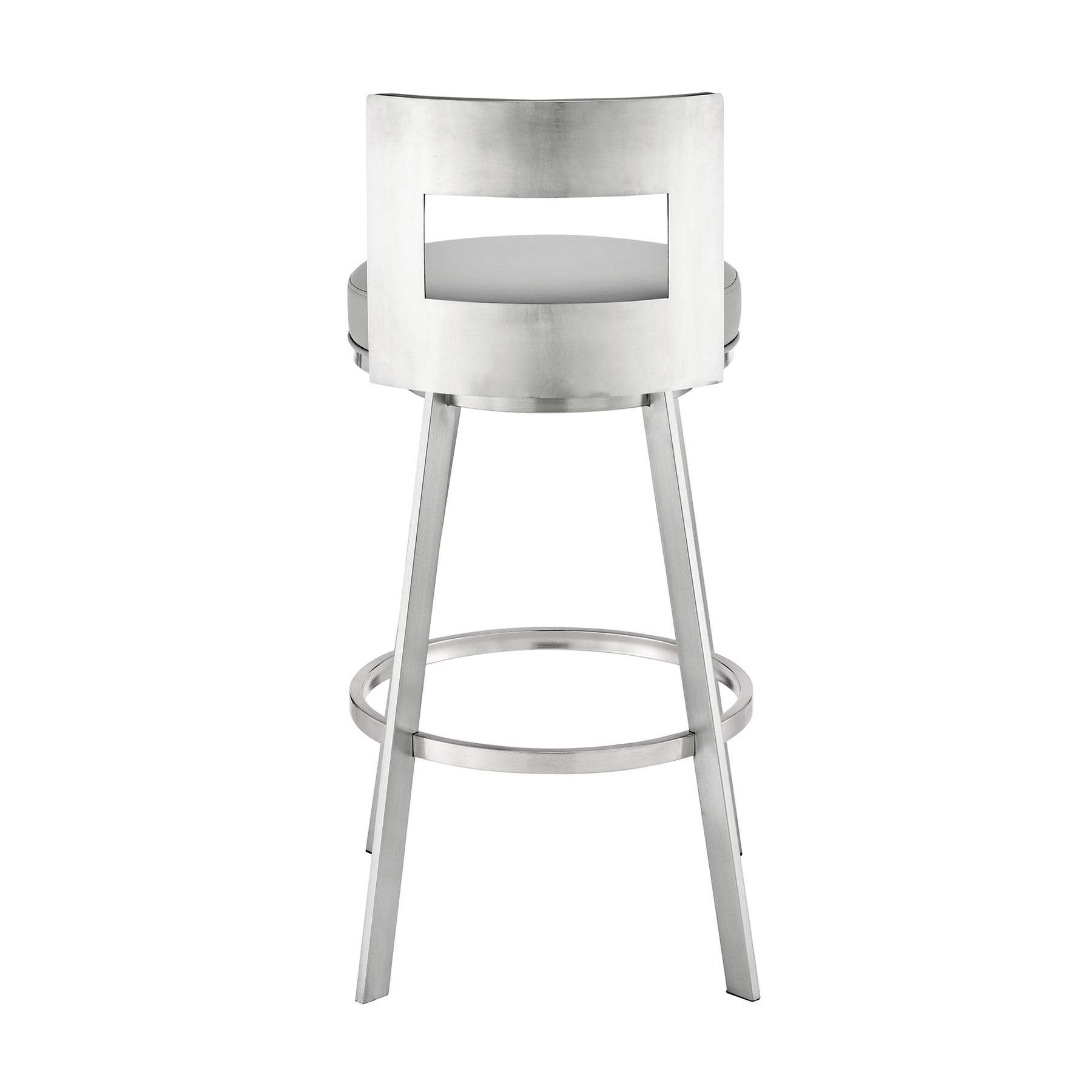 Modernize your home with the Flynn swivel bar or counter stool from Armen Living. The Flynn is available with a metal 4-leg base and features durable faux leather upholstery. Faux leather does not crack easily and is stain resistant, does not fade easily and is also UV resistant. Counter or bar height stools that feature a swivel mechanism tend to be much more convenient for everyday use or when entertaining. The wonderful full 360-degree swivel function allows for maximum mobility. The smooth glide swivel function allows you to change directions with ease, making this your new favorite seat in your home. This modern bar stool has an open back that creates a breathable seat, allowing you to sit comfortably for extended periods. Featuring a chic and streamlined profile, the modern counter stool features a subtly curved back. Complemented with a roomy round cushioned seat, our thoughtfully designed counter stool supports you in just the right places. The Flynn is available in a black finish with light grey faux leather, a brushed stainless-steel finish with black, white, or light grey faux leather, a brown finish with chocolate faux leather, or a silver with grey faux leather upholstery. This modern bar stool comes in your choice of 26-inch or 30-inch seat height options.