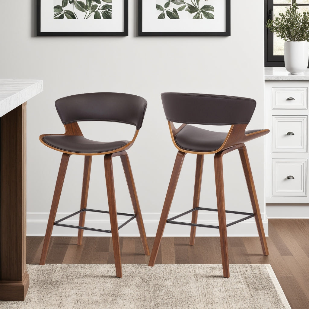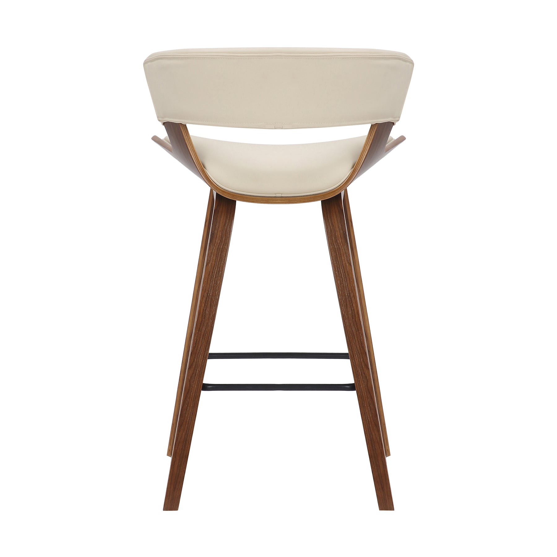 Add a work of art to your beautiful home with the Armen Living Jagger counter height bar stool. This features a mid-century modern aesthetic that can blend into any home decor, providing an inviting furniture piece for you and your guests. The smooth shape and clean lines of the Jagger are accompanied by soft, sleek faux leather upholstery. The Jagger counter stool is crafted with durable wood construction and incorporates a convenient square footrest for extra support. The Jagger is available in your choice of cream or brown faux leather with walnut wood finish or Gray faux leather with a black brushed wood finish.Product Dimensions