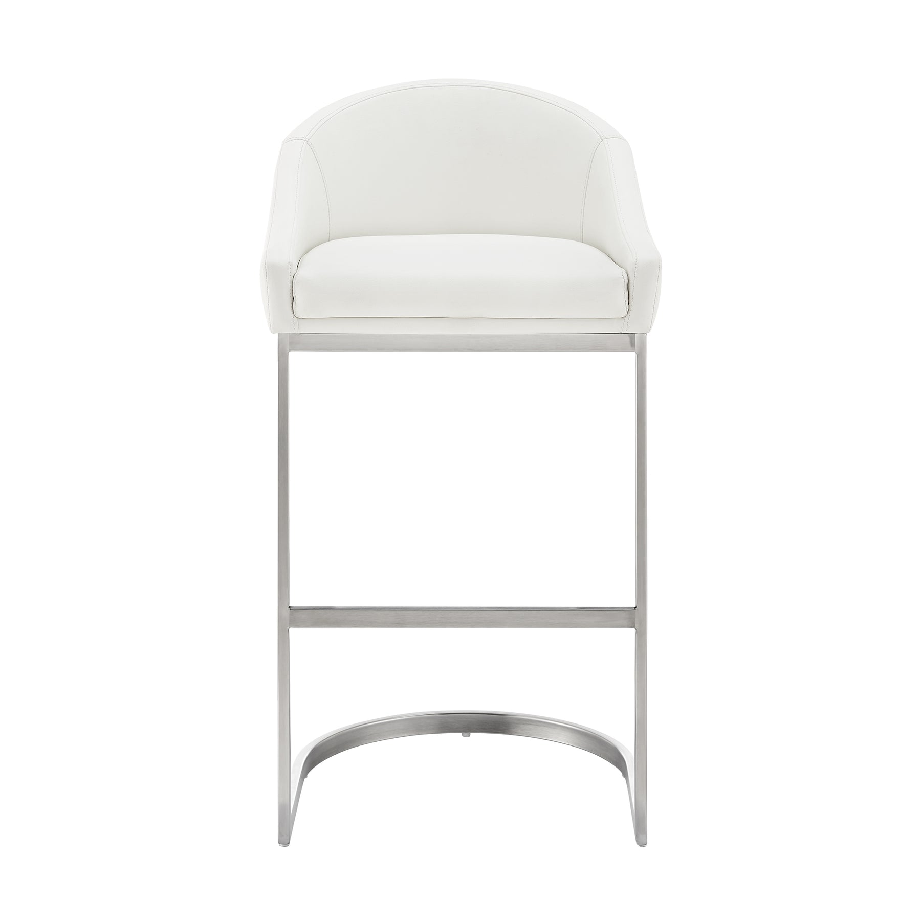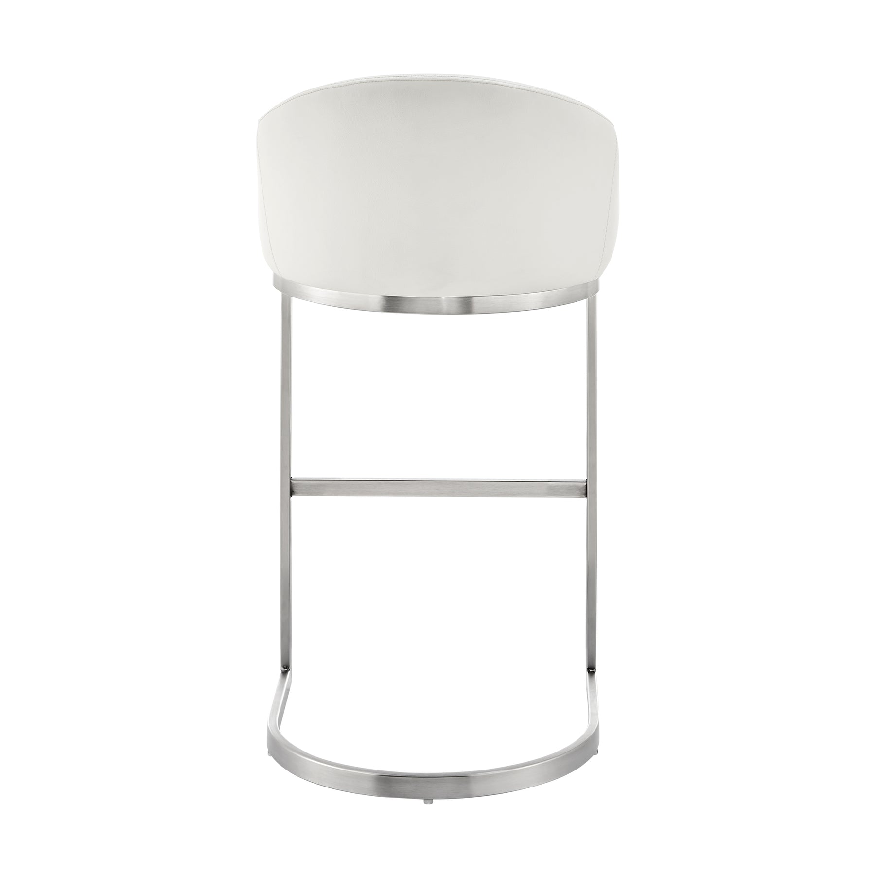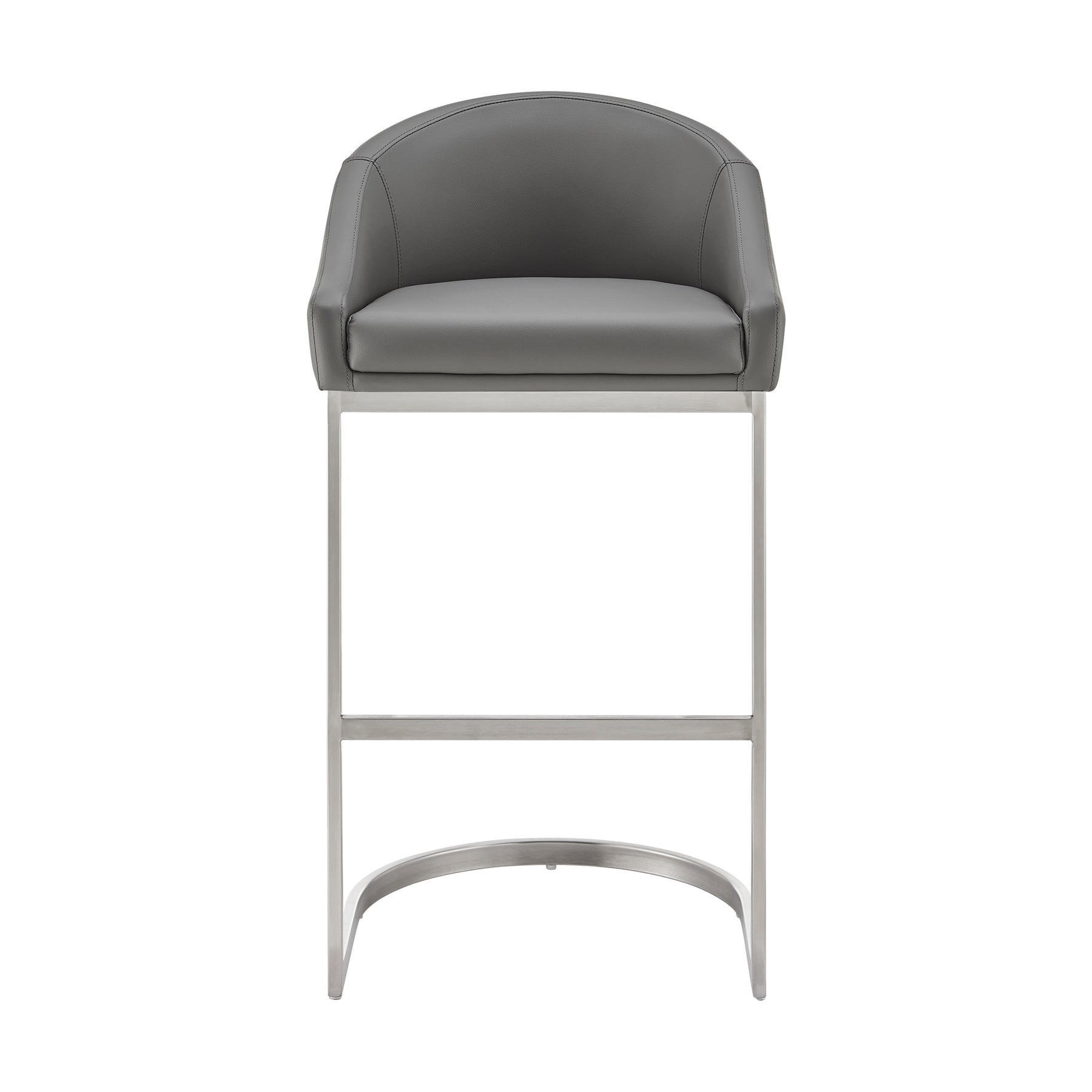 Give a chic and stylish update to your home or apartment with the Katherine Counter or Bar Height Stool in Faux Leather and Metal by Armen Living. This kitchen barstool incorporates a barrel style seat with a striking L-shaped cantilever base to achieve a minimal design that keeps the chair aloft, offers outstanding support, and delivers a contemporary silhouette. This metal bar stool is upholstered in faux leather. Faux leather does not crack easily and is stain resistant, does not fade easily and is also UV resistant. This modern bar stool is ideal for your kitchen island, pub table, home bar, or adjustable desk. Use universally in your home from your kitchen to your home office and allow its versatility to shine. The Katherine barstool is available in a counter or bar seat height and comes in a brushed stainless steel finish with black, grey, or white faux leather upholstery or a black finish with black or grey faux leather upholstery.Product Dimensions